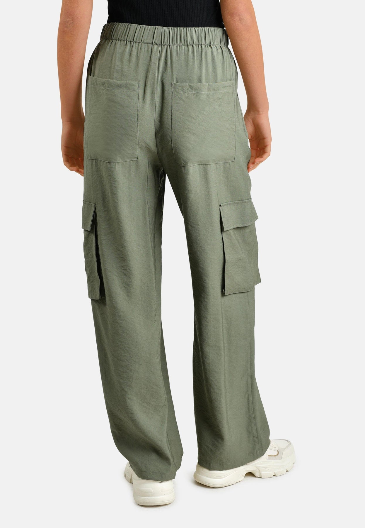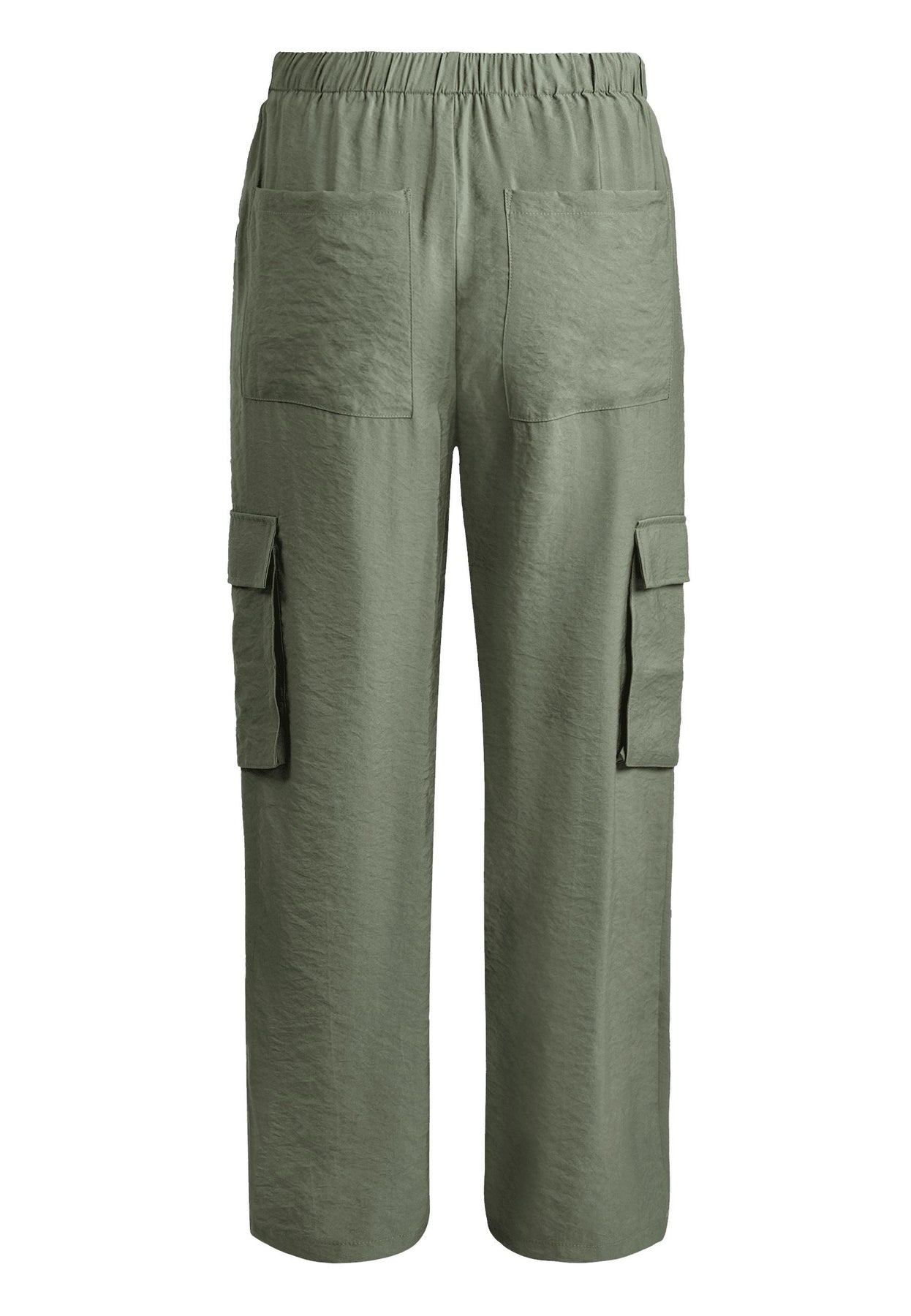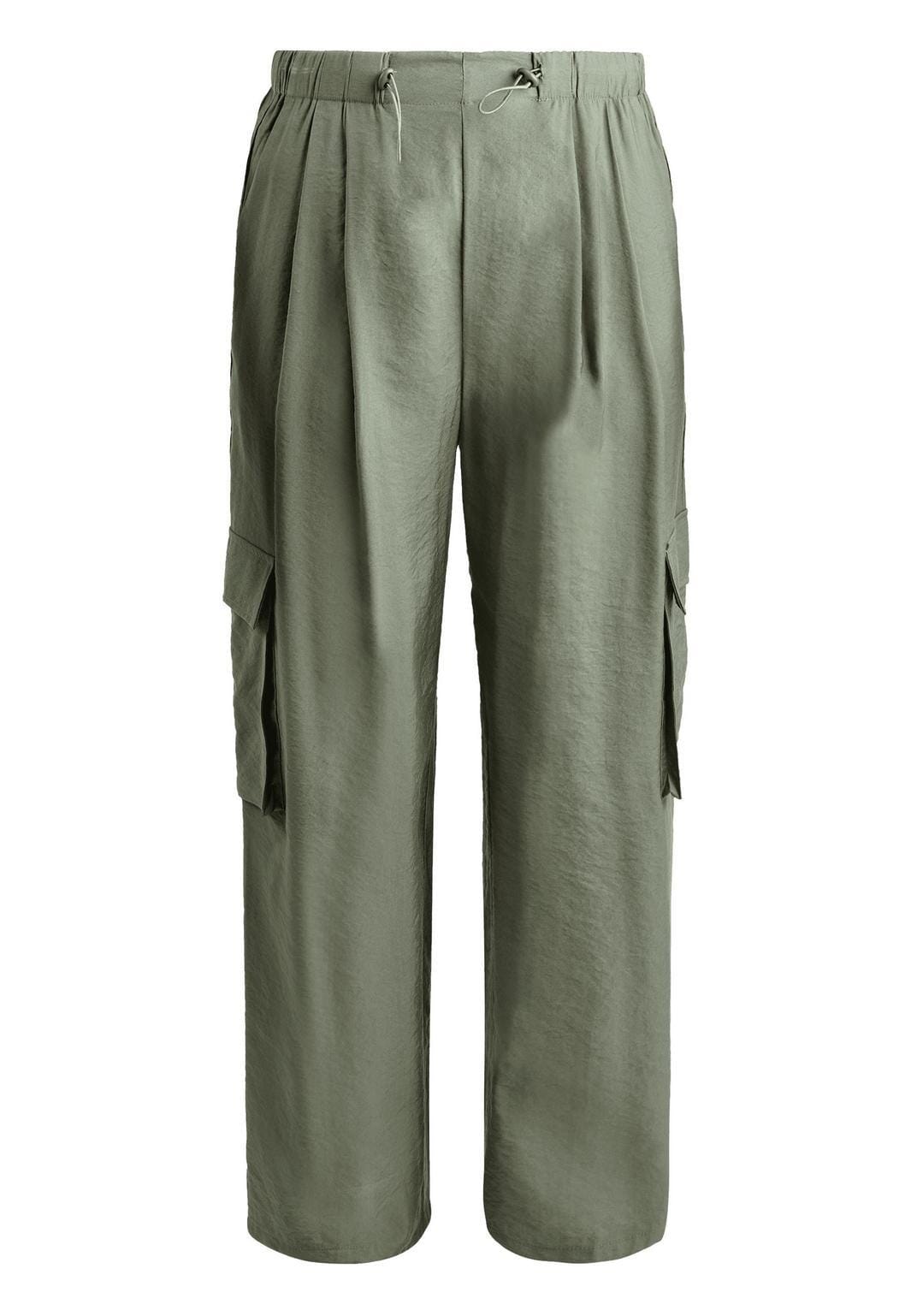 Enfärgade cargoinspirerade byxor med vida ben och en ficka på varje sida av byxbenet. Byxan har en hög midja med justerbar resår.