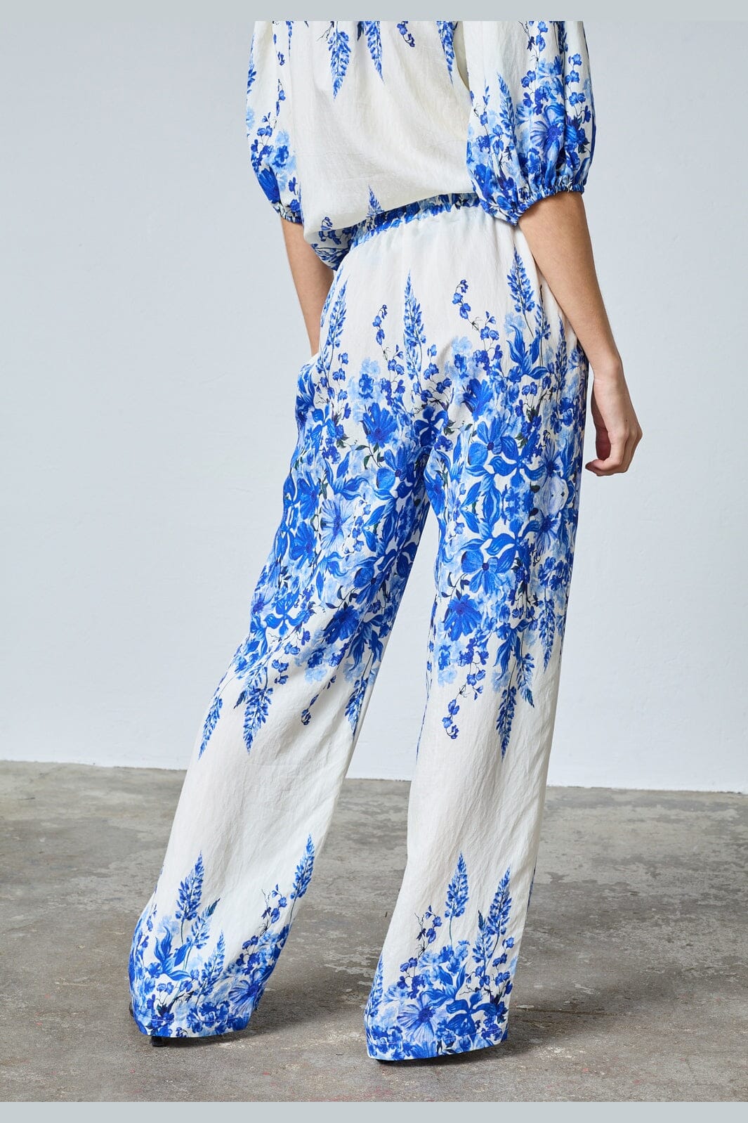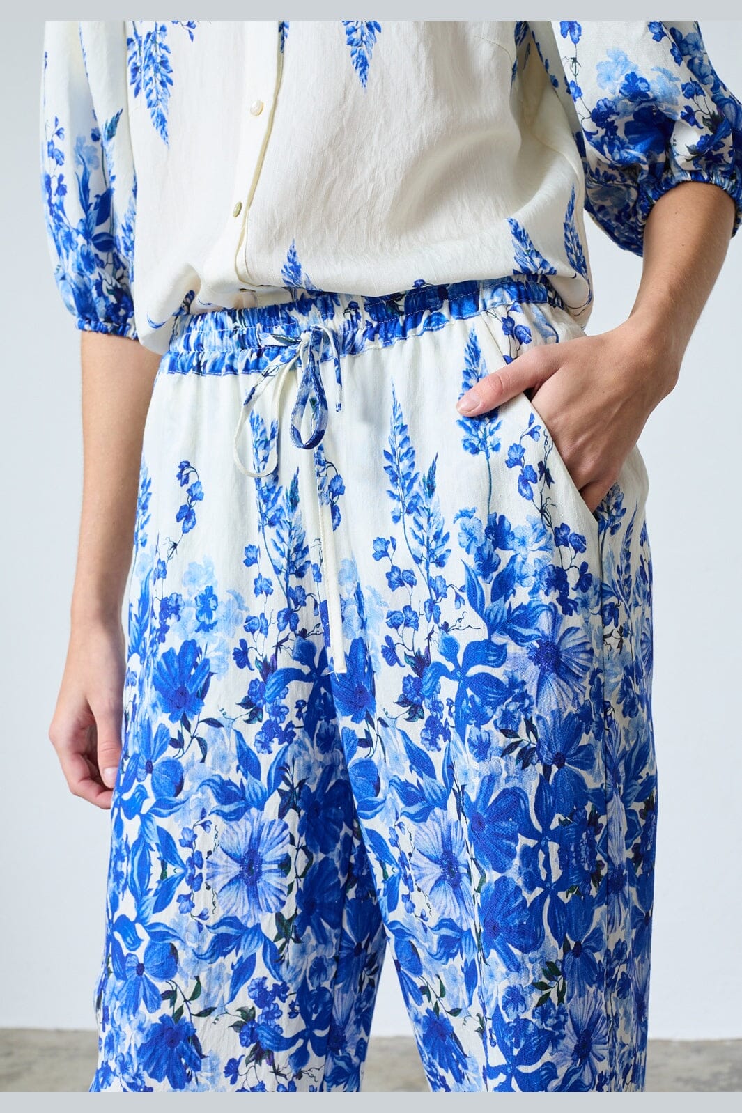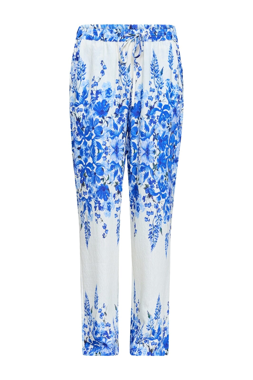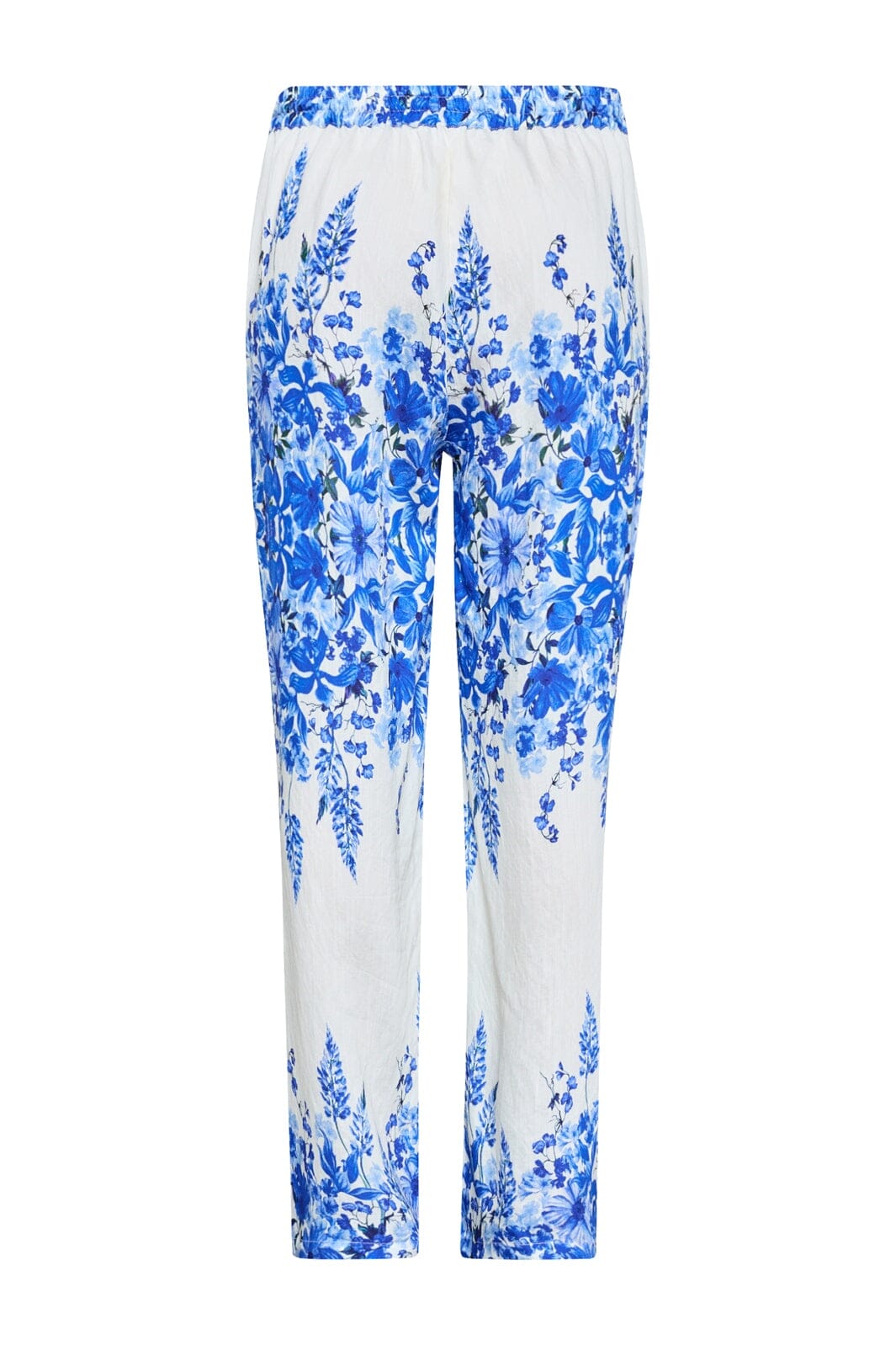 Byxor från Sisters Point med ett blått blommönster på vit bakgrund. Byxorna är gjorda av 80 % viskos och 20 % polyamid.