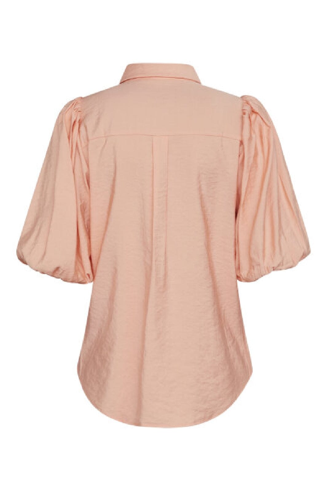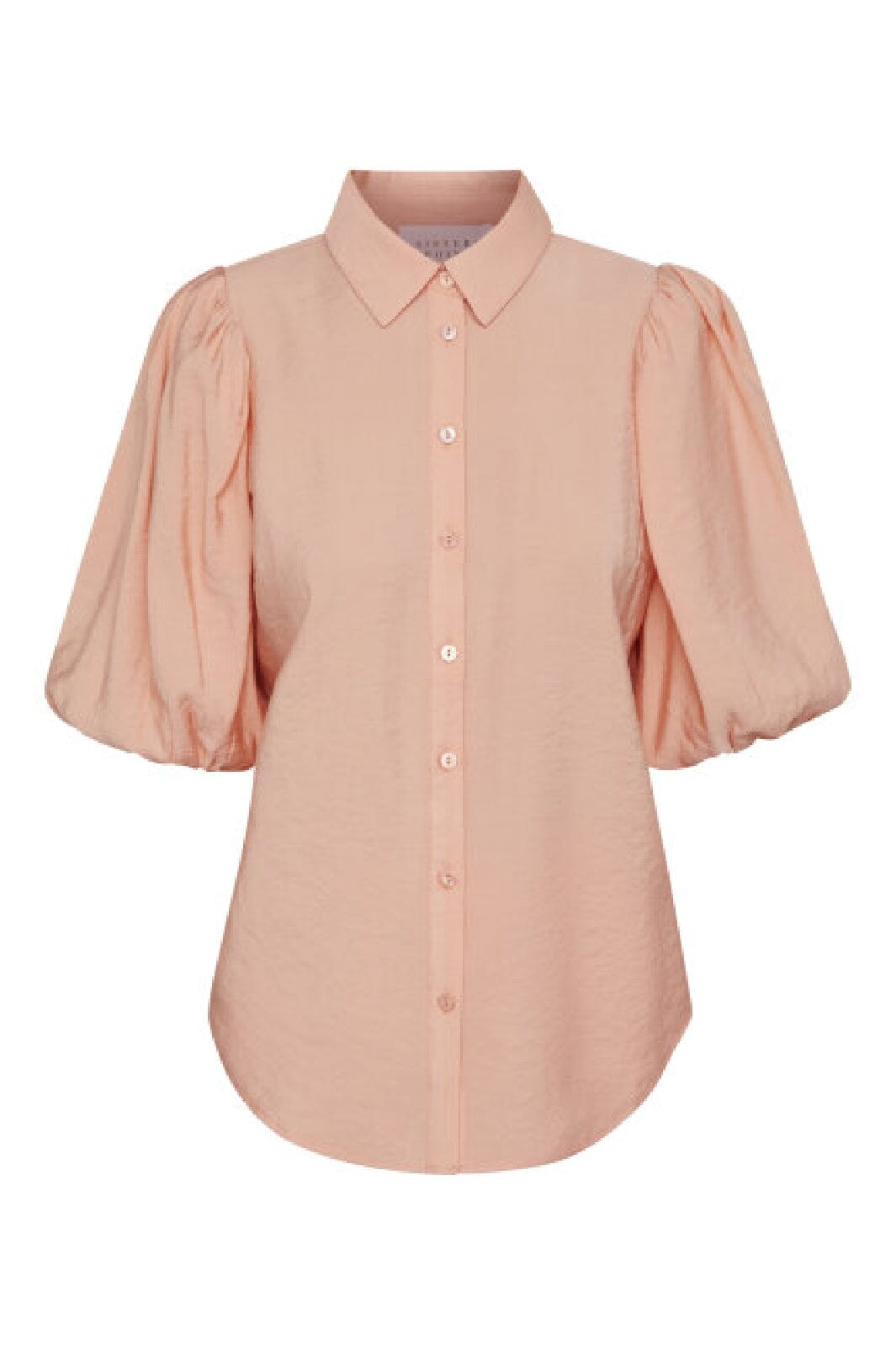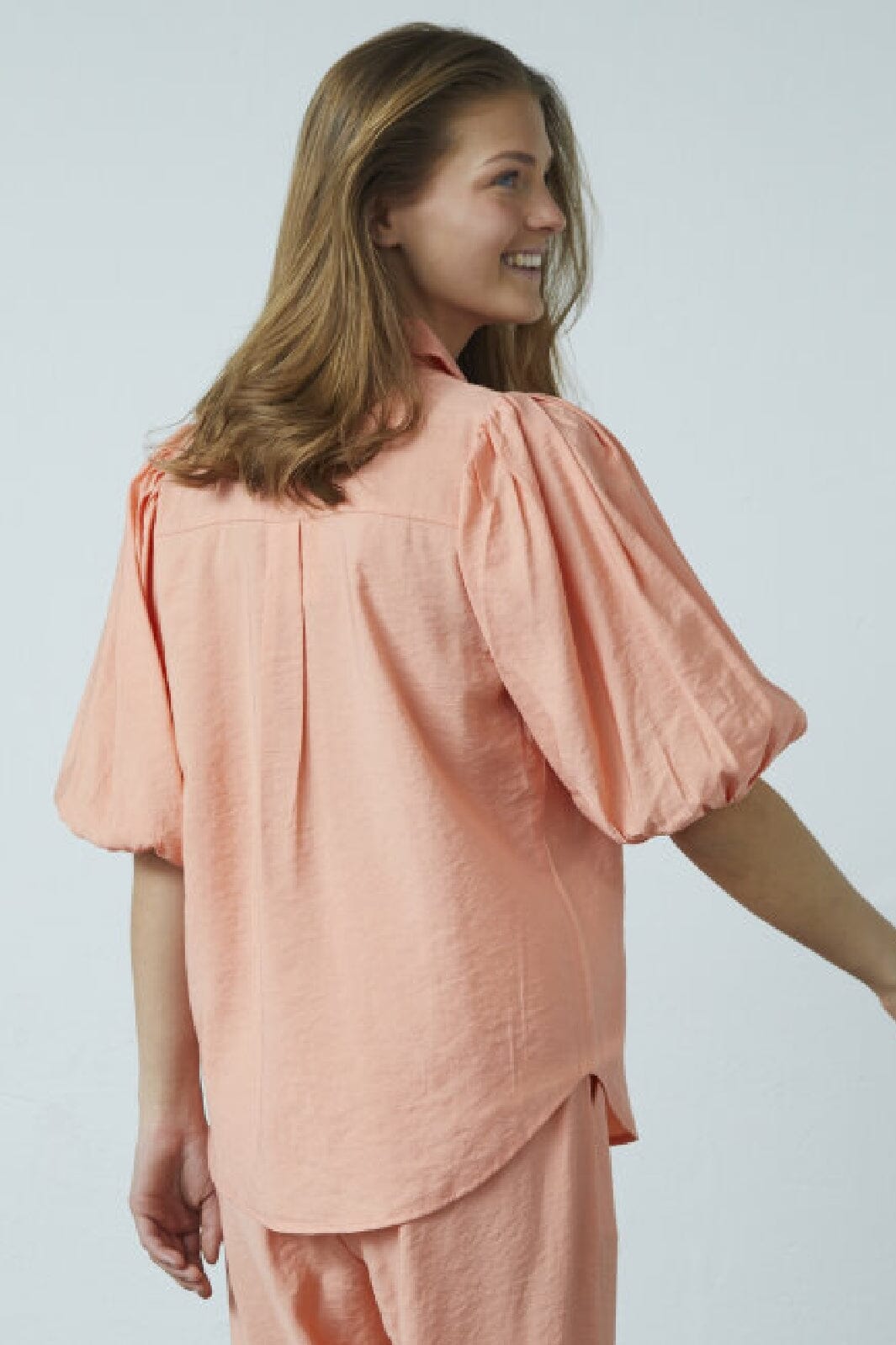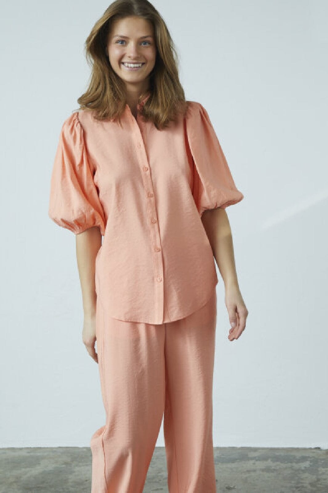 Koralfärgad skjorta från Sisters Point med trekvartslånga puffärmar och klassisk krage. Skjortan har knapplåsning fram och en normal passform.