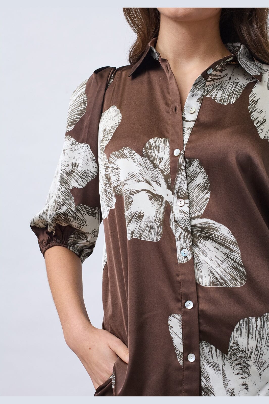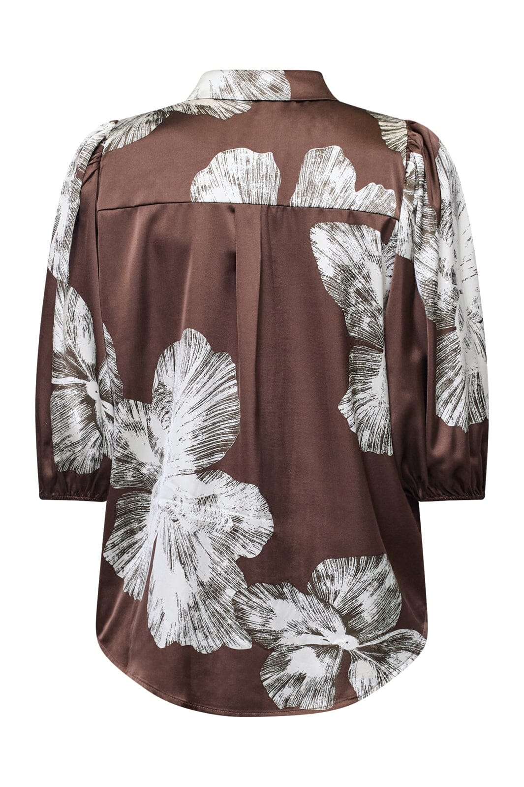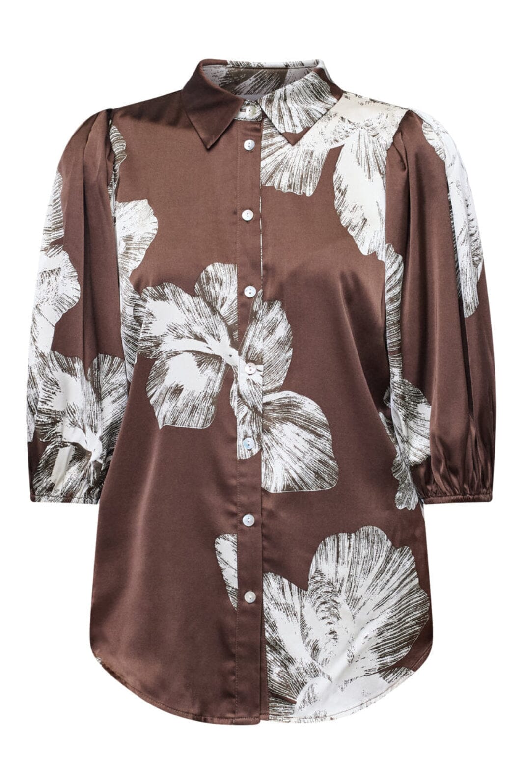 Skjorta från Sisters Point i brun satin med grafiskt blommönster i vita nyanser. Skjortan har klassisk krage och knappstängning.