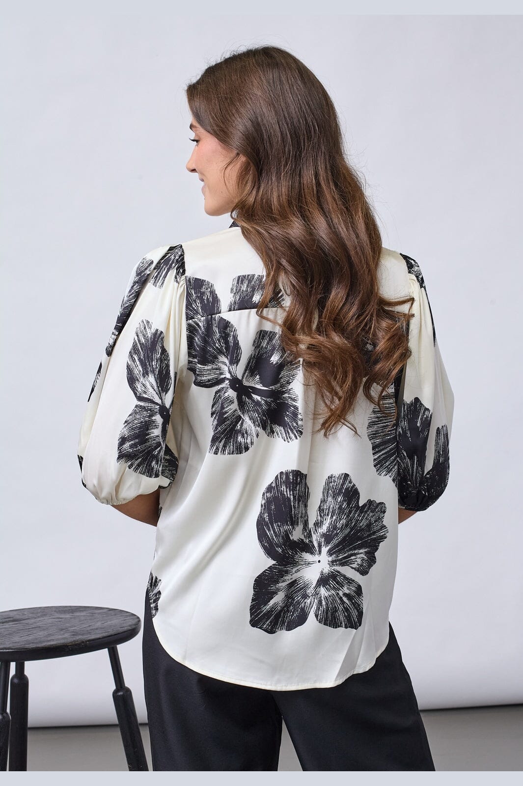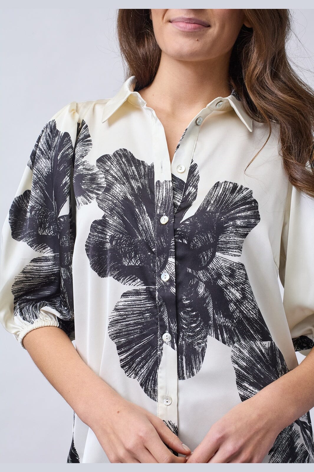 En satinskjorta från Sisters Point med grafiskt blommönster i svart på cremefärgad bakgrund. Skjortan har en lös passform.