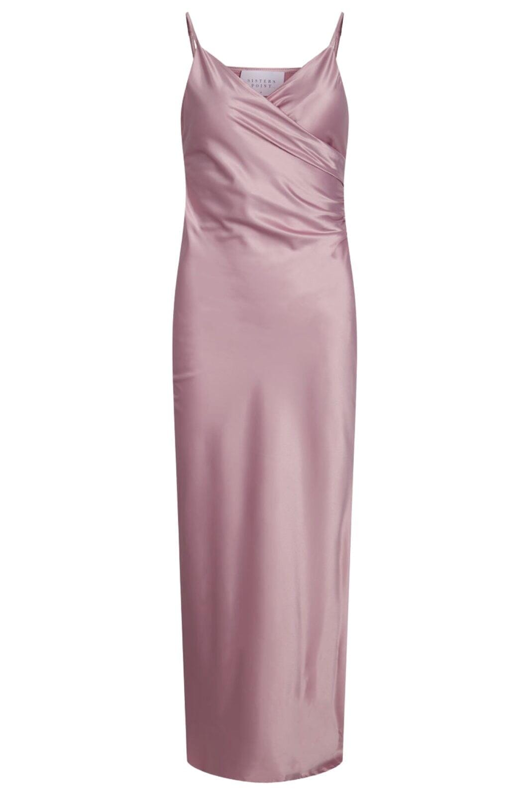 Rosa festklänning från Sisters Point med draperad v-ringning och tunna axelband. Klänningen har en kroppsnära passform och går ner till anklarna.
