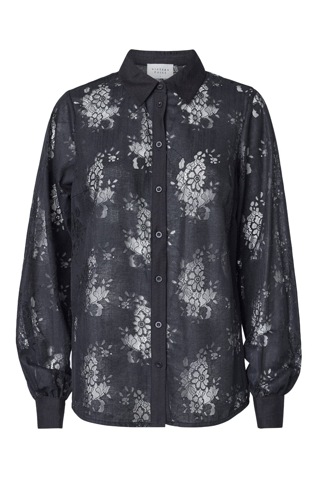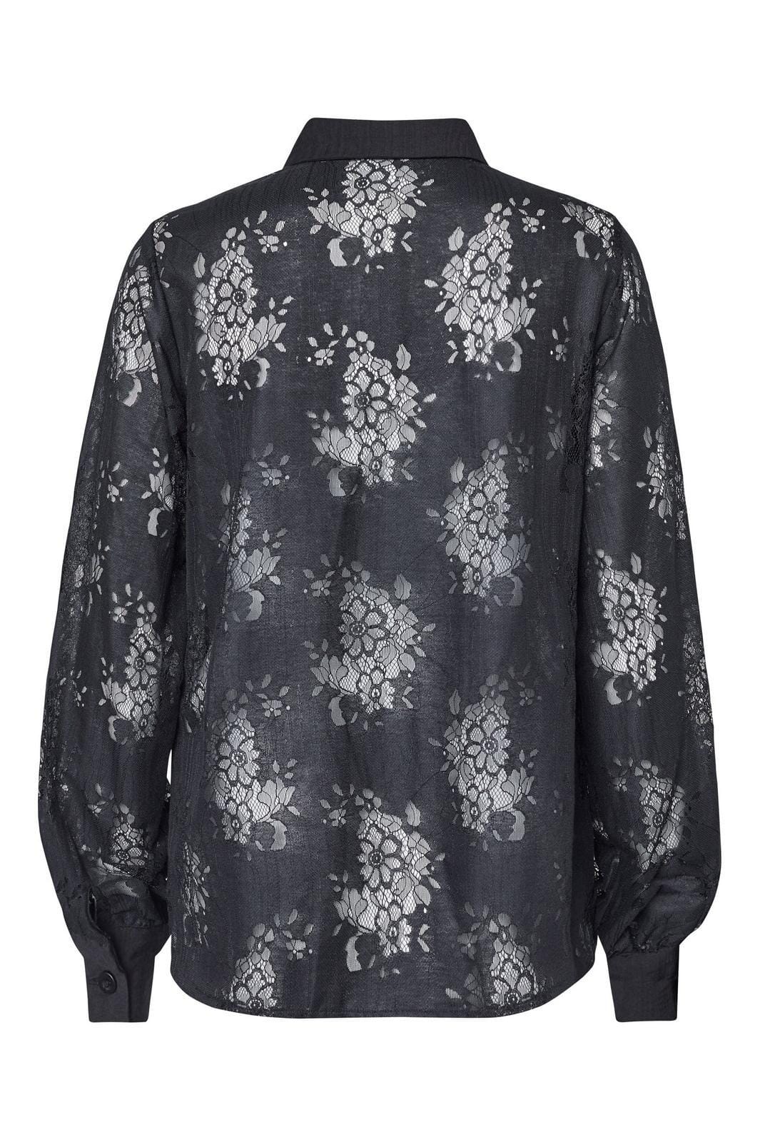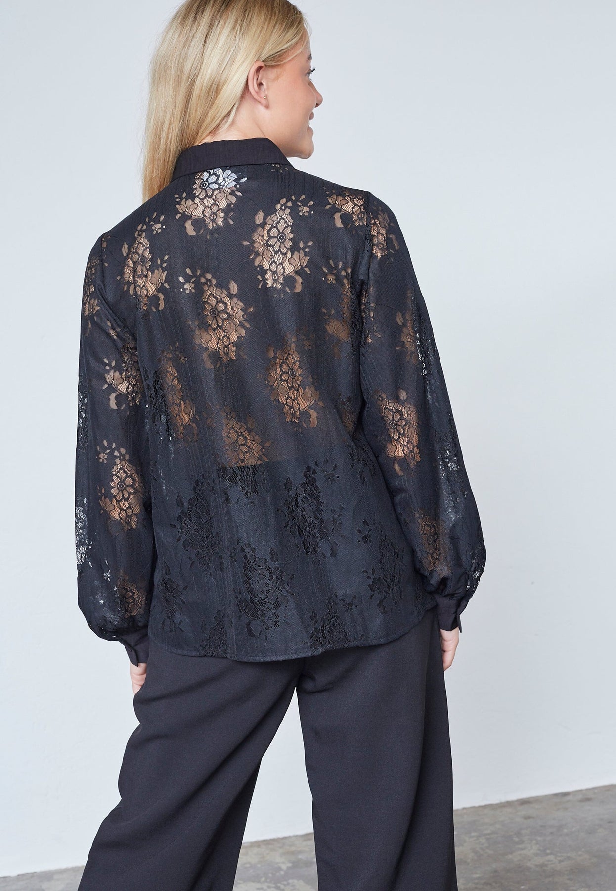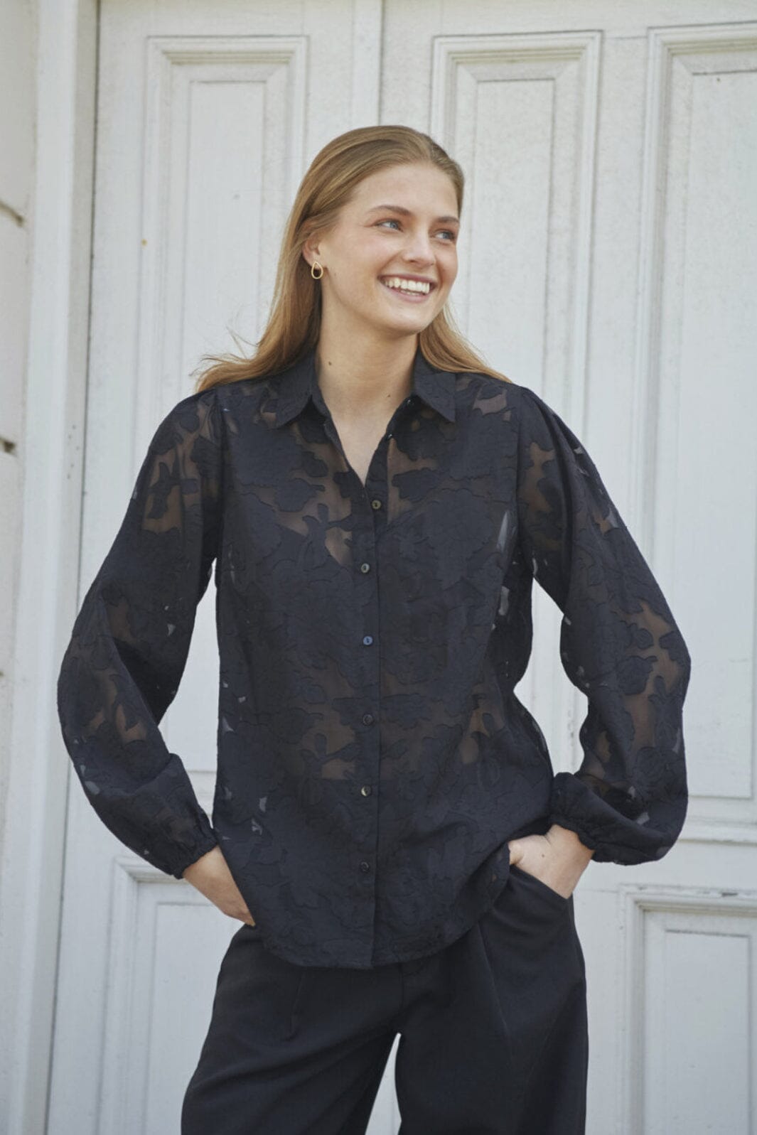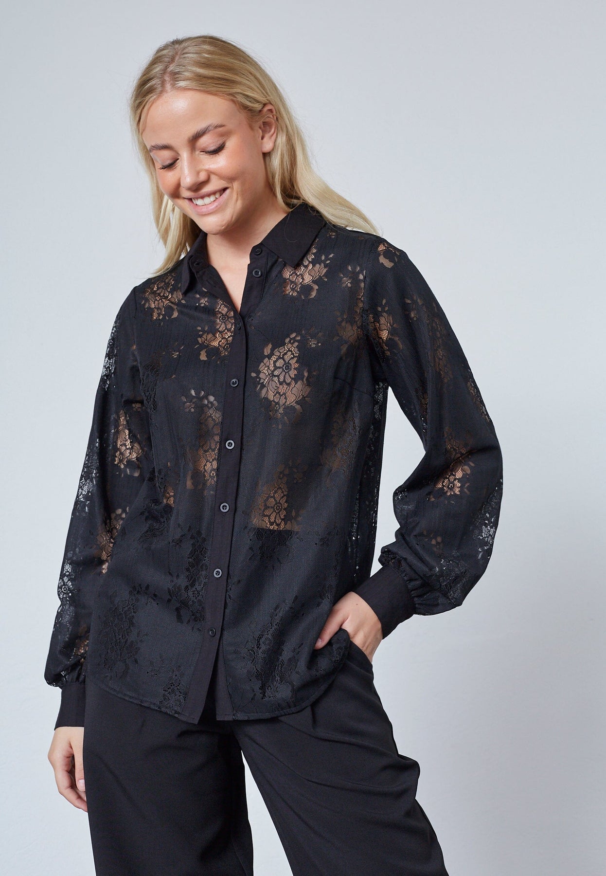 Svart skjorta från Sisters Point med genomskinligt blommönster i spets. Skjortan har en lös passform med klassisk krage och knapplåsning fram. De långa ärmarna avslutas med manschetter.