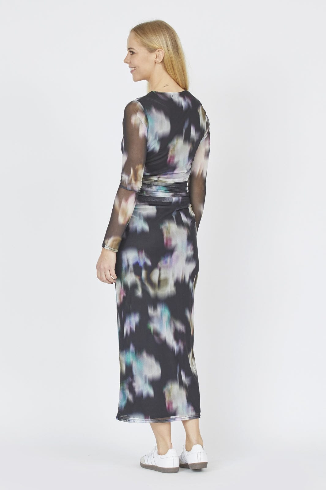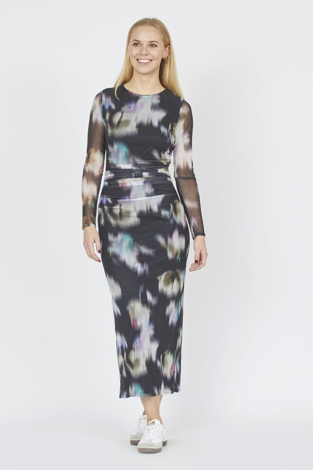 Långärmad klänning från Sisters Point med digitalt tryck i dämpade färger och blommönster. Klänningen har rynkdetaljer vid midjan och går till mitten av vaden.