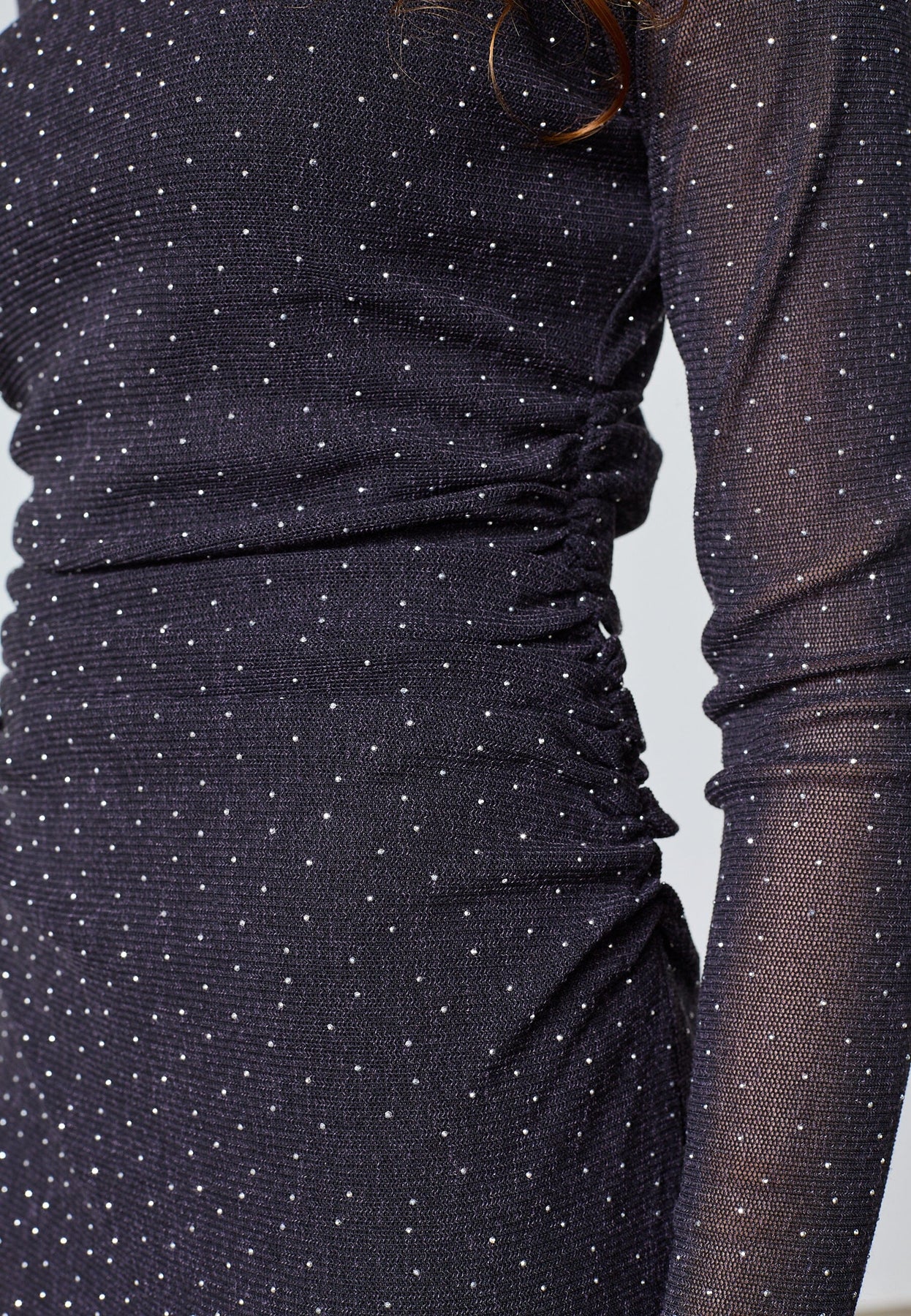 Svart klänning från Sisters Point med silverfärgade prickar. Den har långa ärmar och rund halsringning. Klänningen går till mitten av vaden och har rynkdetaljer på sidorna.