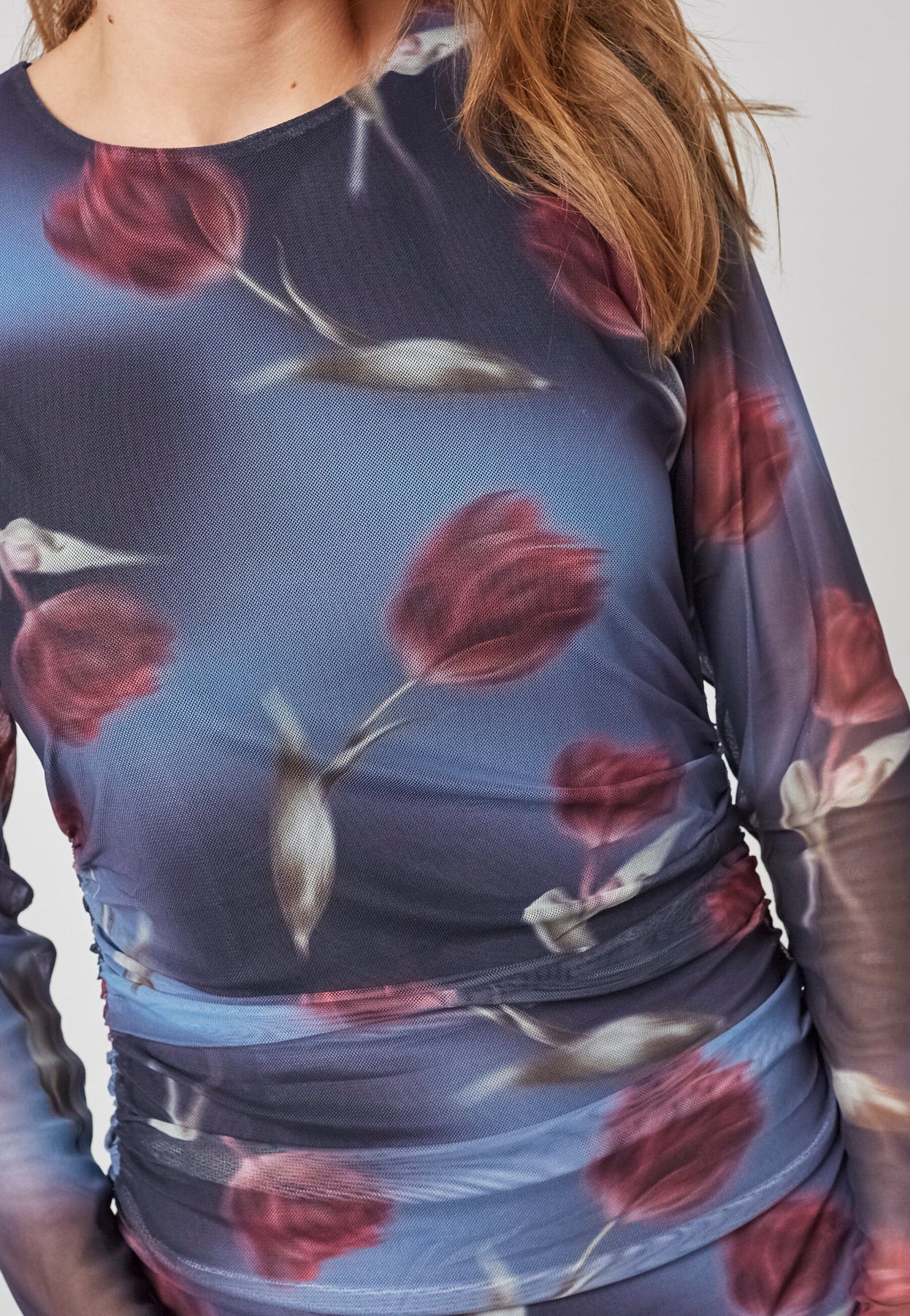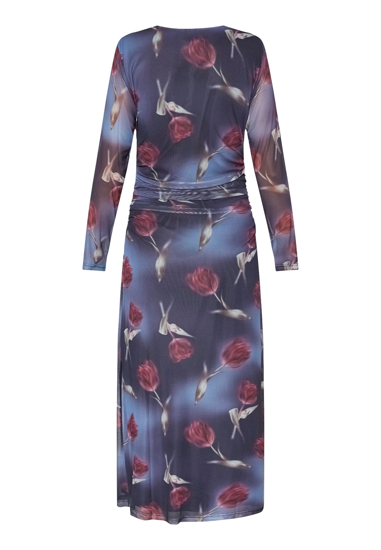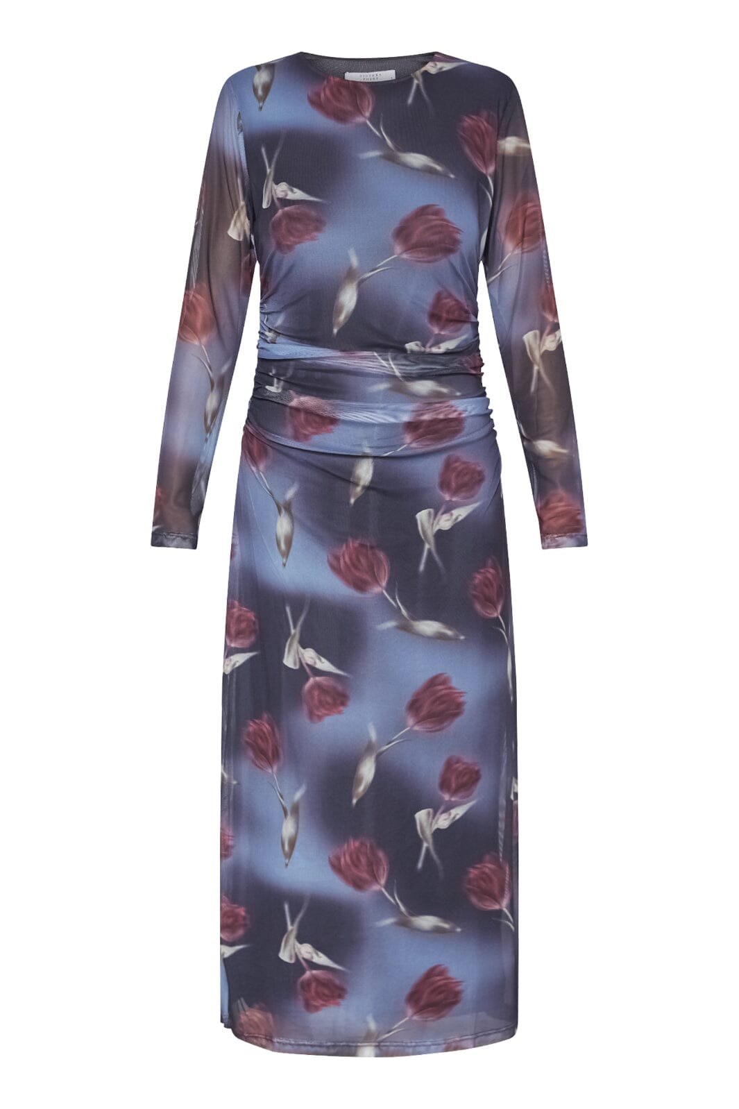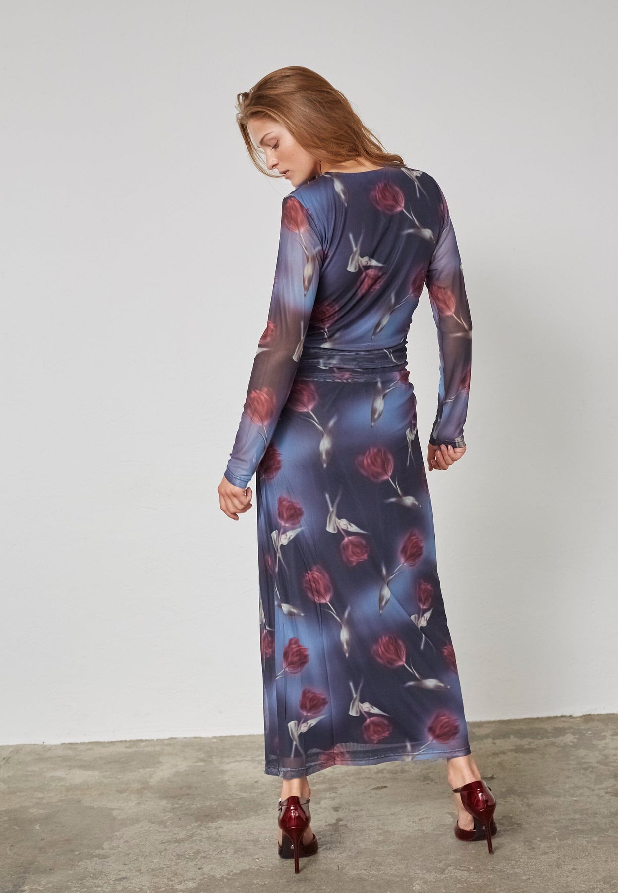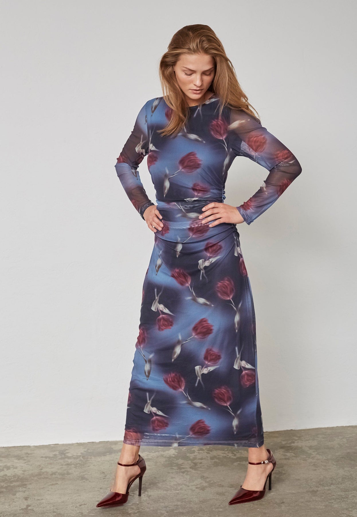 Långärmad klänning från Sisters Point med ett blommönster i bordeaux, rött, lila och blått. Klänningen har en smal passform och går till anklarna.
