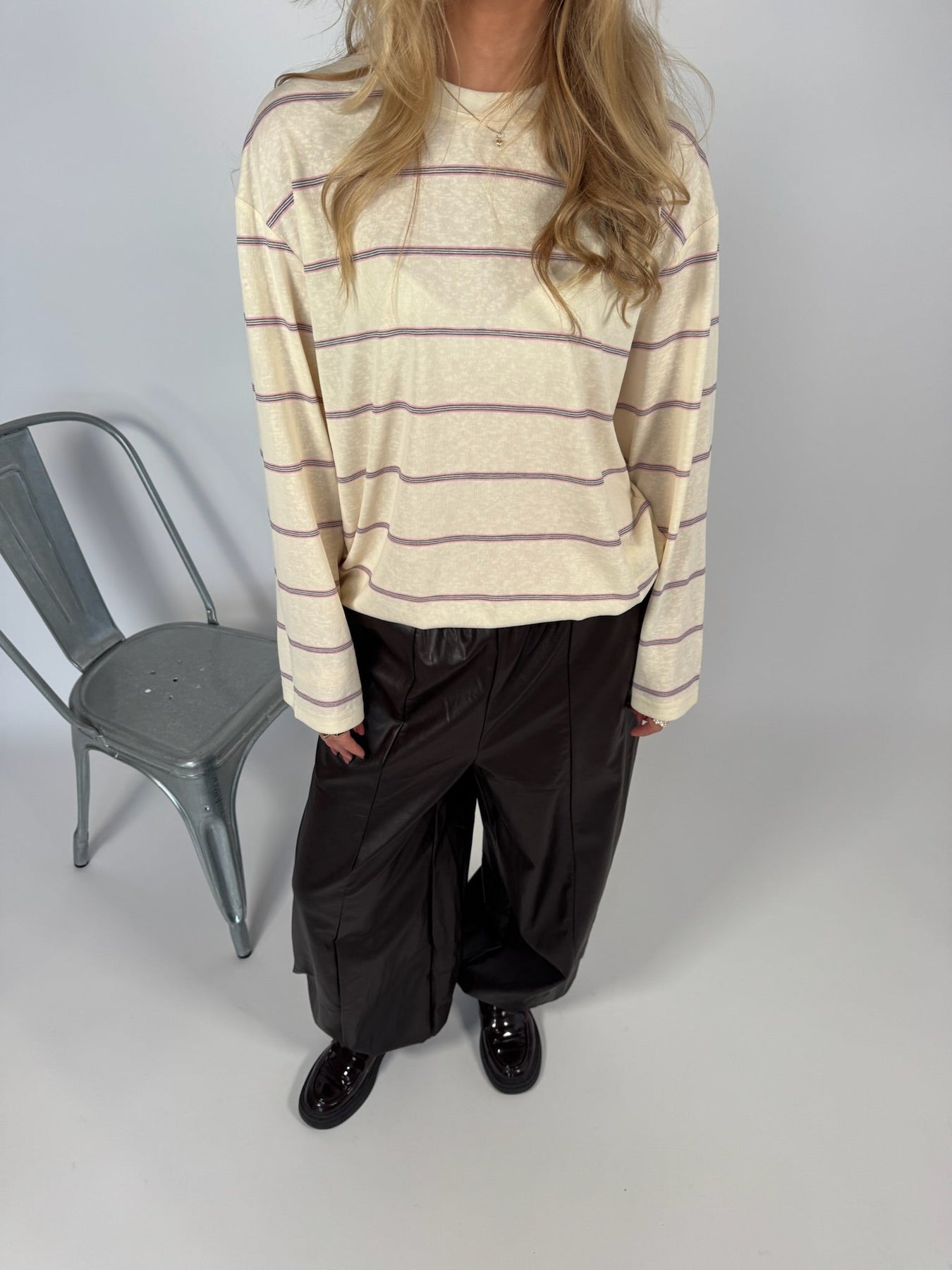 Crèmefärgad randig blus från Sisters Point. Blusen har en avslappnad passform med långa ärmar och en klassisk rund halsringning.