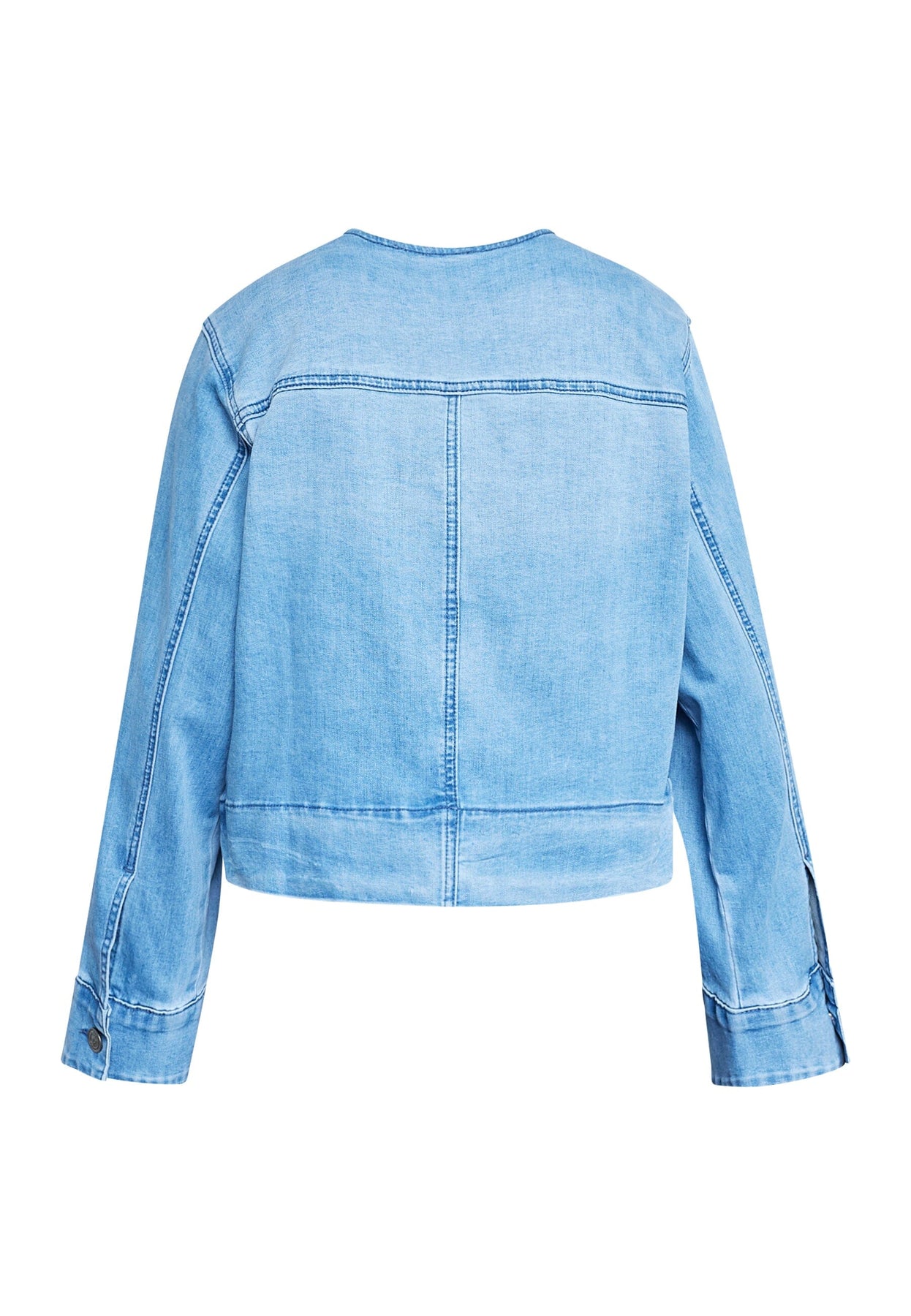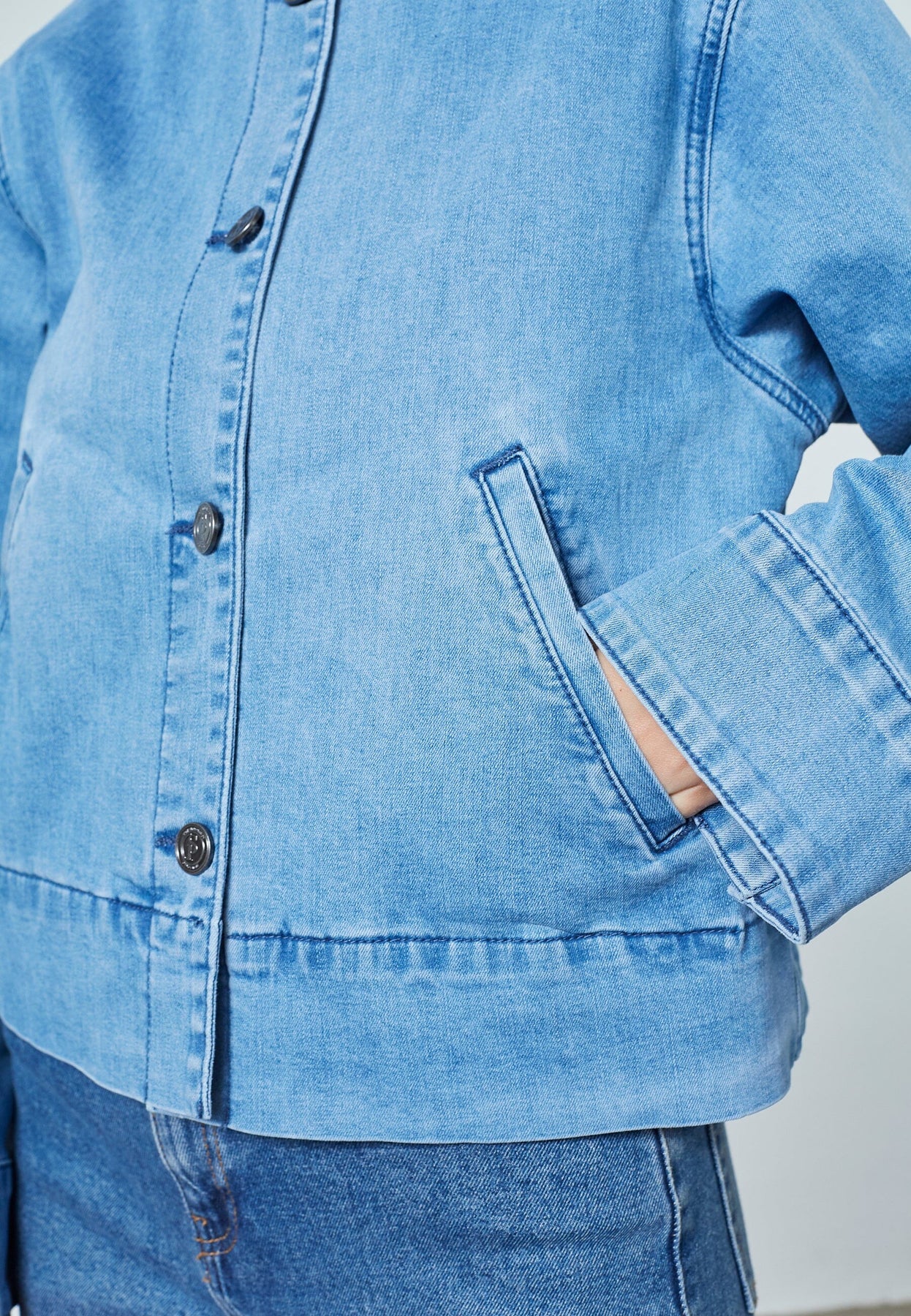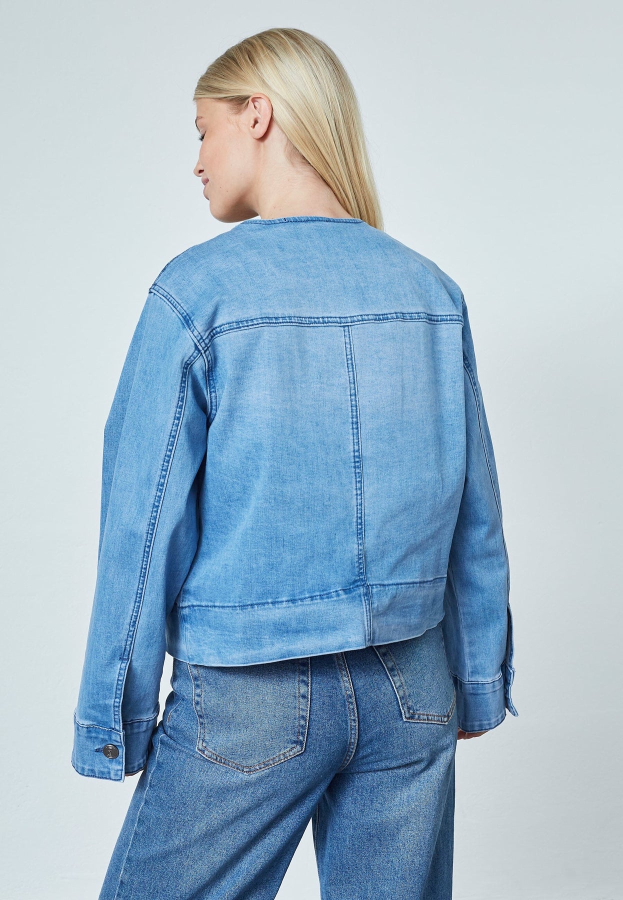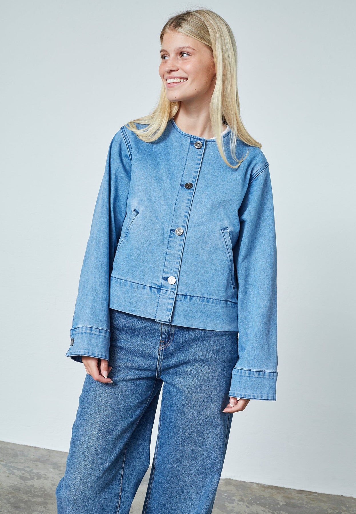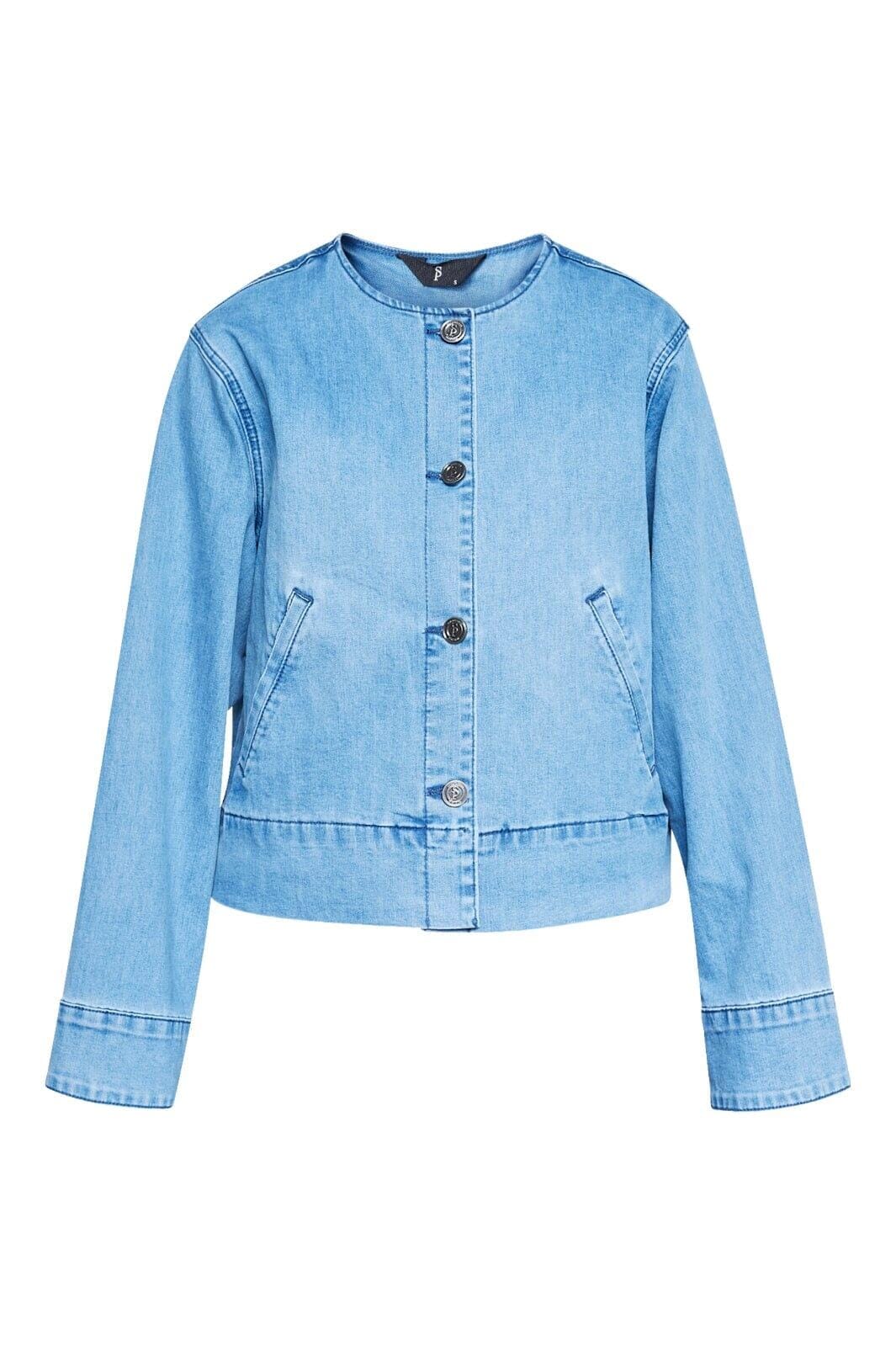 Denimjacka från Sisters Point i en ljusblå nyans. Jackan har en rund halsringning och knäppning framtill med snedställda fickor.