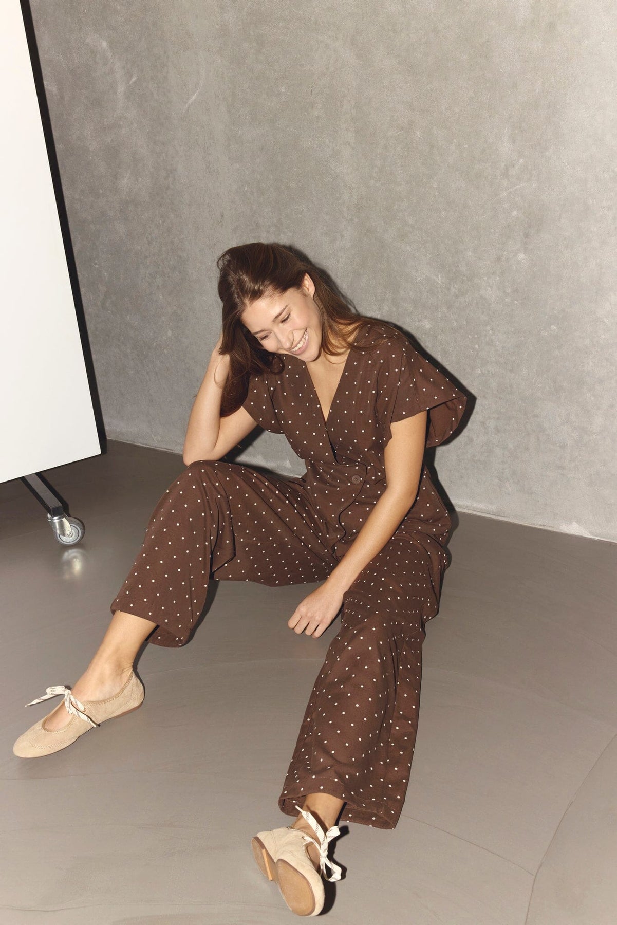 Bruna byxor från Sisters Point med vita prickar. Byxorna har hög midja och en lös passform som går till anklarna.
