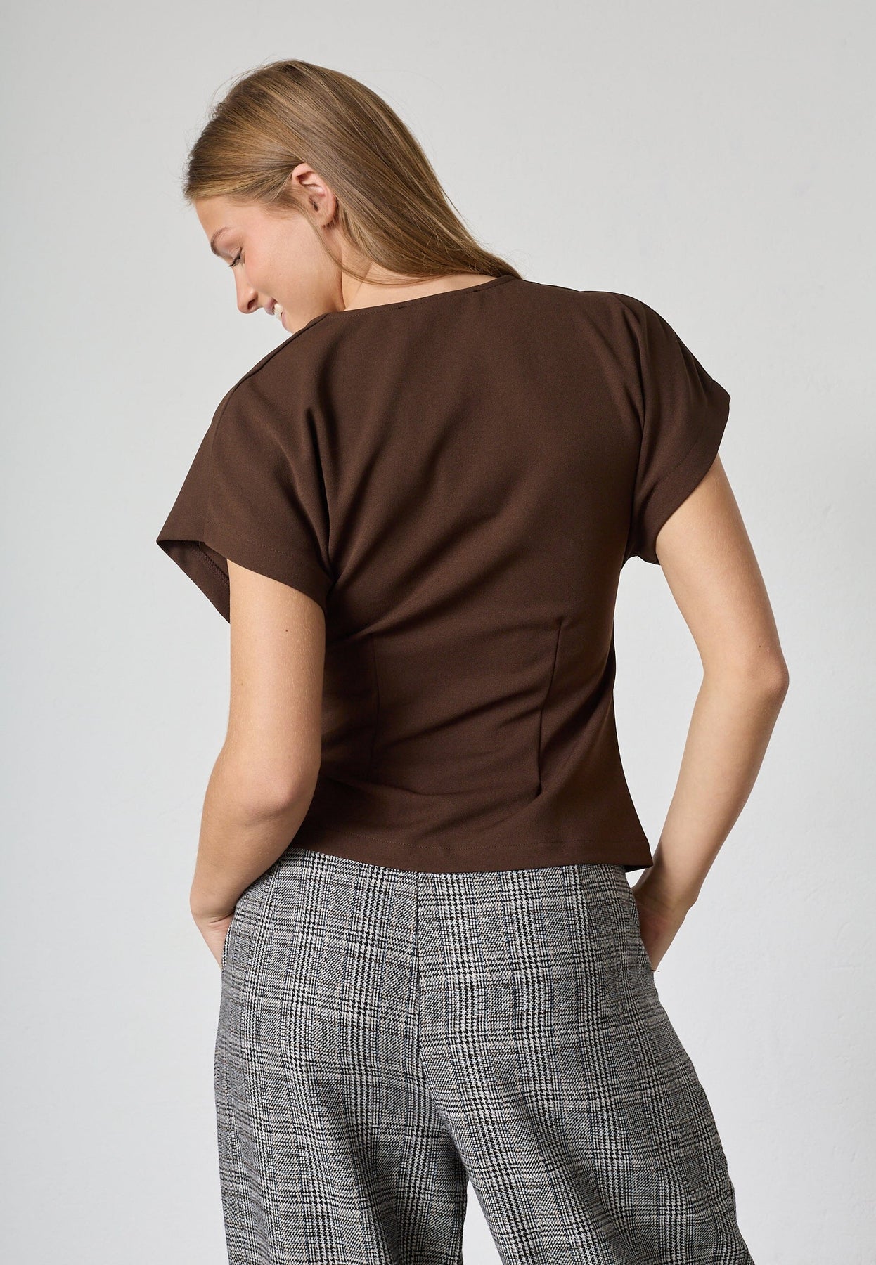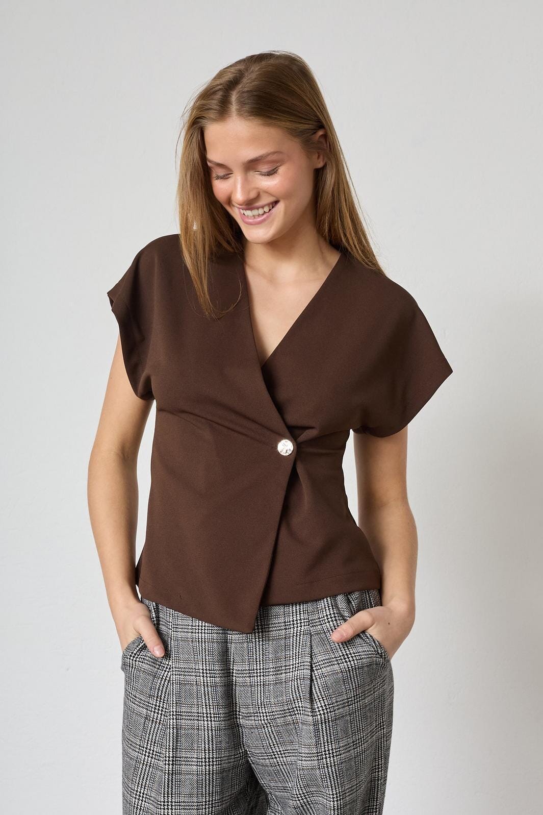 Mörkbrun topp från Sisters Point med slå-om-design och korta ärmar. Toppen har en djup v-ringning och en dekorativ guldknapp på sidan.