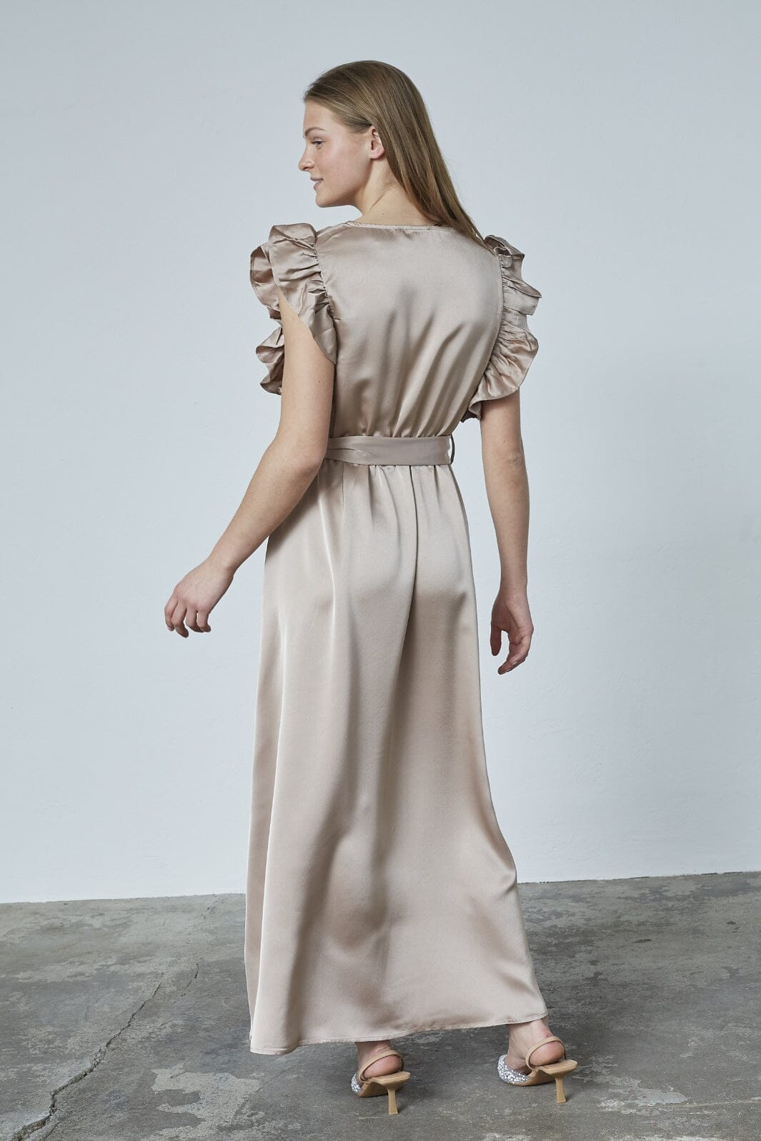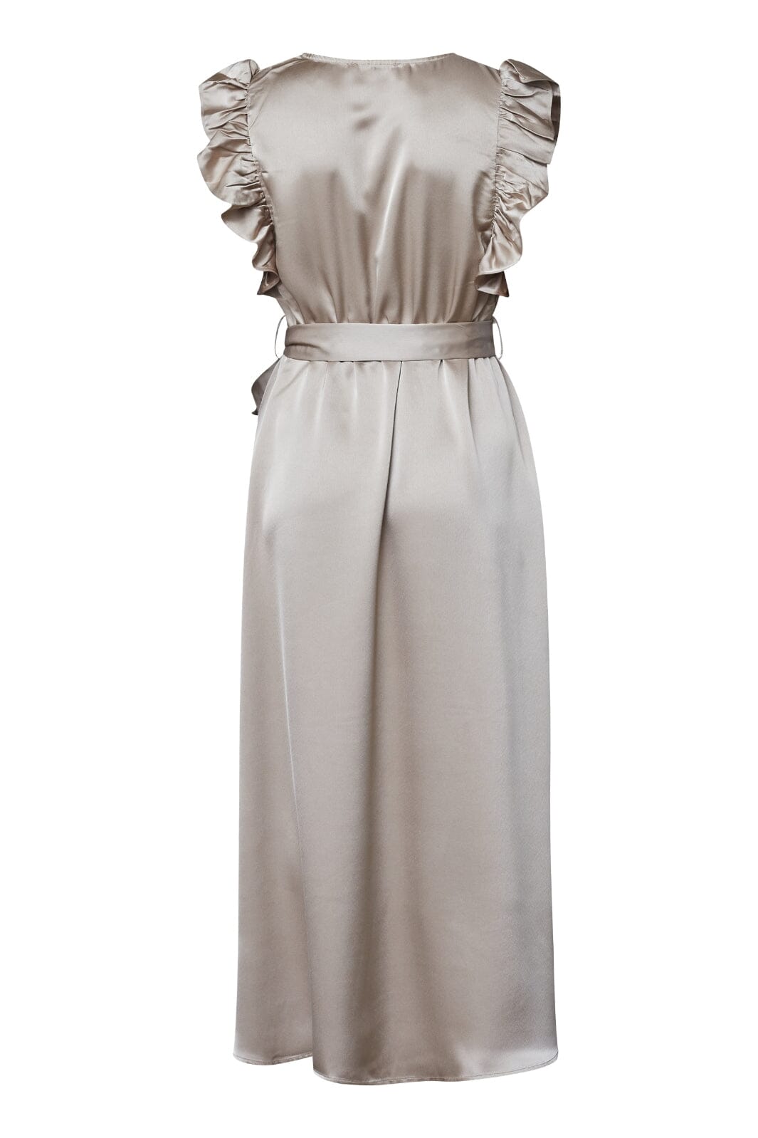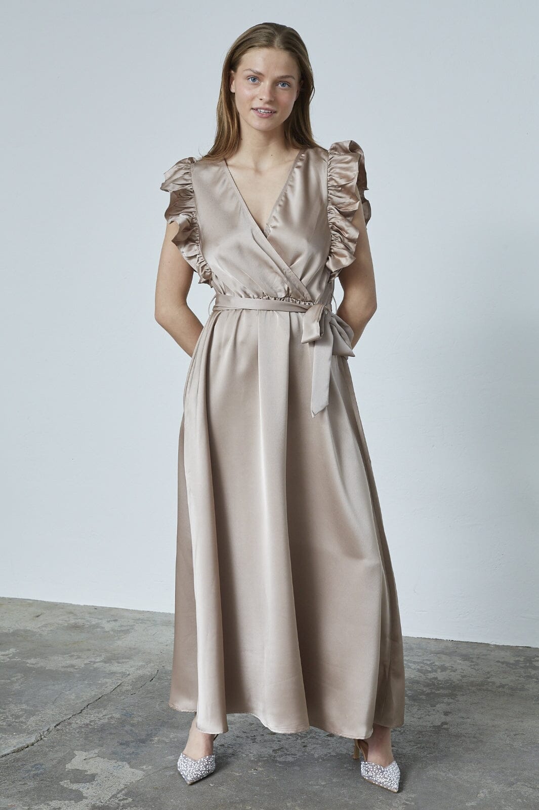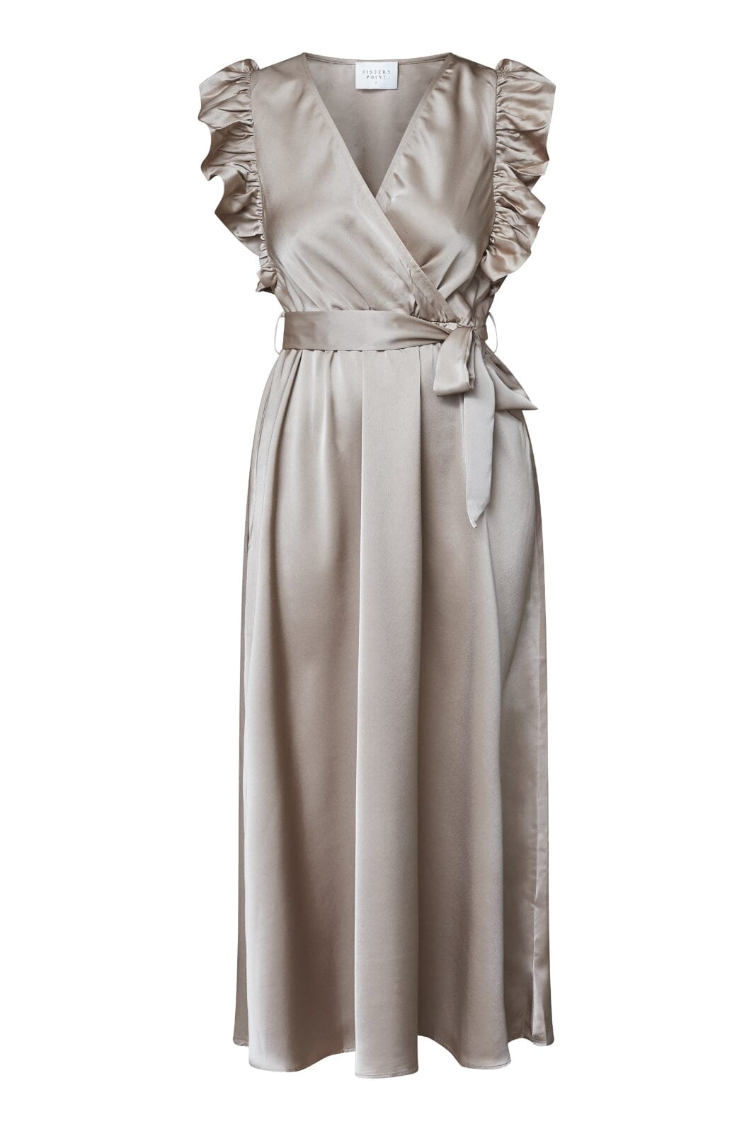 Omslagsklänning från Sisters Point i Dusty Stone. Klänningen har V-ringning, rynkade ärmar med volanger och ett midjebälte som kan knytas.