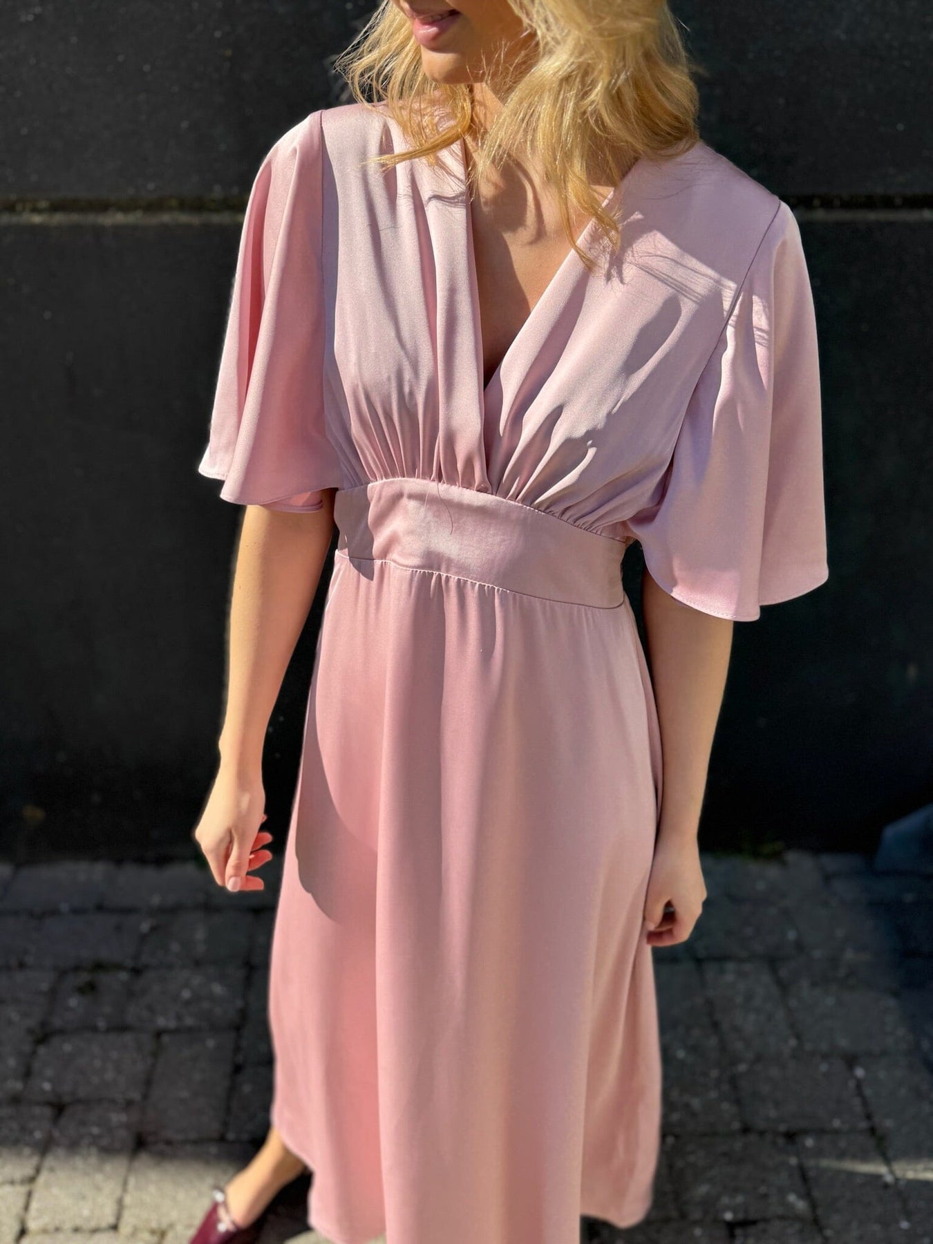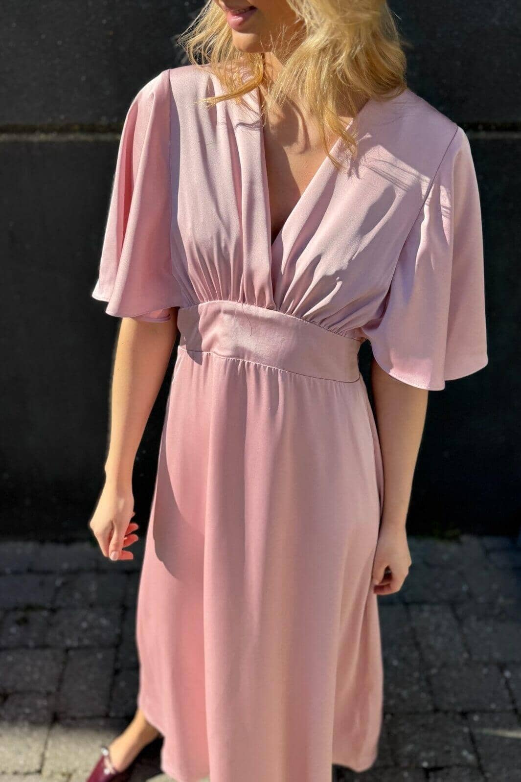 Rosa klänning från Sisters Point med v-ringning och smock på ryggen. Klänningen har breda 3/4-ärmar och volangdetaljer som ger den ett feminint uttryck.