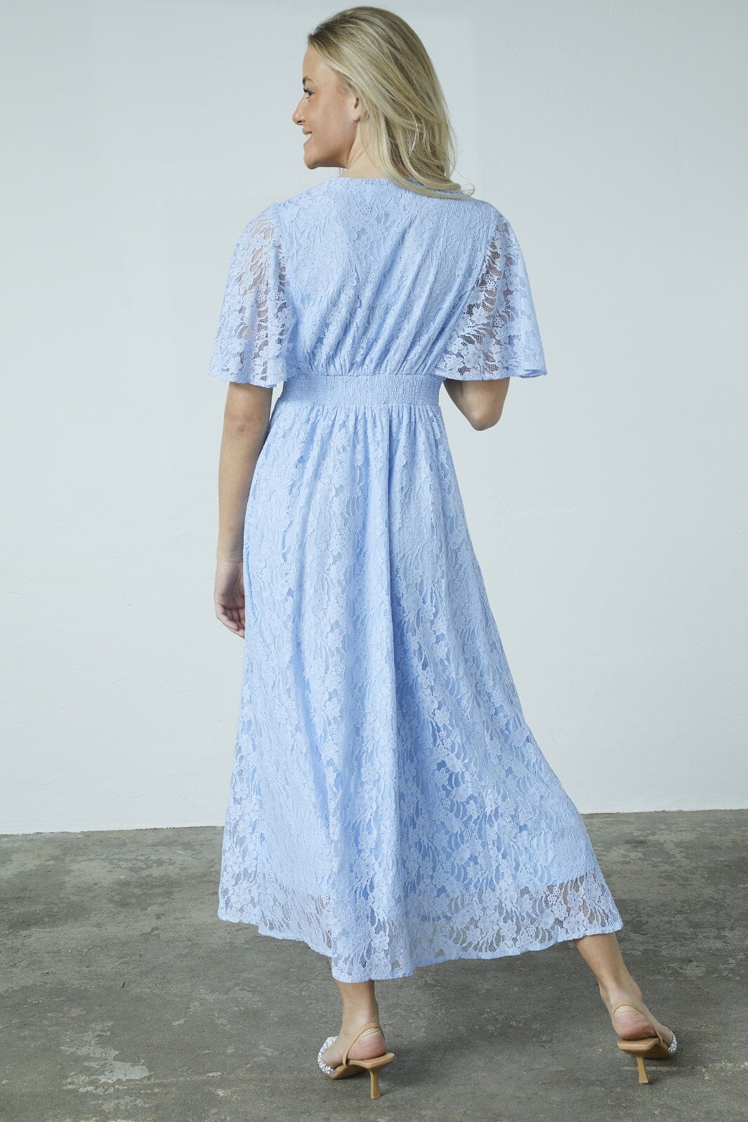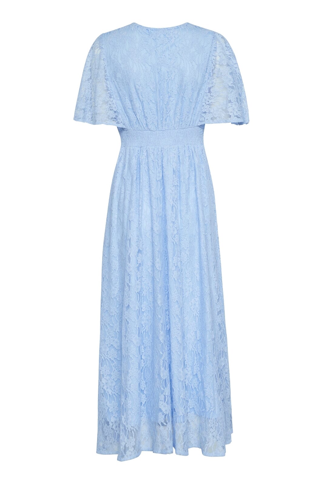 Ljusblå spetsklänning från Sisters Point med v-ringning. Klänningen har korta volangärmar och ett blommigt spetsmönster över hela tyget.