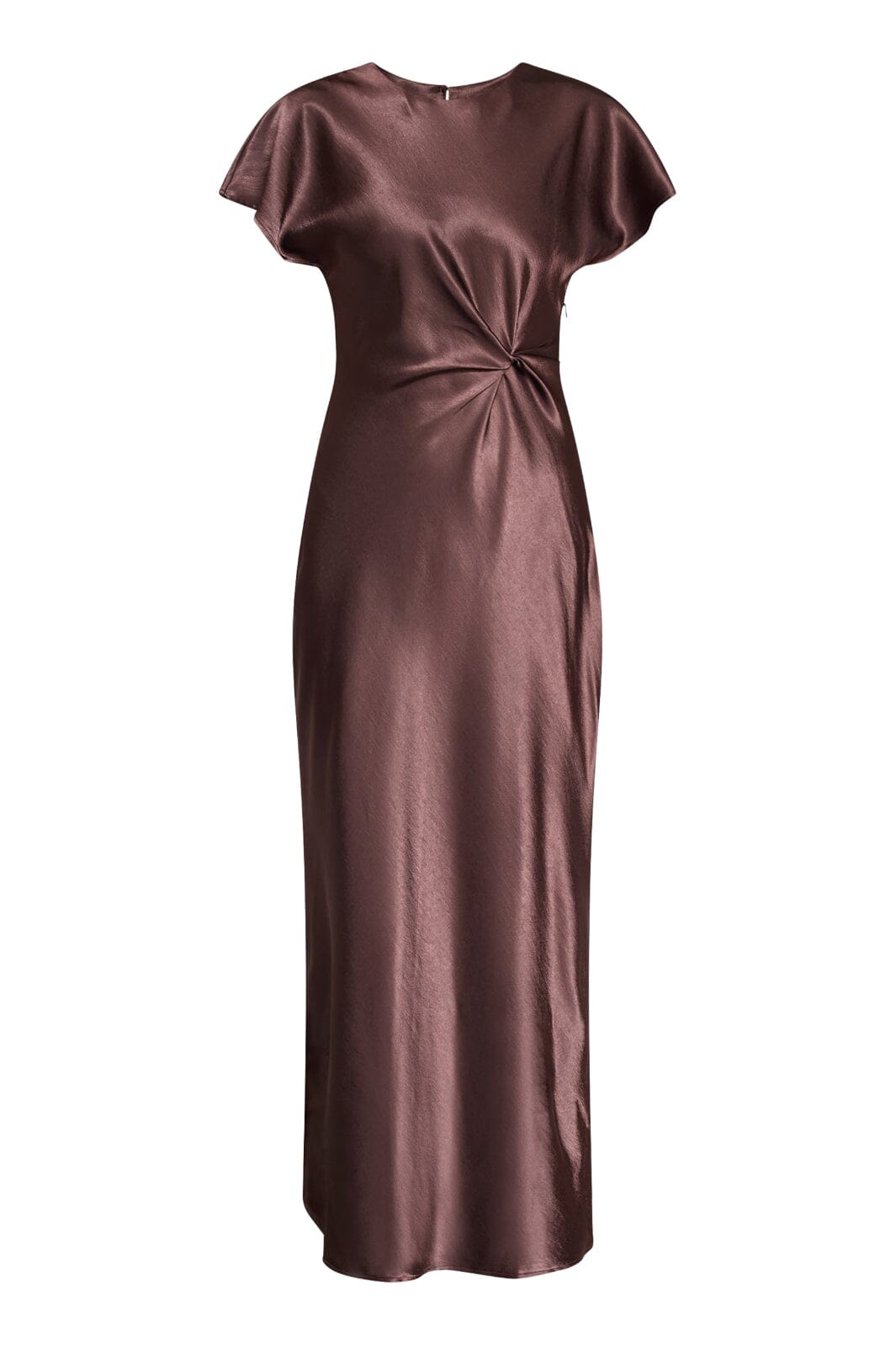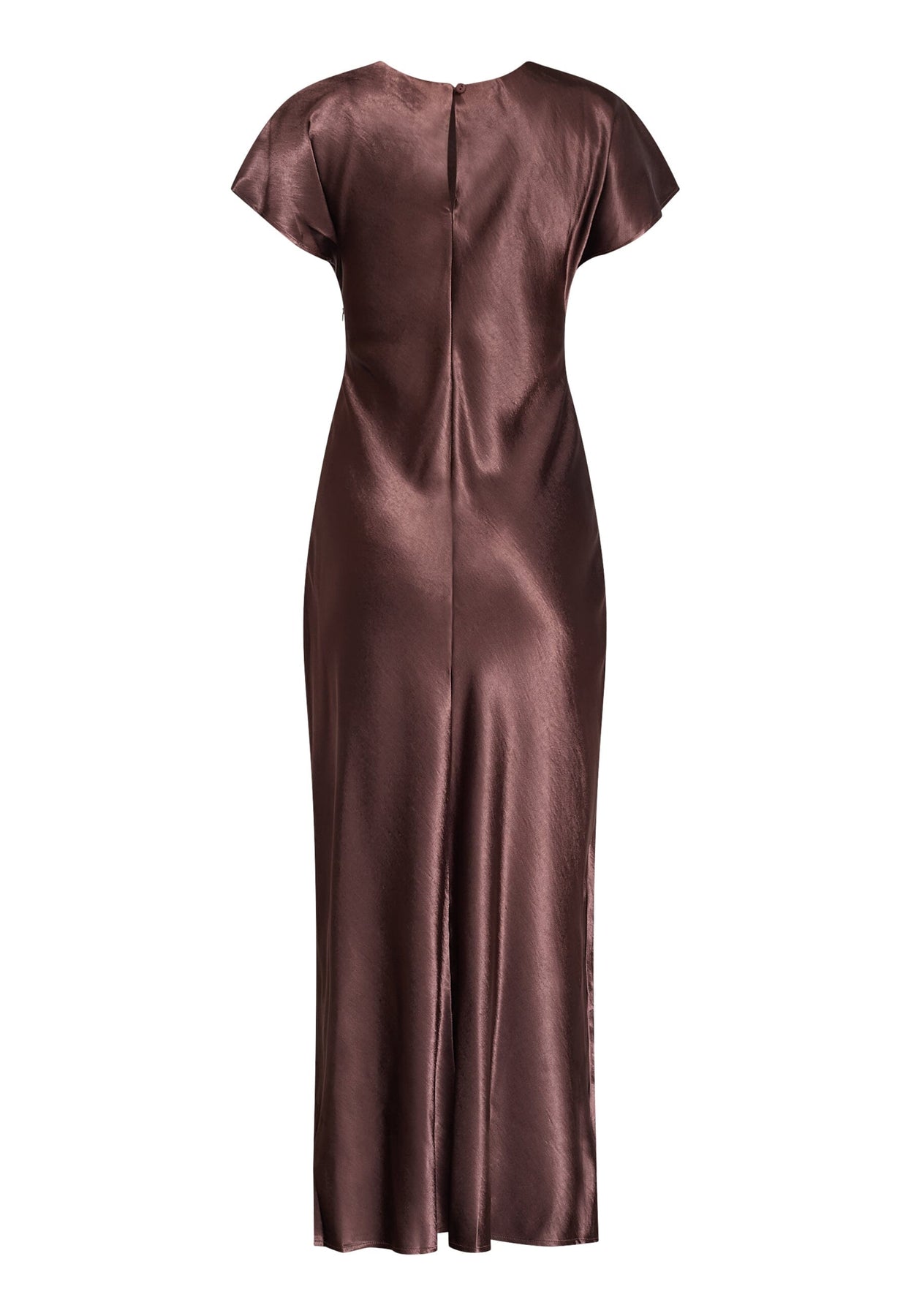 Brun festklänning från Sisters Point med glänsande yta. Klänningen har korta ärmar, rund halsringning och en draperad detalj framtill. Den slanka passformen och ankellängden skapar en fin silhuett.