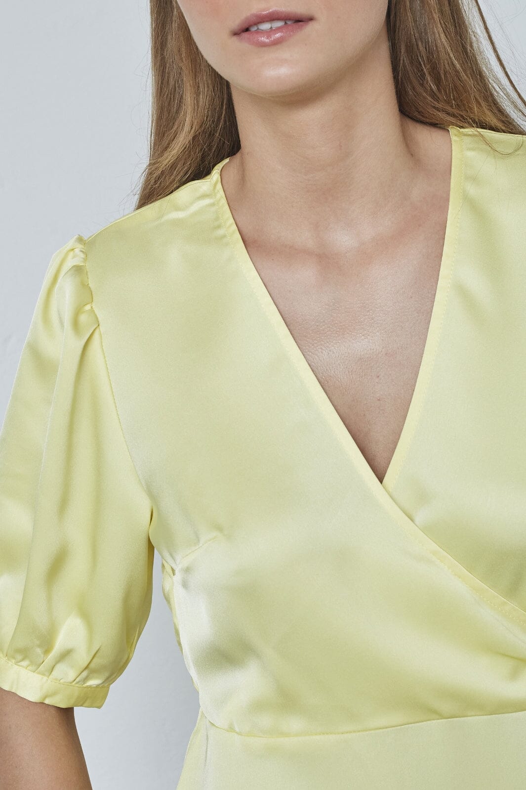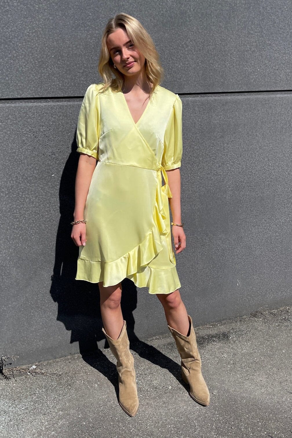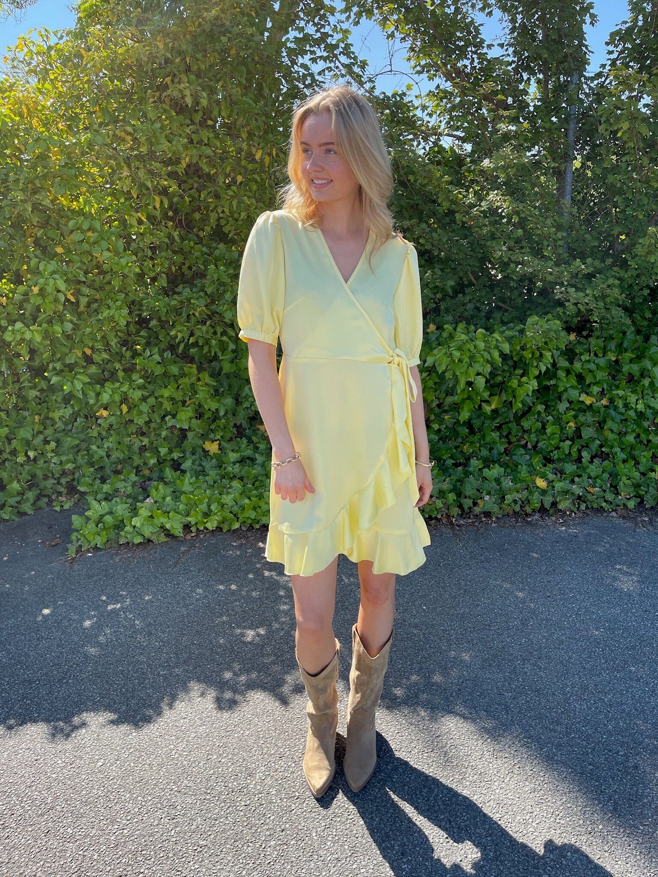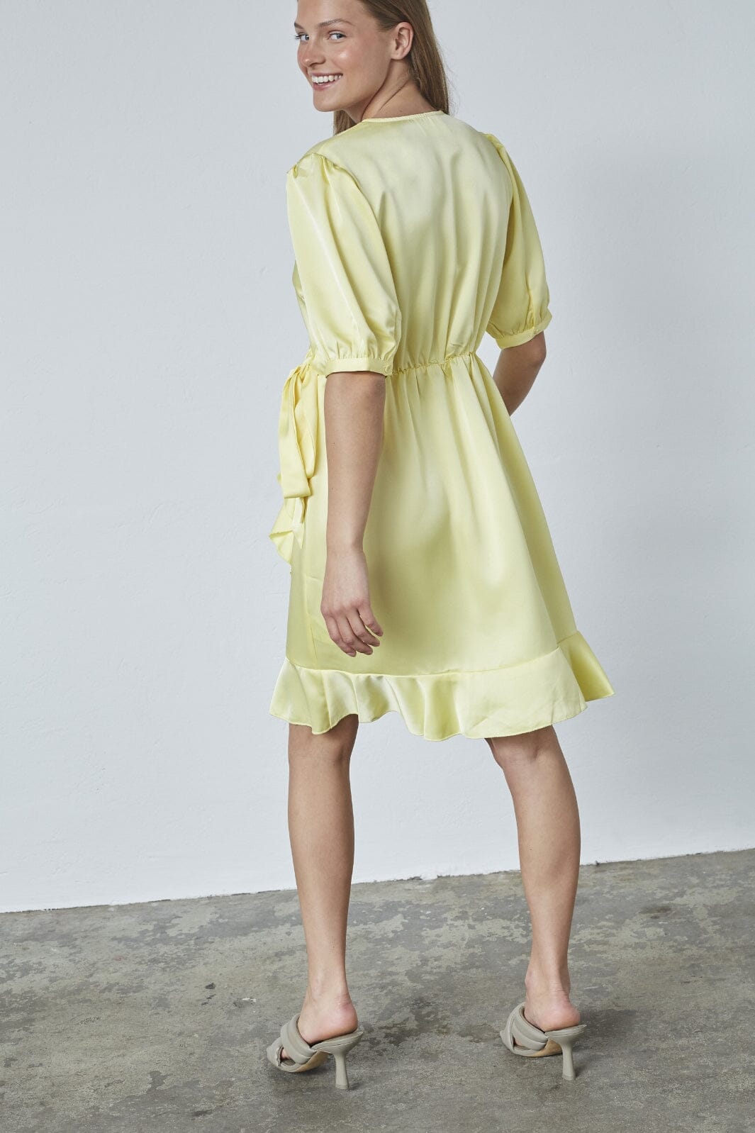 Slå-om-klänning från Sisters Point i ljusgul satin. Klänningen har puffärmar, v-ringning och en volangkant nertill. Ett knytband i sidan skapar en fin silhuett.