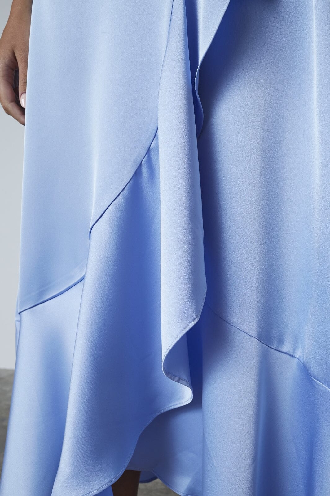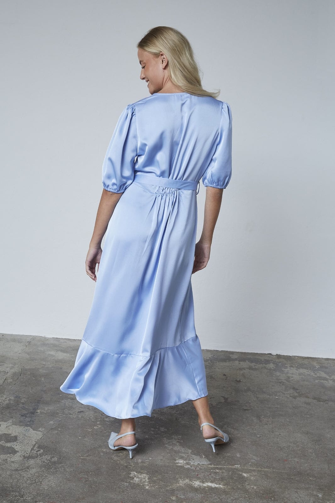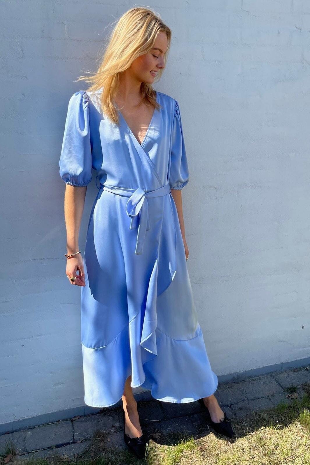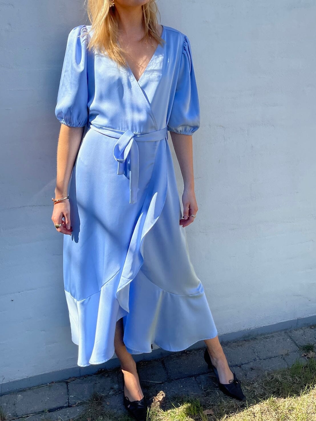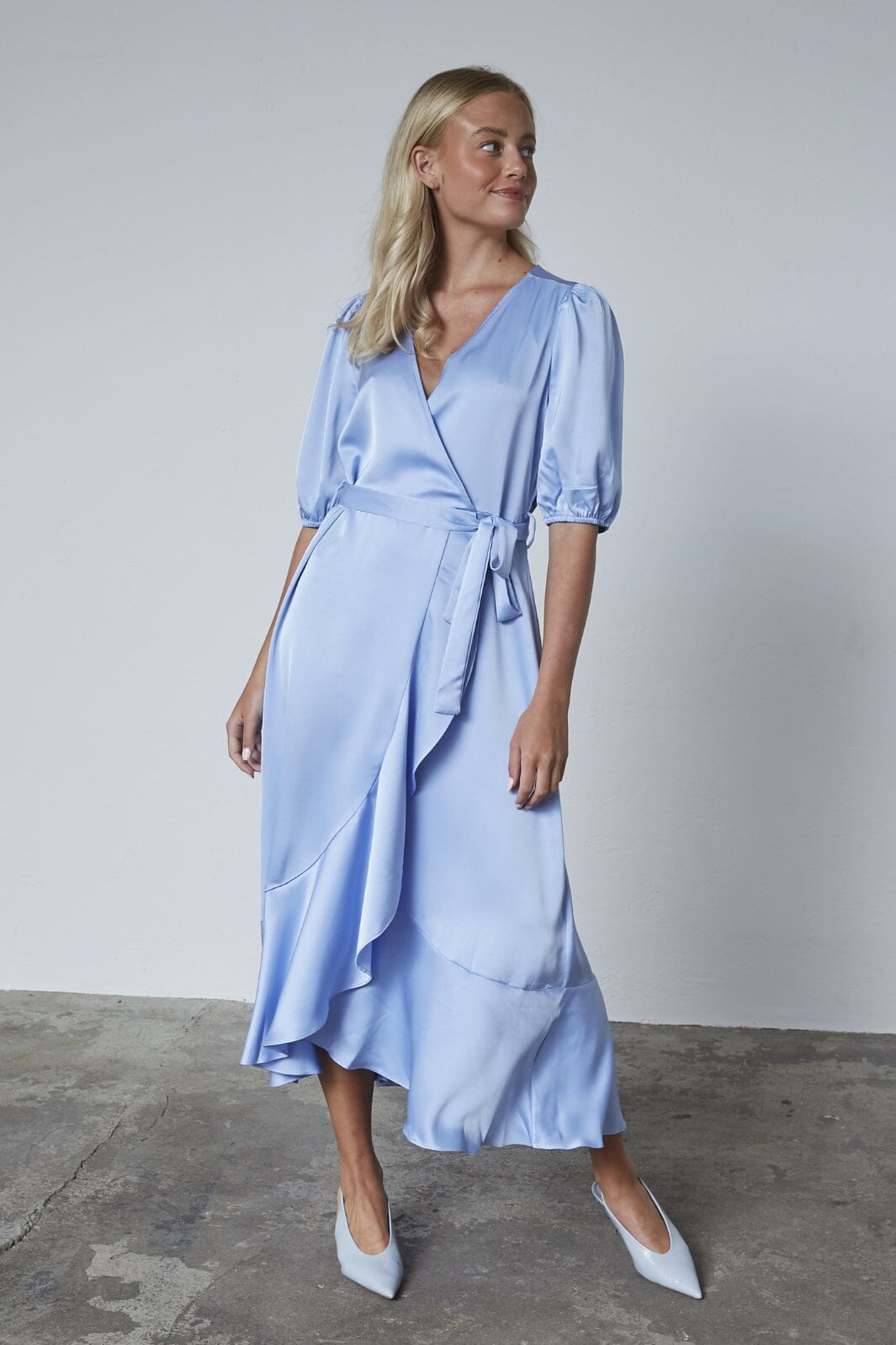 Ljusblå klänning från Sisters Point i en mjuk kvalitet. Klänningen har en omslagsdesign med bälte och puffärmar som ger en fin silhuett. Den lagerdelade kanten tillför ett extra lager till designen.