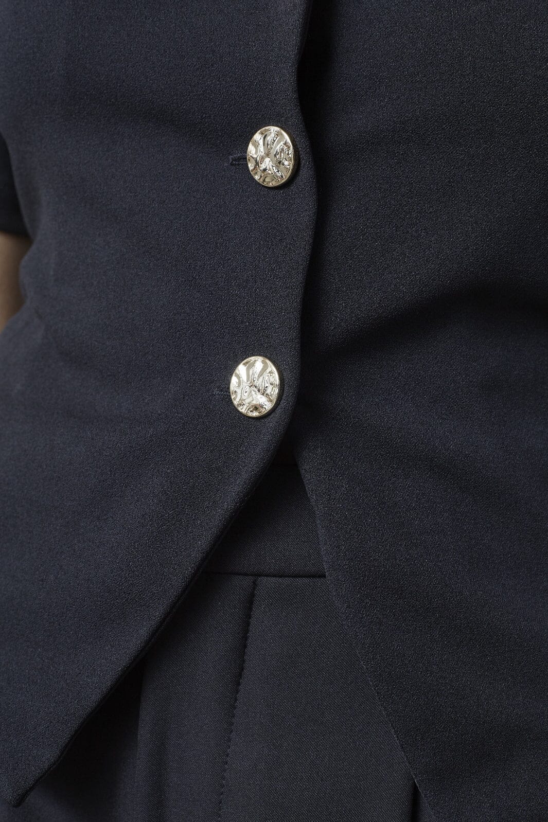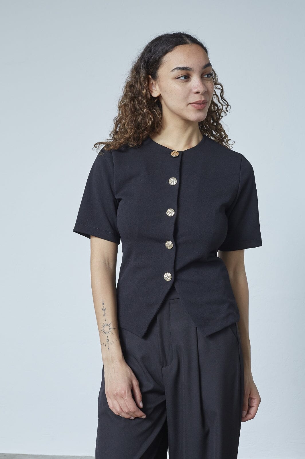 Svart topp från Sisters Point med figurnära passform. Toppen har korta ärmar och rund halsringning samt dekorativa knappar fram och en lätt slits i botten.