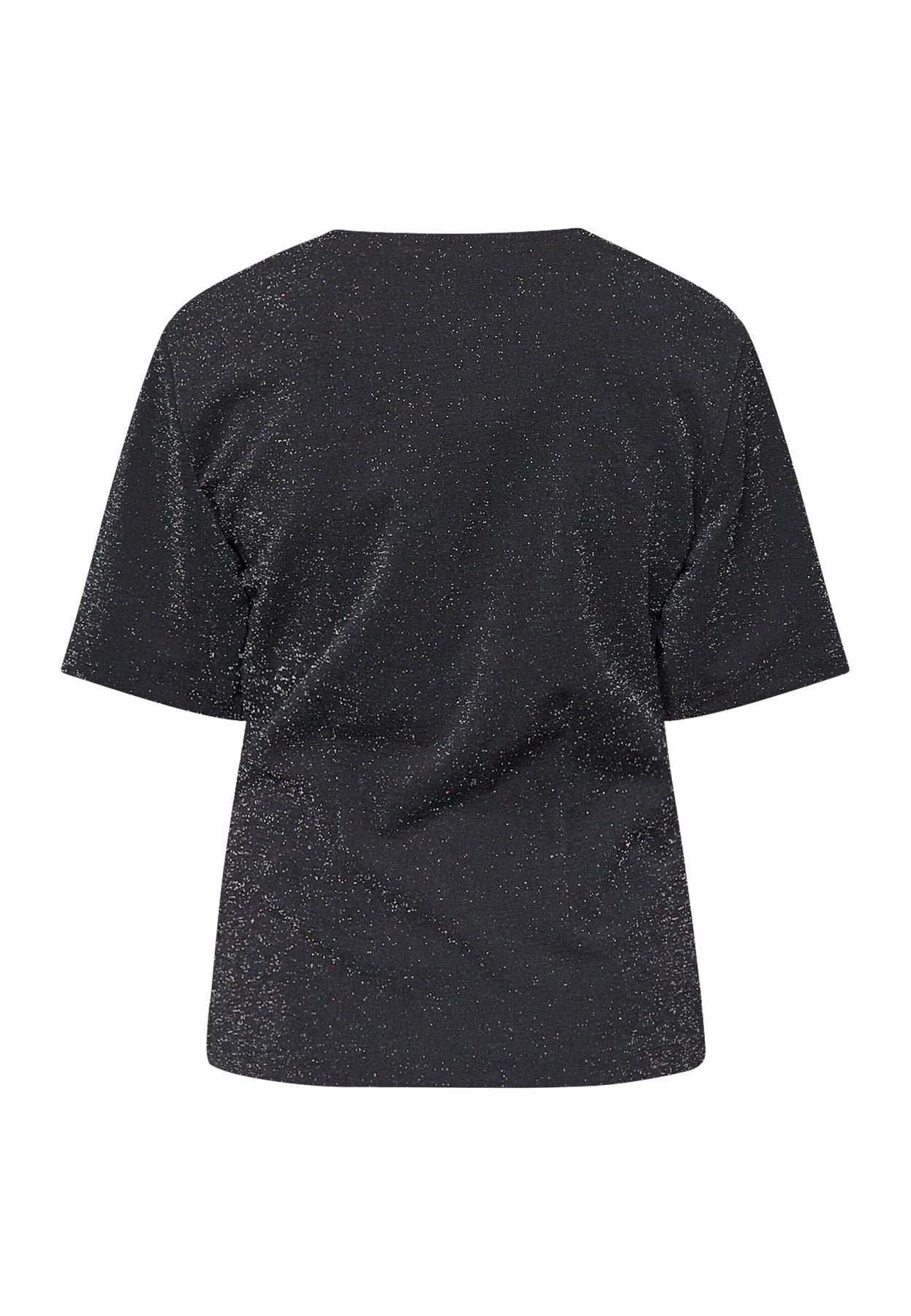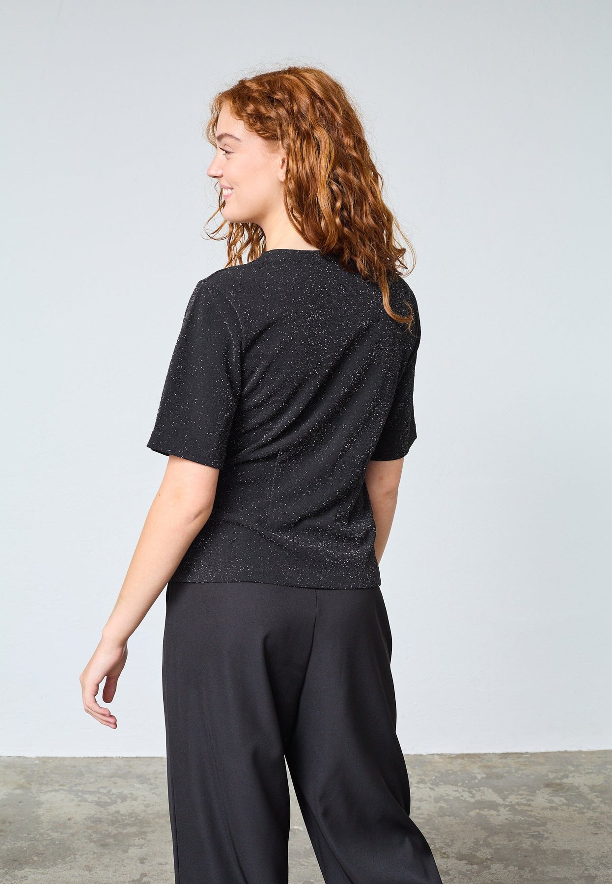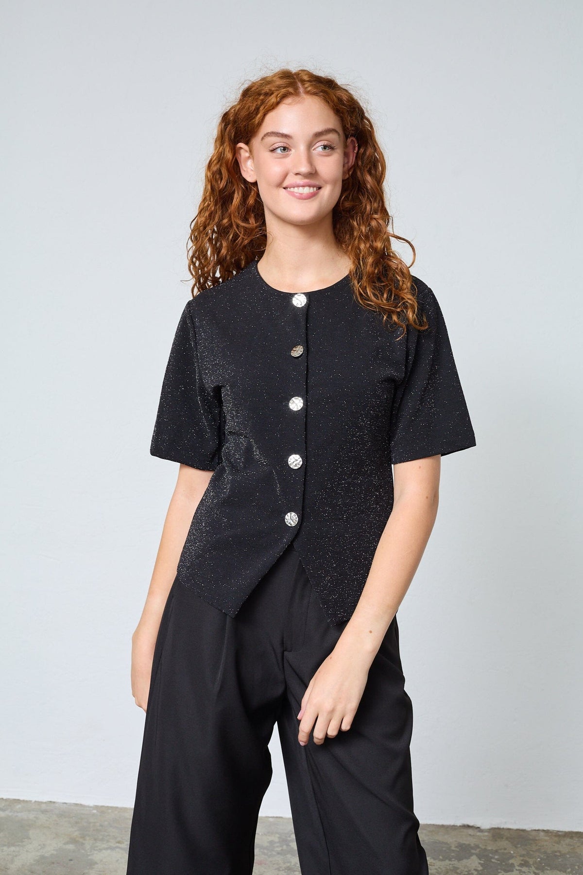 Svart topp med glittrande silver effekt från Sisters Point. Toppen har en rund halsringning och korta ärmar med dekorativa silverknappar på framsidan.