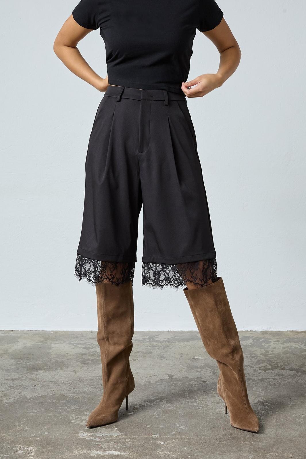 Svarta shorts från Sisters Point med spetsdetaljer vid bensluten. Shortsen har en lös passform och går precis över knäet.