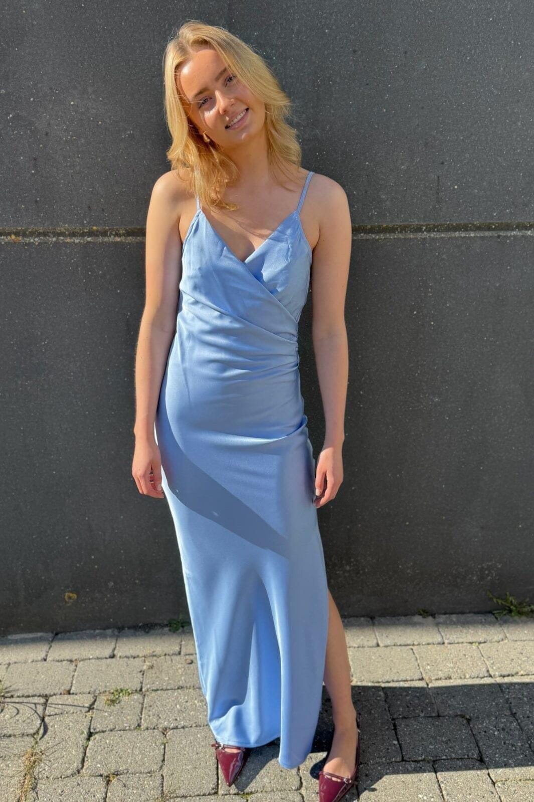 Lång klänning från Sisters Point i ljusblått. Klänningen har en kroppsnära passform med v-ringning och tunna axelband. Den feminina silhuetten framhävs av en slits på sidan.