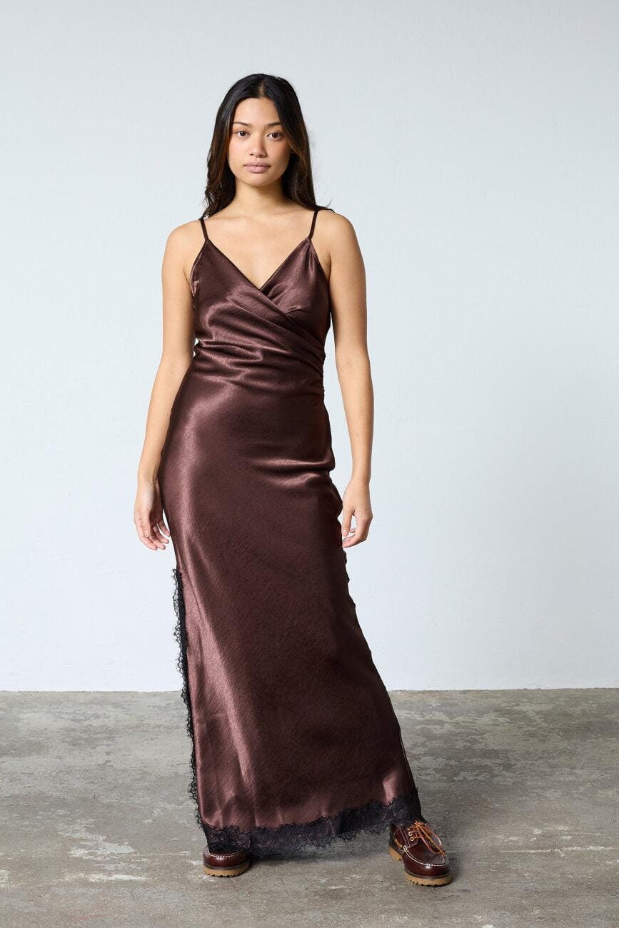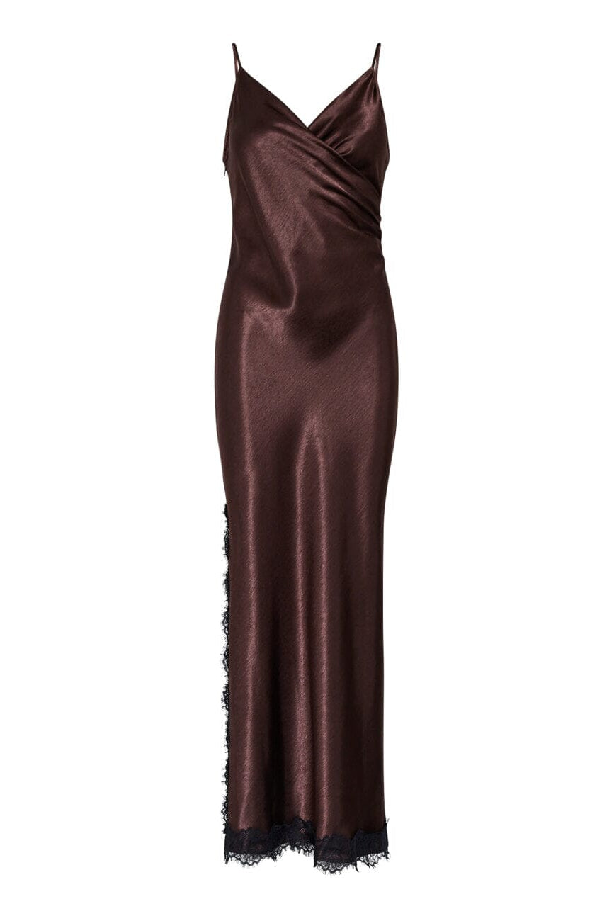 Klänning från Sisters Point i brun och svart med glänsande satinfinish och svarta spetsdetaljer längs kanten samt en sidoklyvning.