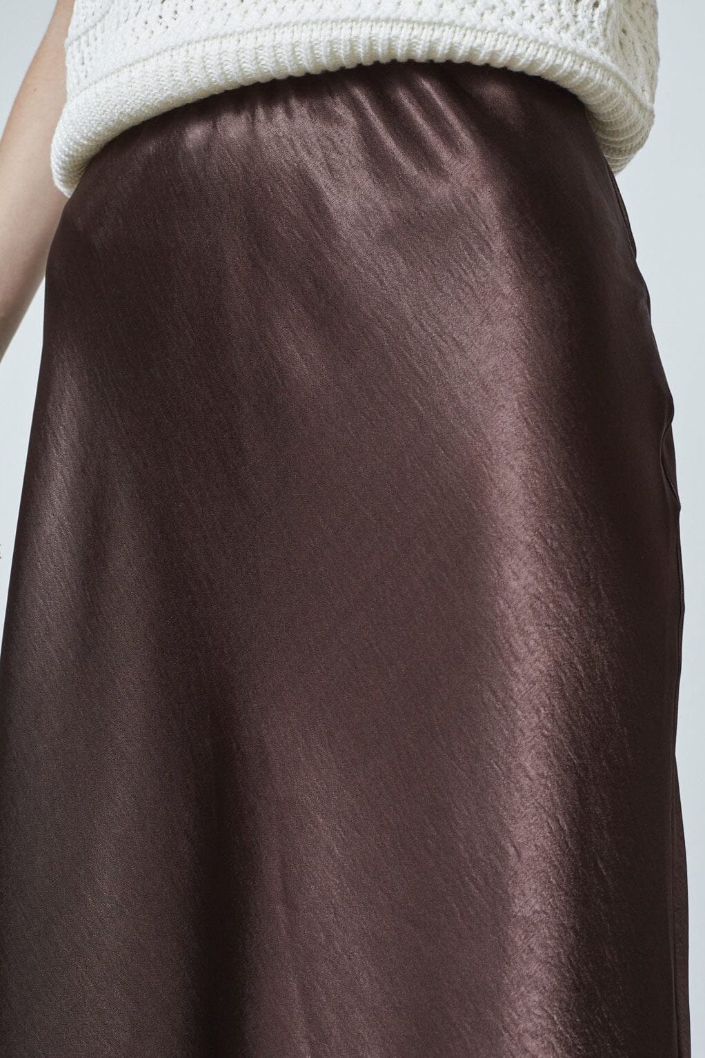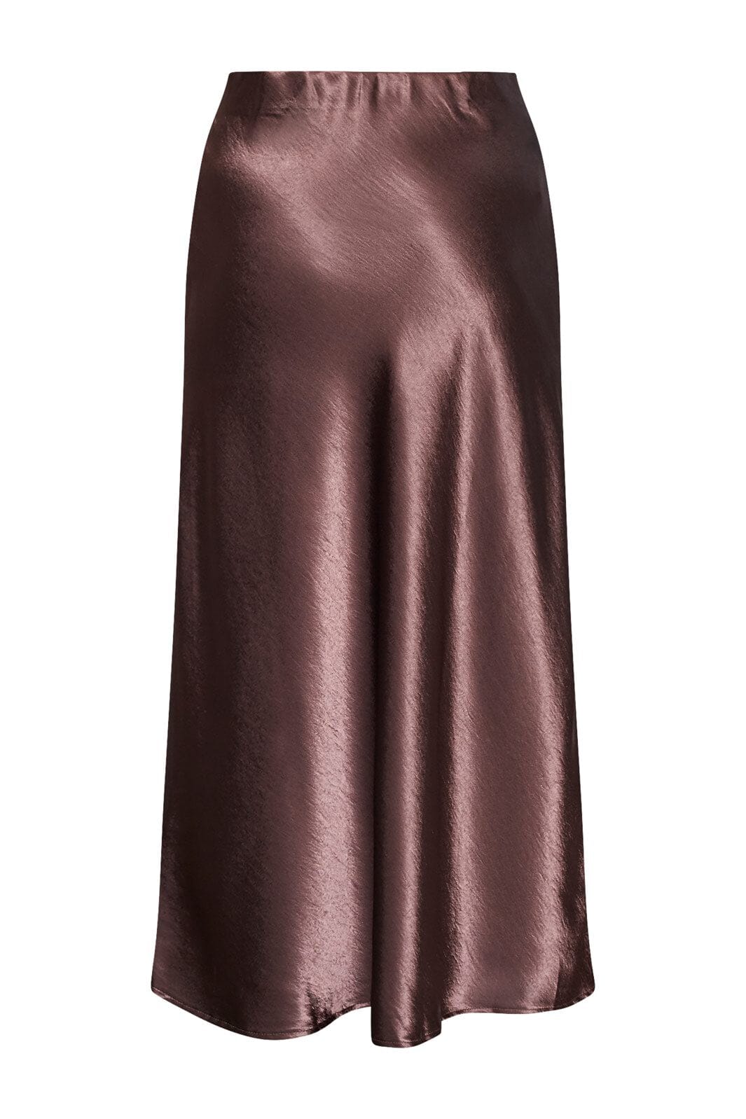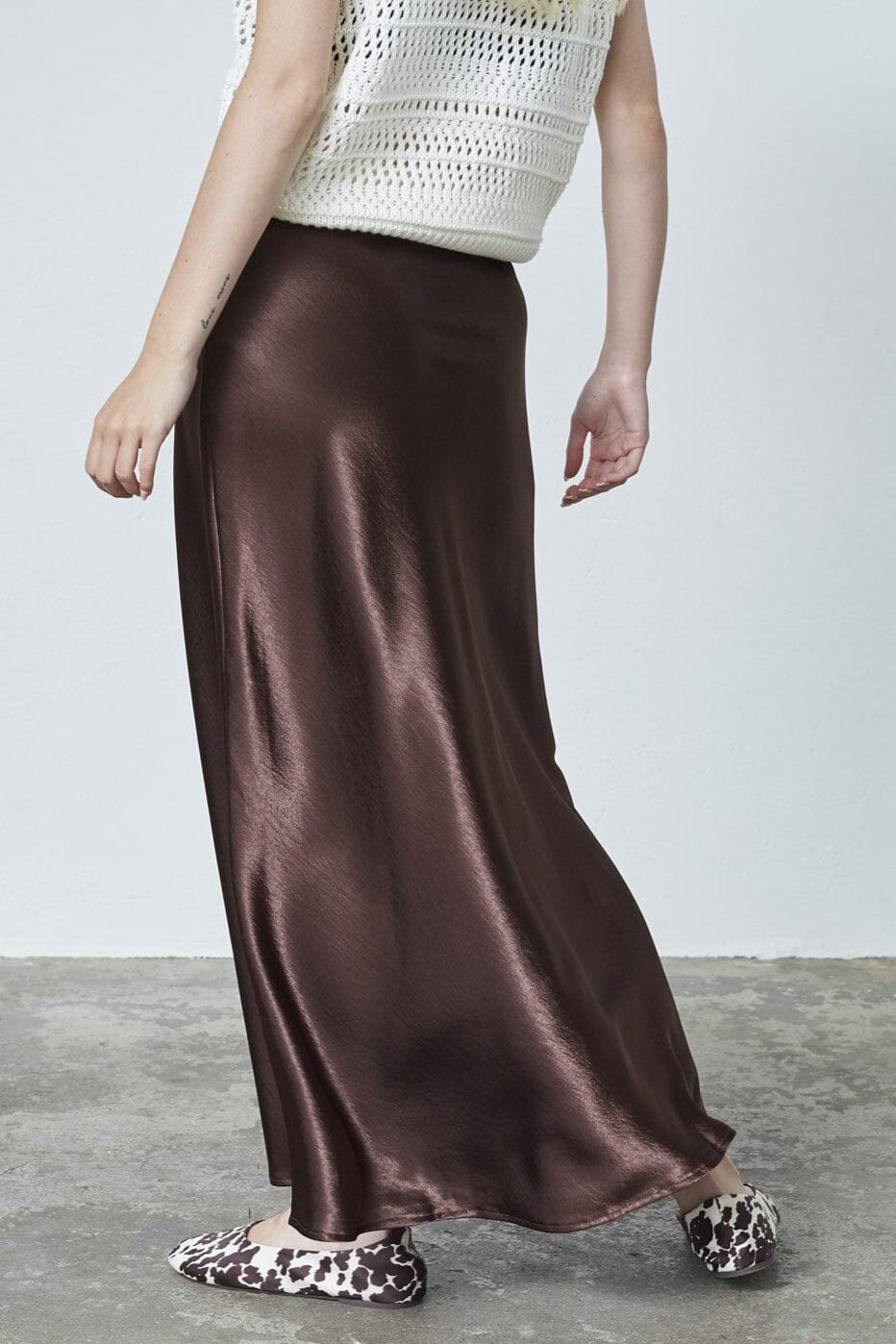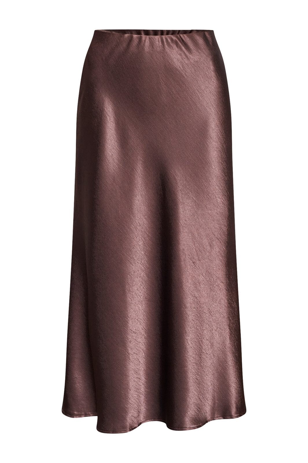 Brun kjol från Sisters Point i glänsande satinmaterial. A-line formen och det släta tyget ger kjolen ett mjukt fall. Längden går till vaden.