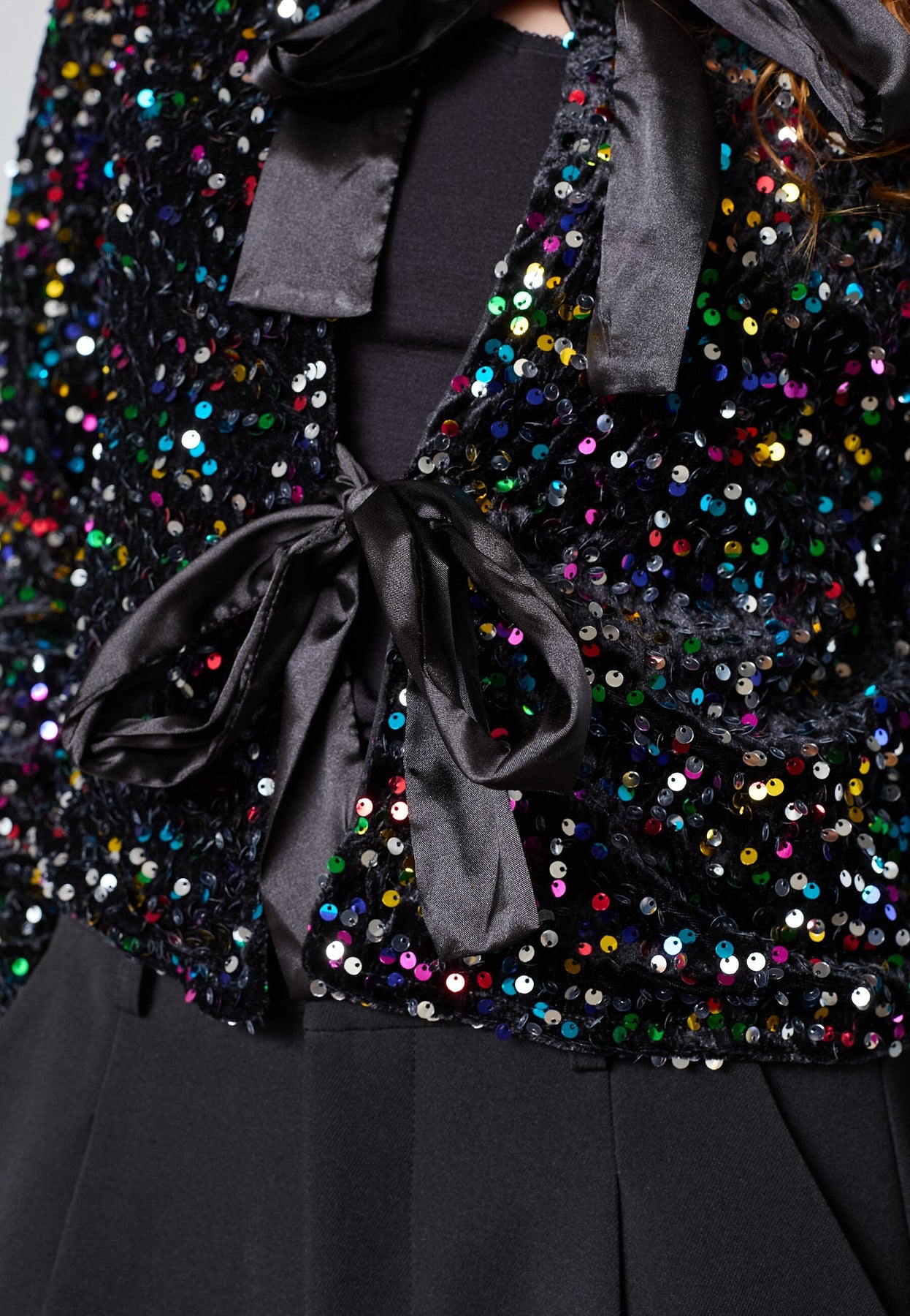 Svart topp från Sisters Point med färgglada paljetter över hela. Två stora rosetter i slätt tyg pryder framsidan, och toppen har långa ärmar med samma paljettbesättning.