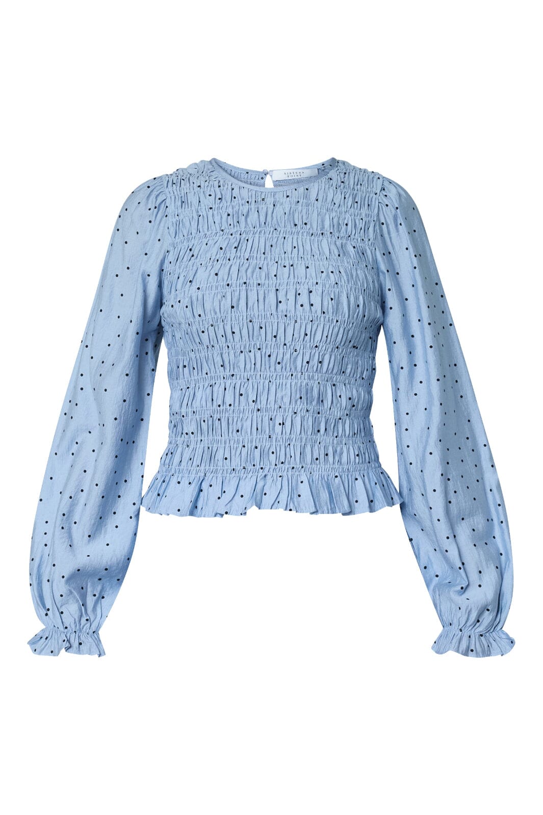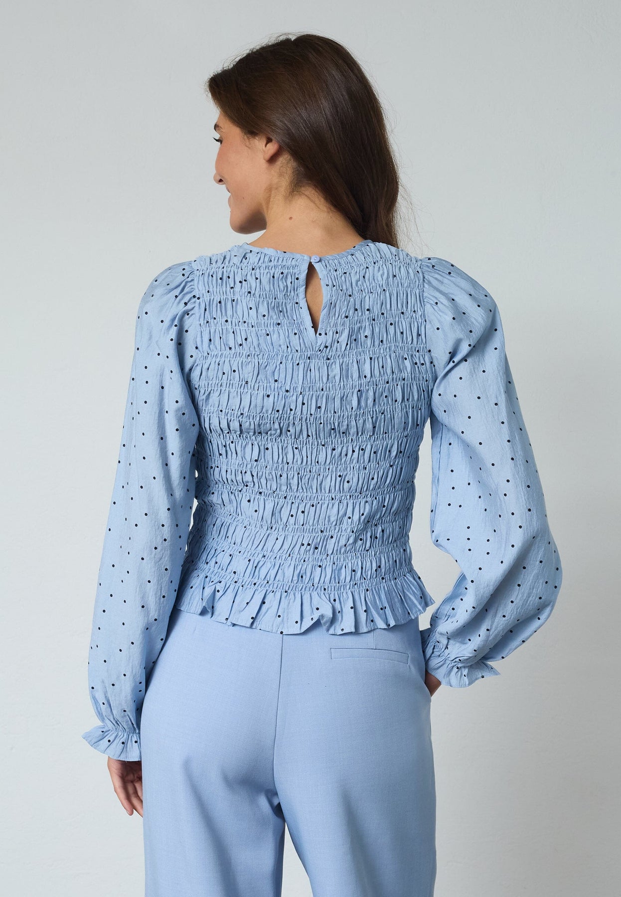 Ljusblå blus från Sisters Point med svarta prickar. Blusen passar både för avslappnade och festliga tillfällen.