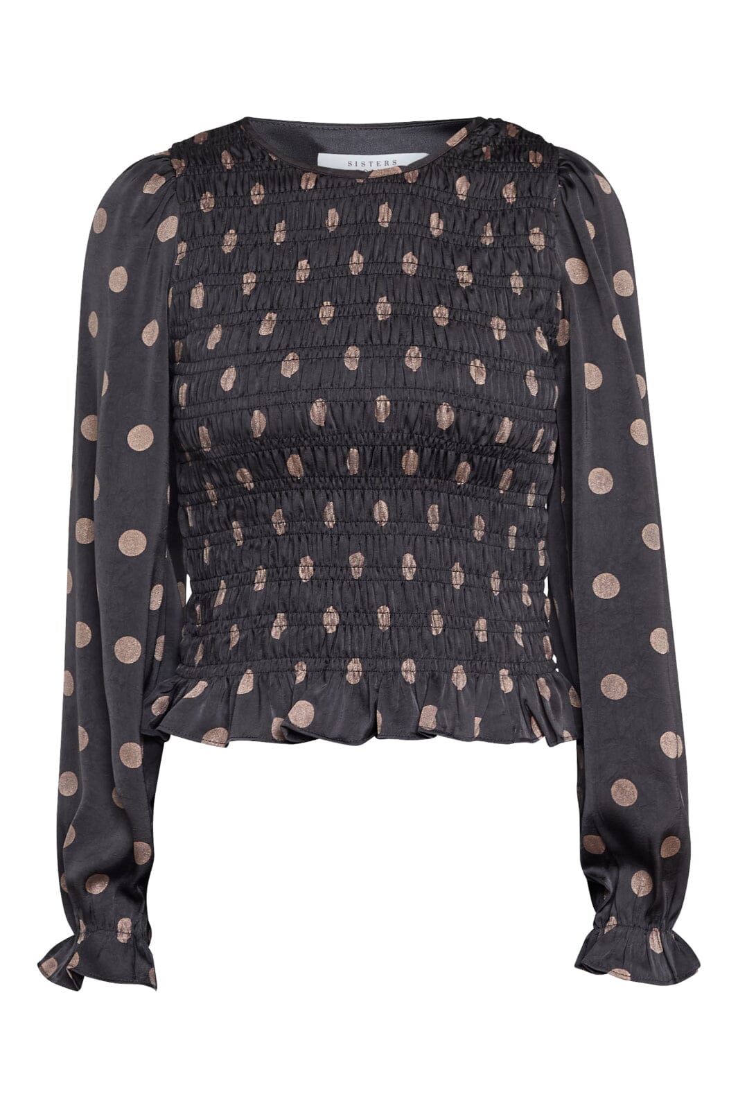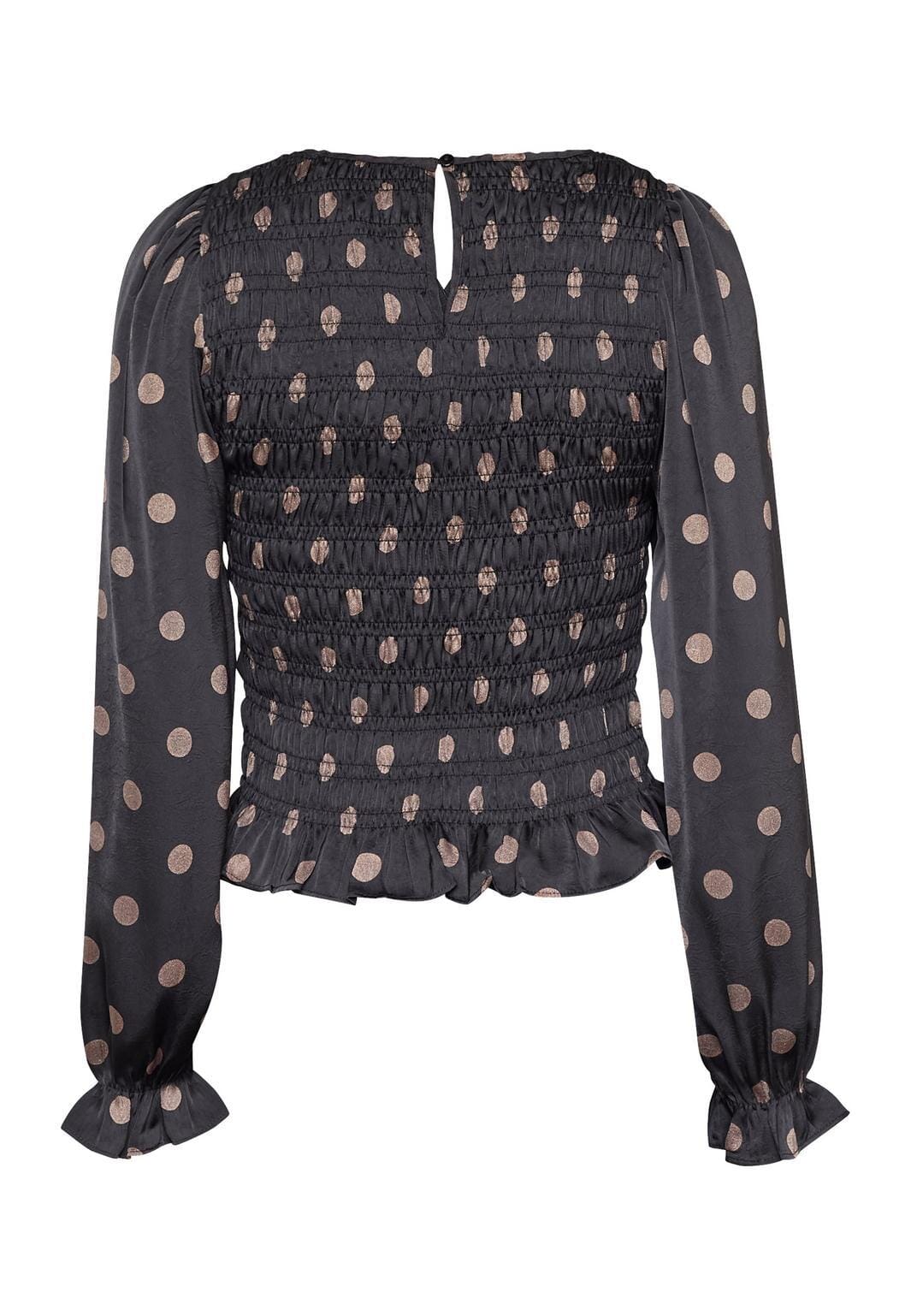 Svart blus från Sisters Point med polkaprickar i matt satin. Blusen har rund halsringning och en slim fit-passform, och den passar både till vardag och festliga tillfällen.