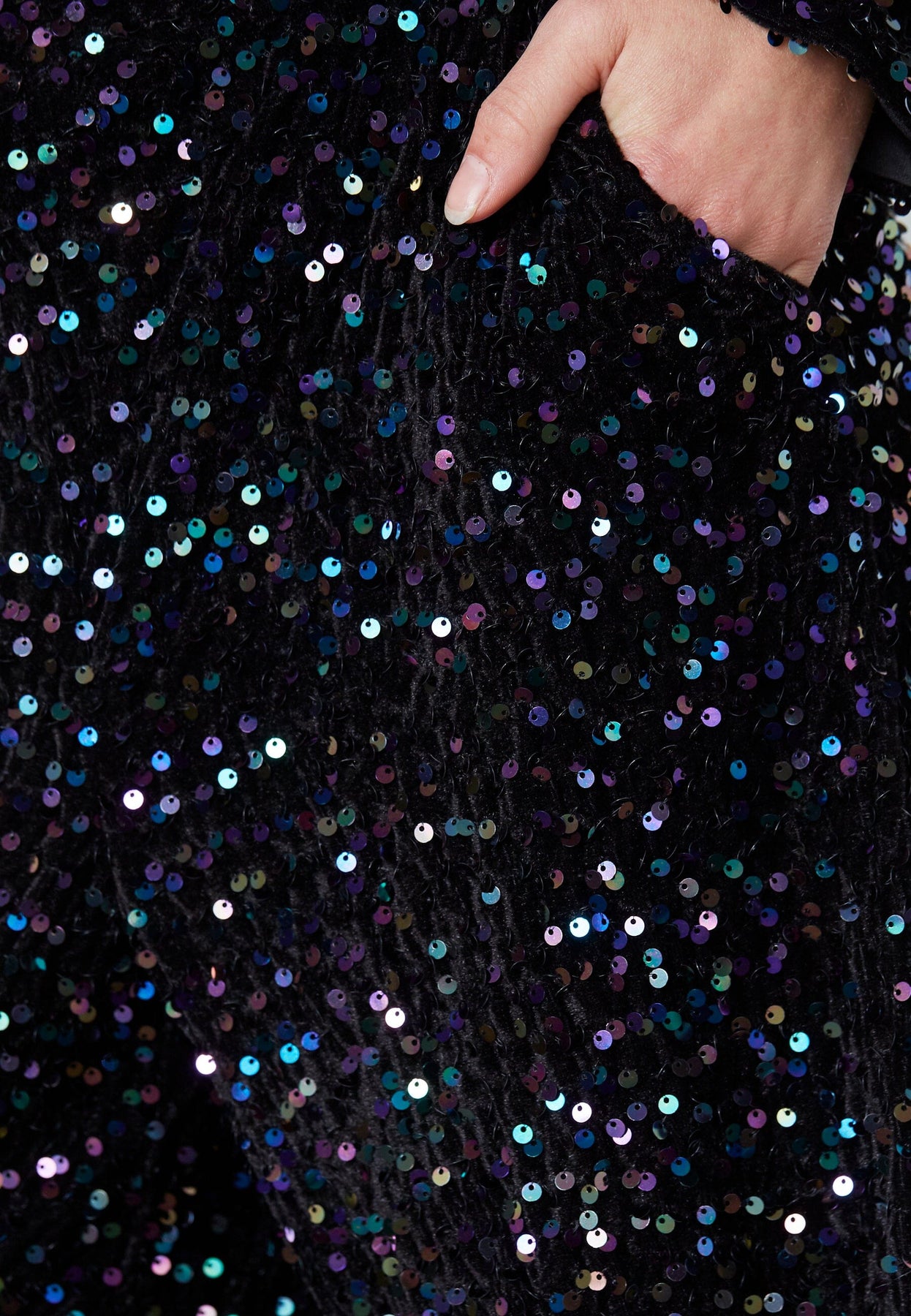 Svarta byxor från Sisters Point med lös passform och vida ben. Byxorna är täckta av flerfärgade paljetter som skapar ett festligt uttryck. Elastiken i midjan ger en bra passform.