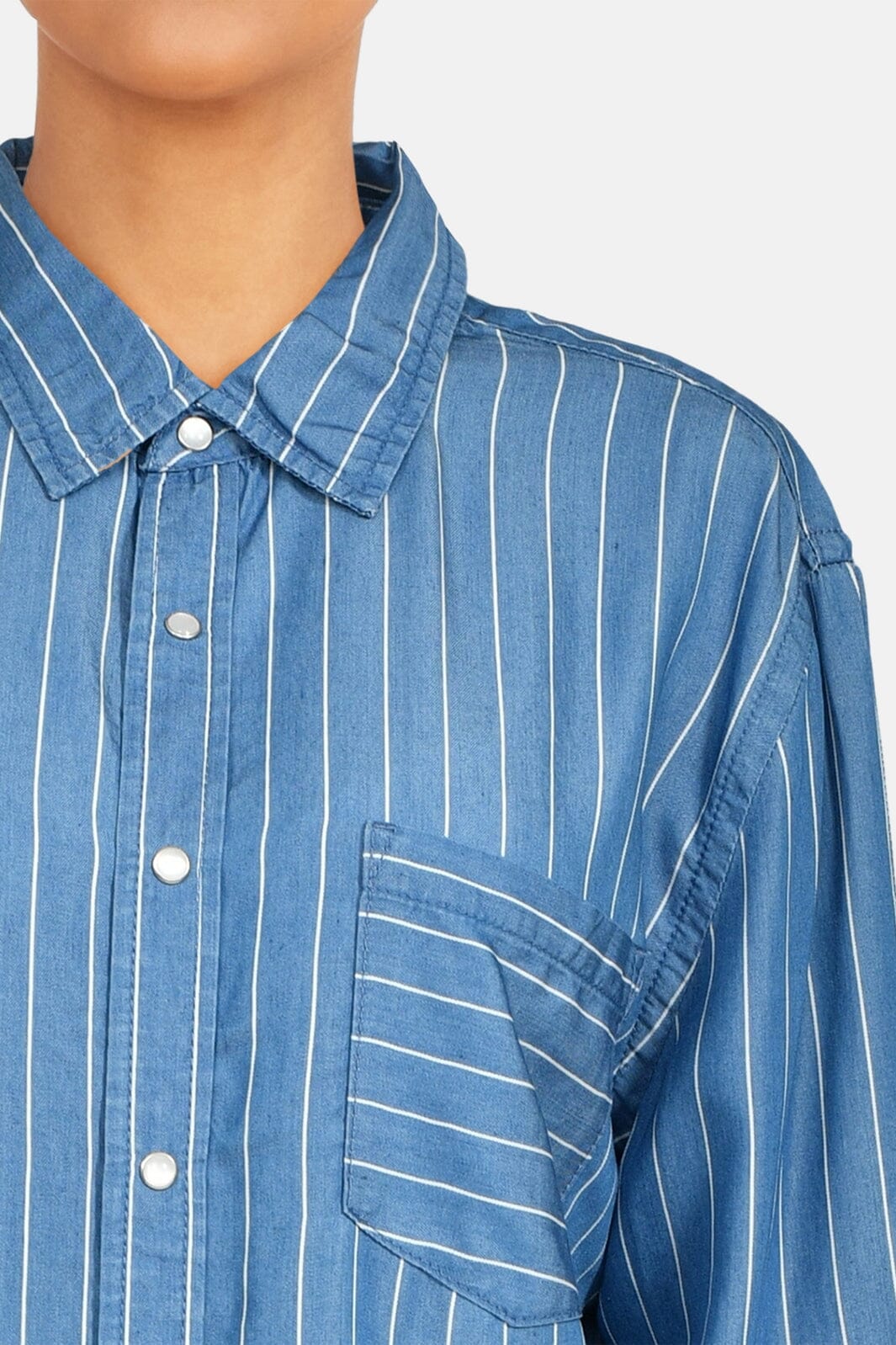 En ledig randig denimskjorta med en bröstficka, krage och stängning med tryckknappar. Skjortan är längre bak än fram. Modellen är 172 cm och bär storlek S.