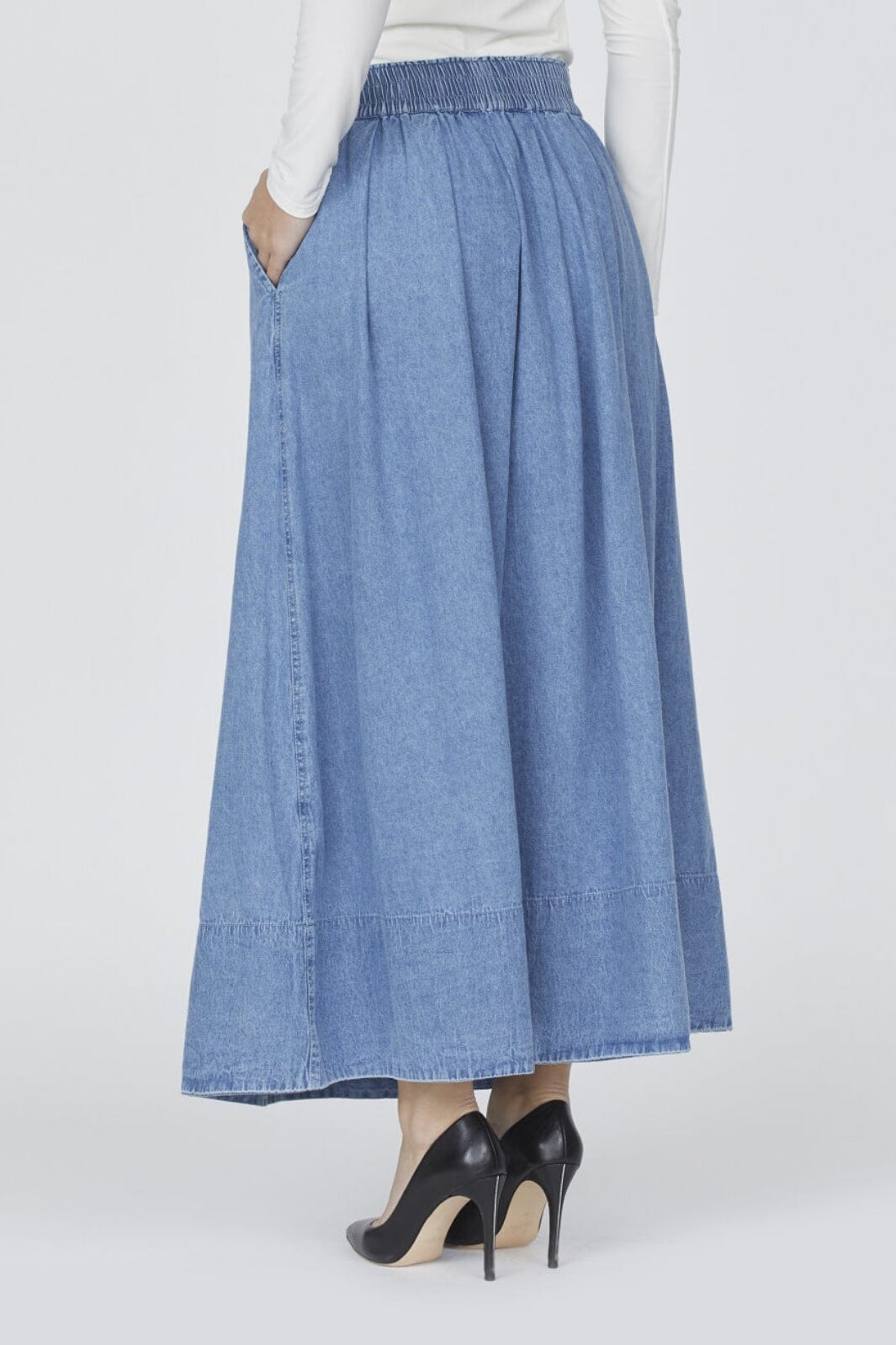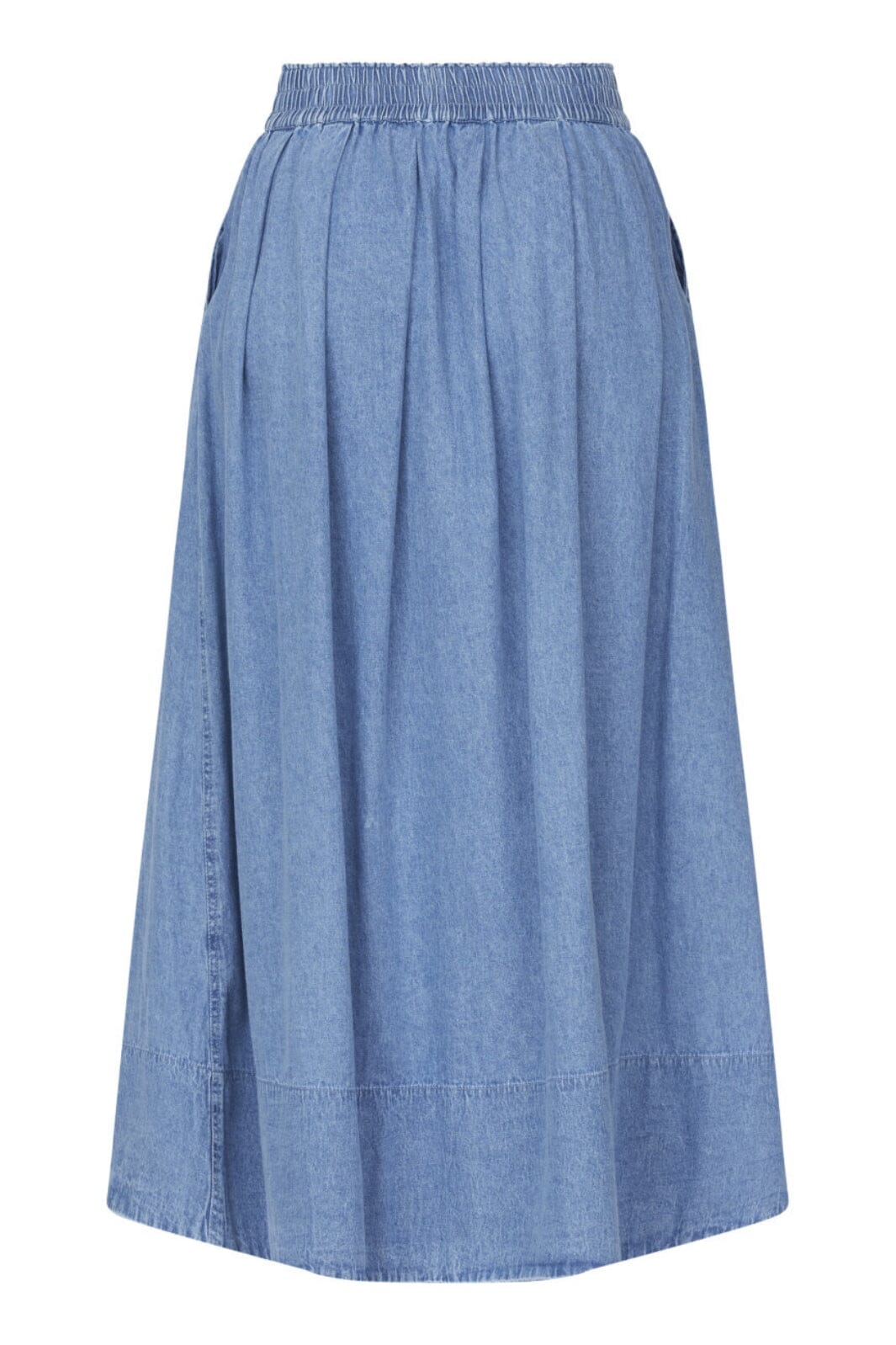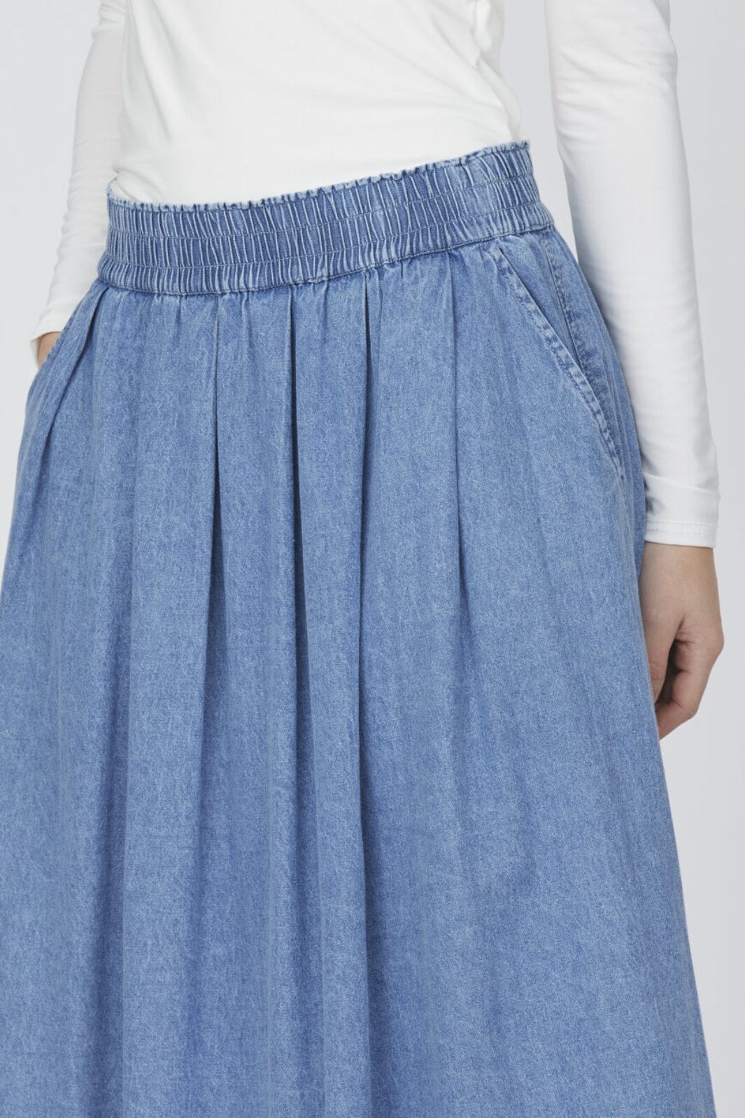 Lång denimkjol från Sisters Point i ljusblått. Kjolen har en lös passform med elastisk midja och praktiska sidofickor. De dekorativa sömmarna ger kjolen en fin touch.