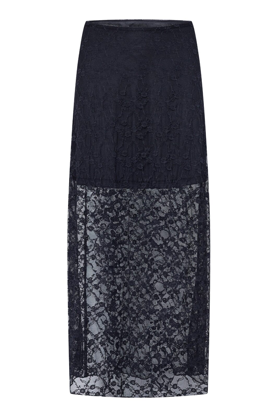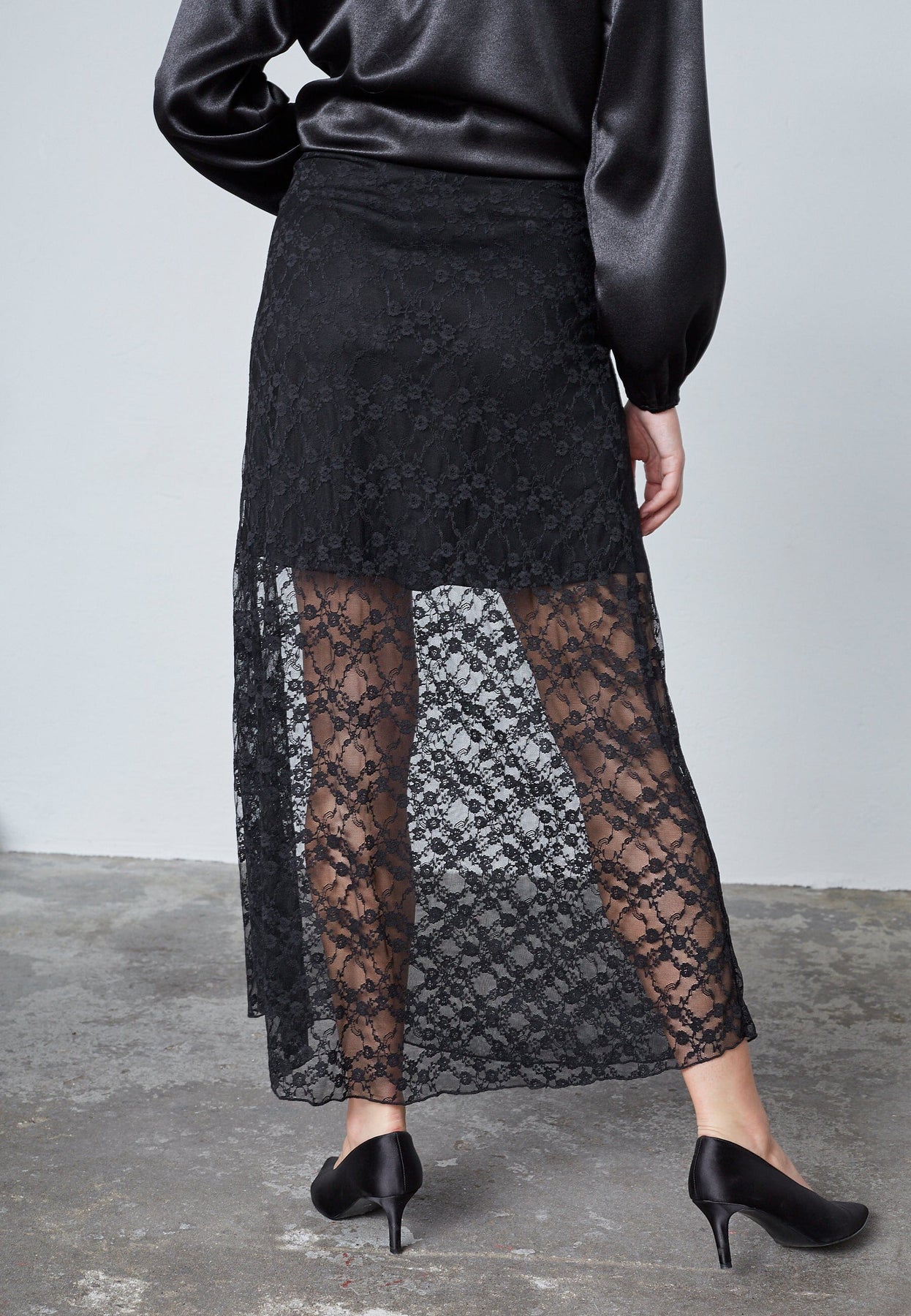 Svart kjol från Sisters Point med blommönster i spets. Den övre delen är åtsittande och ogenomskinlig, medan den nedre delen har ett genomskinligt spetstyg från knäet och ner.
