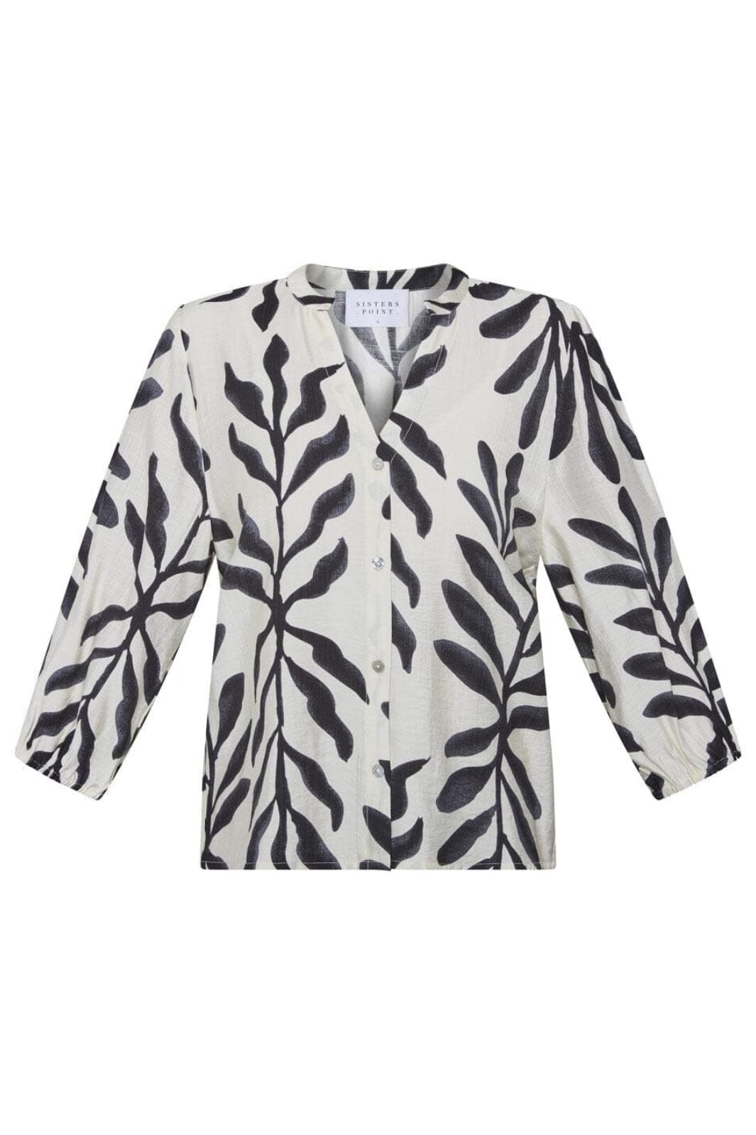 Skjorta från Sisters Point med svart bladmönster på krämfärgad bakgrund. Skjortan har v-hals, trekvartsärmar och knappstängning fram. Den lösa passformen ger god rörelsefrihet.