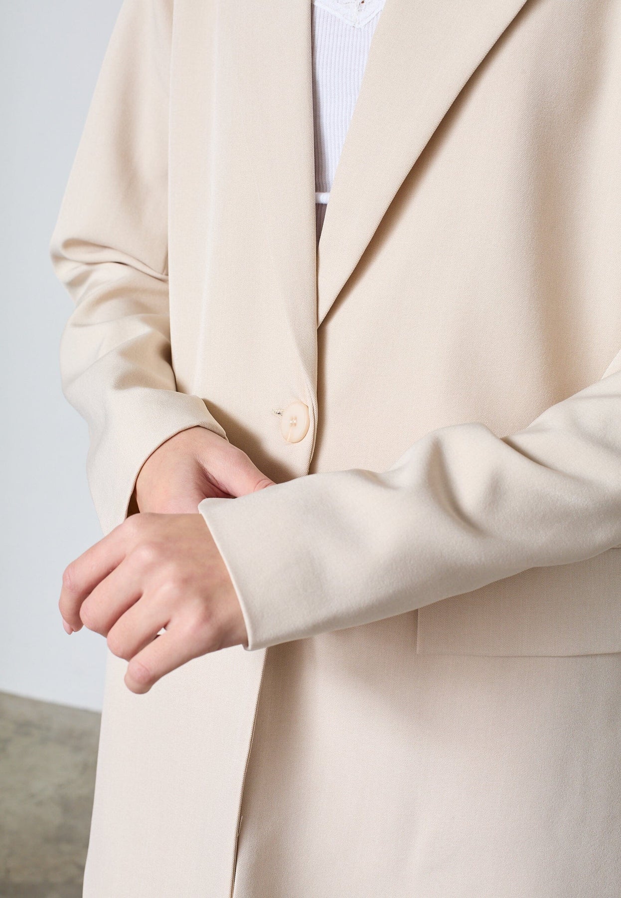Ljus blazer från Sisters Point i färgen Fog, en neutral beige nyans. Blazern har slagkrage, knäppning framtill och två fickor.