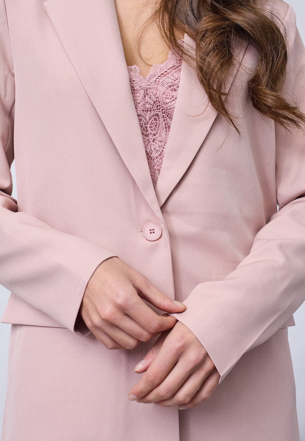Kavaj från Sisters Point i en rosa-lila nyans. Kavajen har slagkrage och knäppning framtill med tre dekorationsknappar på ärmarna.