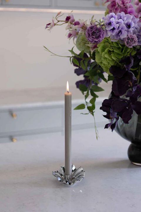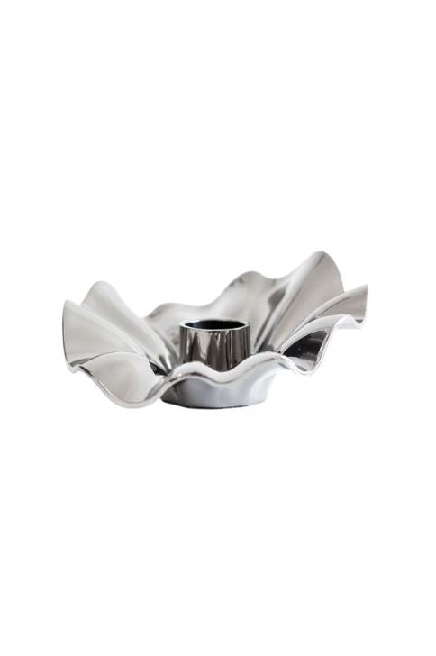 Ljusstake från Specktrum, tillverkad av metall i en silverfärgad kromfinish. Designen har en vågig, blommoliknande form med en reflekterande yta.