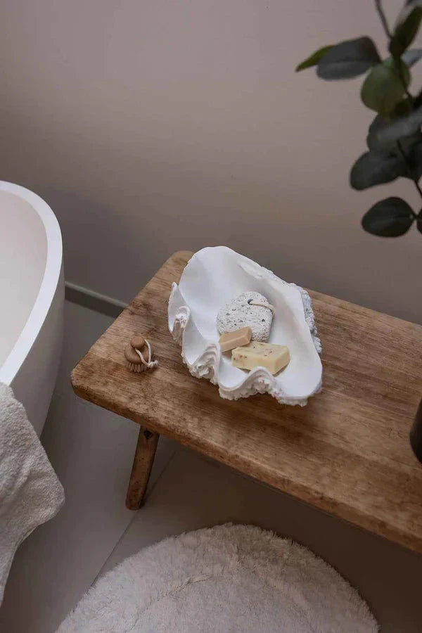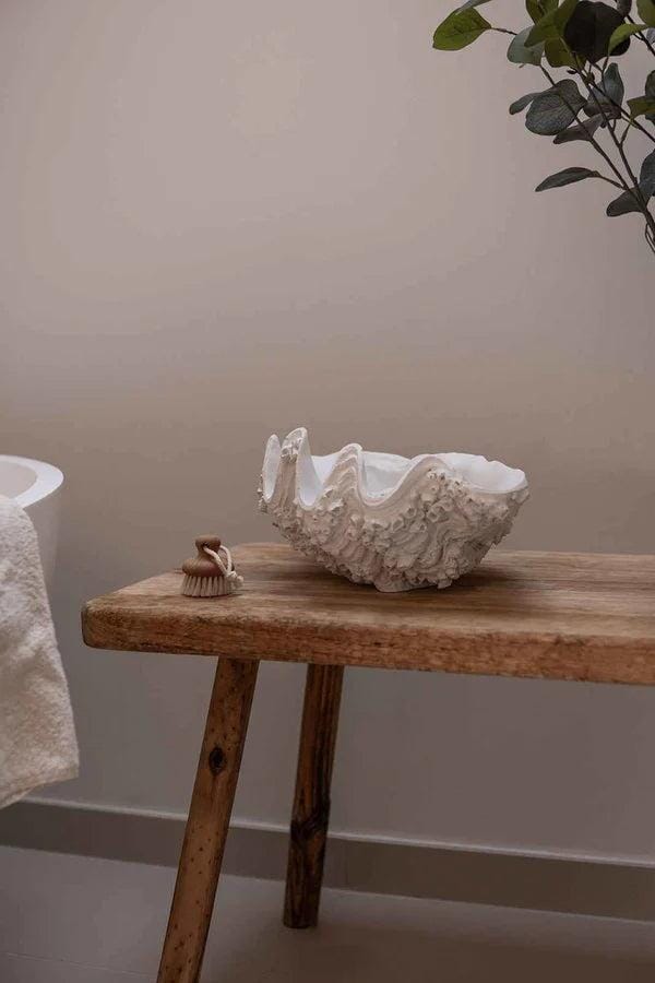 Vit skål från Specktrum med musselskalform. Den har en yta med naturliga mönster och en slät, blank insida. Skålen kombinerar dekorativ stil med praktisk funktion.