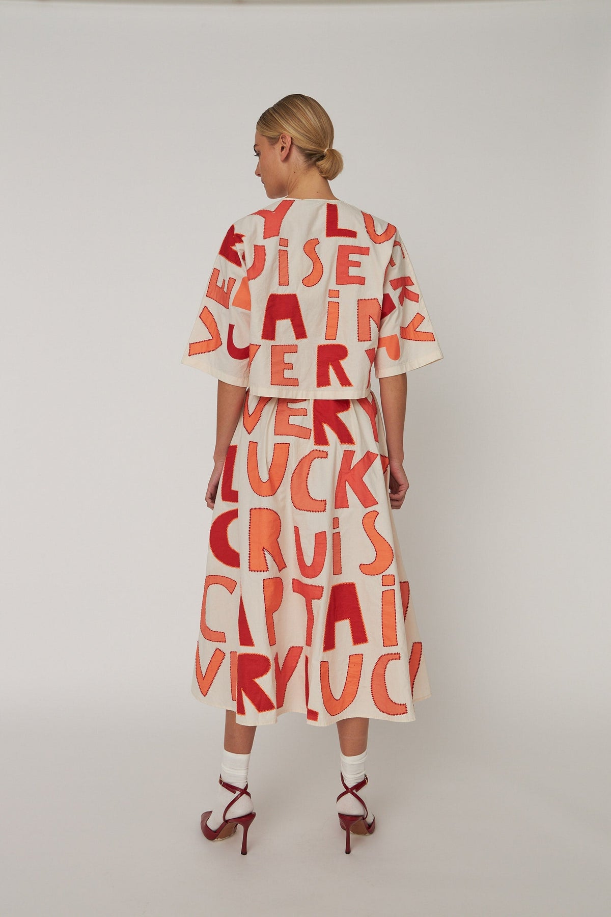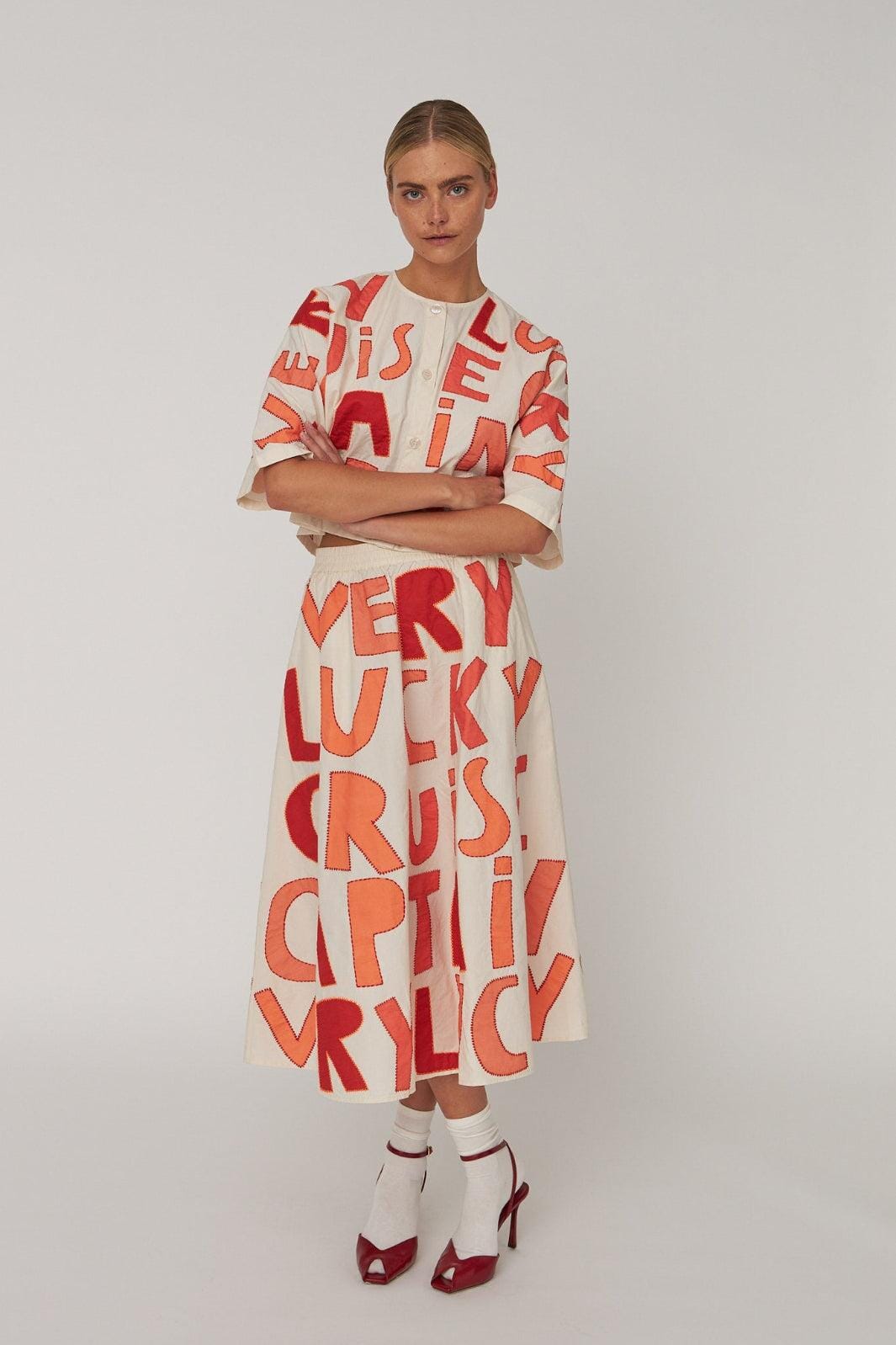 En kjol från Stella Nova med stora bokstäver i röda och orangea nyanser på en vit och cremefärgad bas.
