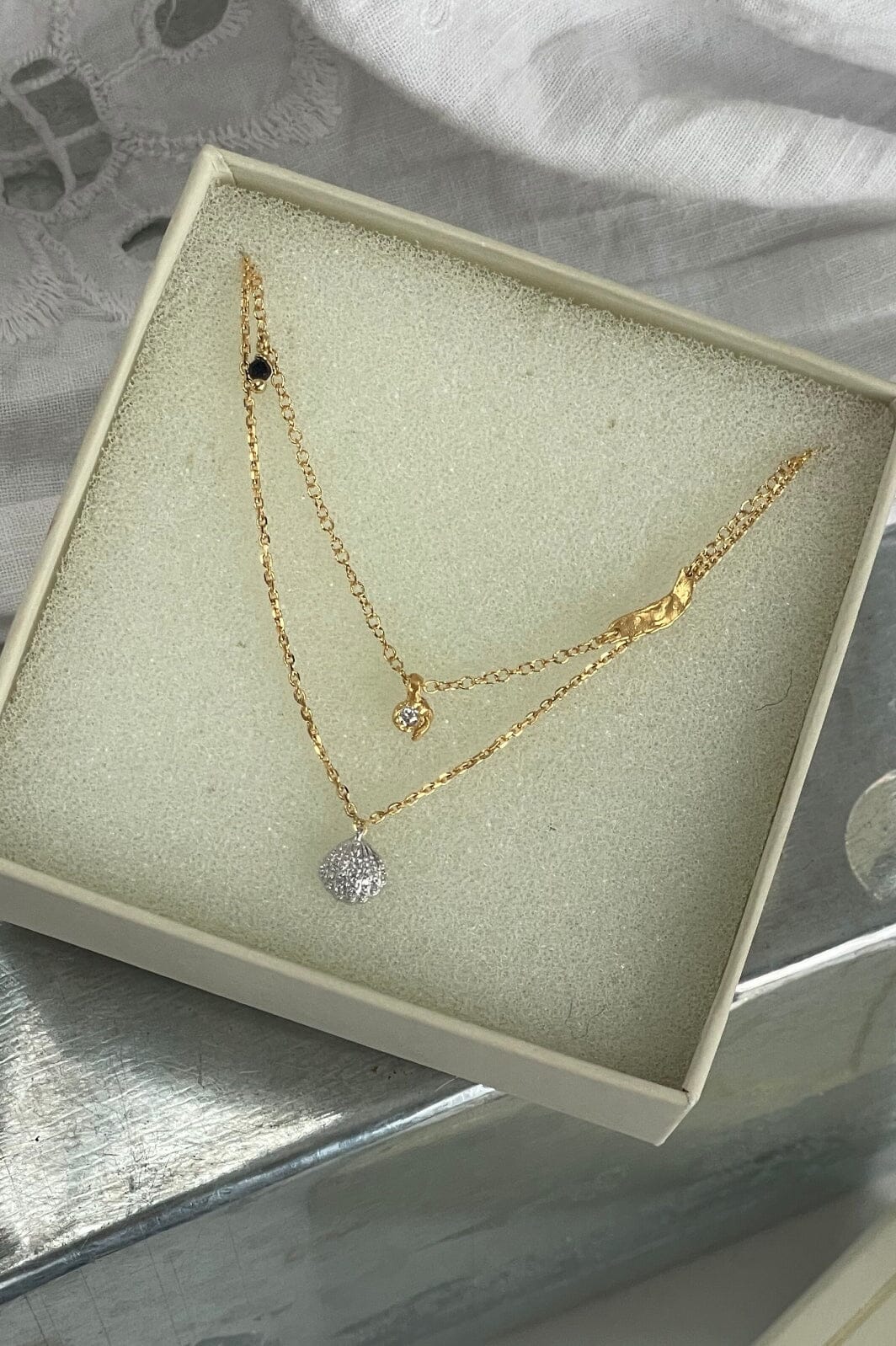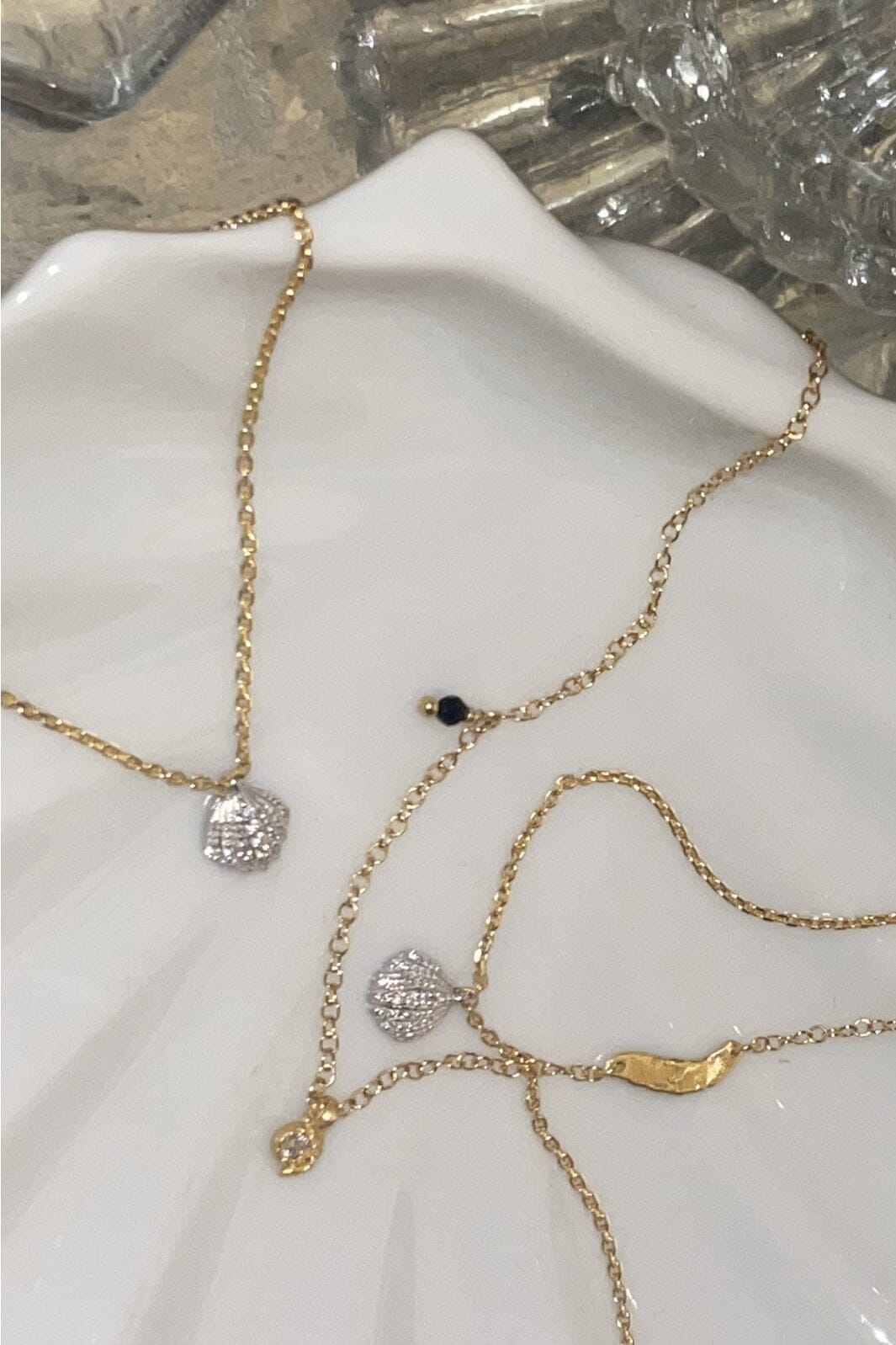 Nackkedja från Stine A med ett litet snäckvedhänge i detaljerad design. Kedjan kombinerar förgyllt och rent sterlingsilver, och hängsmycket visar olika bokstäver beroende på position.