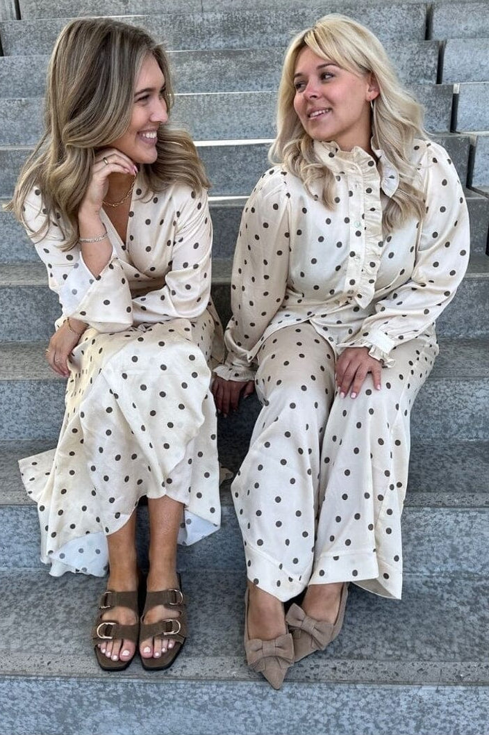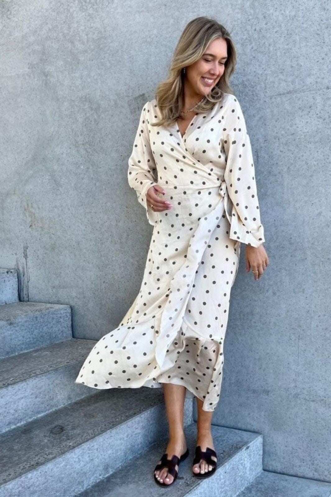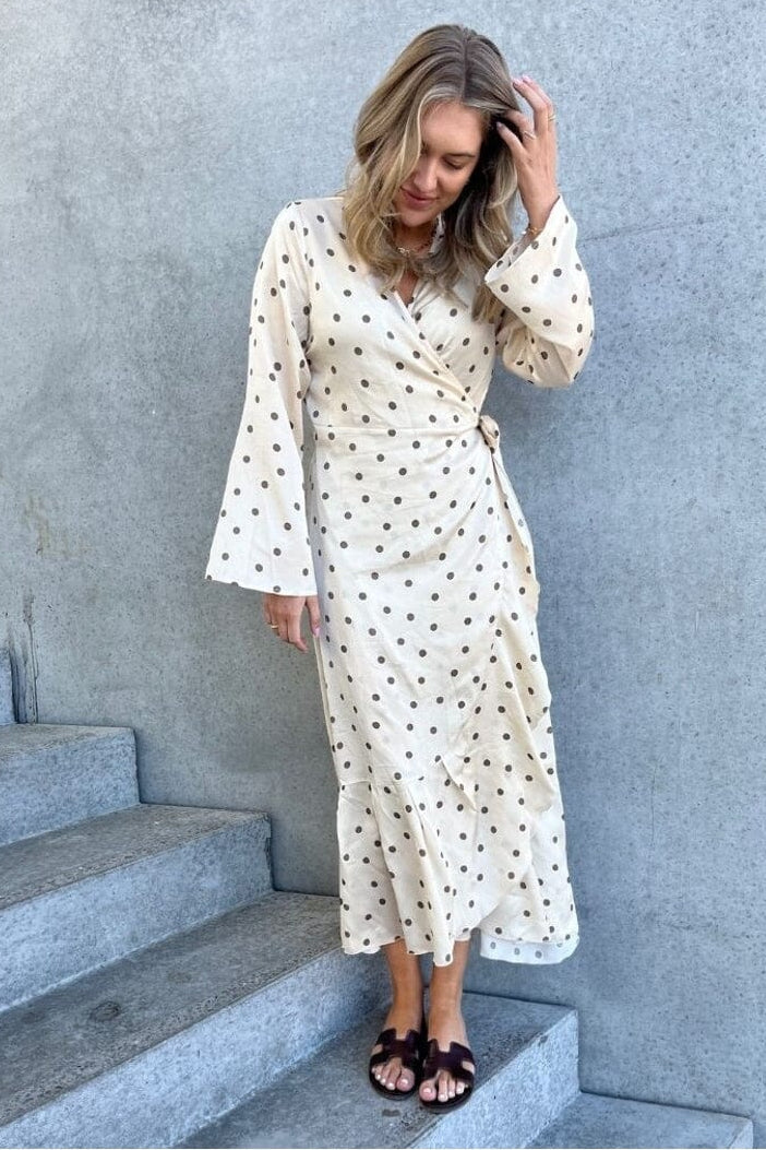 Klänning från Stories From The Atelier By Copenhagen Shoes i offwhite med bruna prickar. Klänningen har långa ärmar och en V-ringning med omlotteffekt.