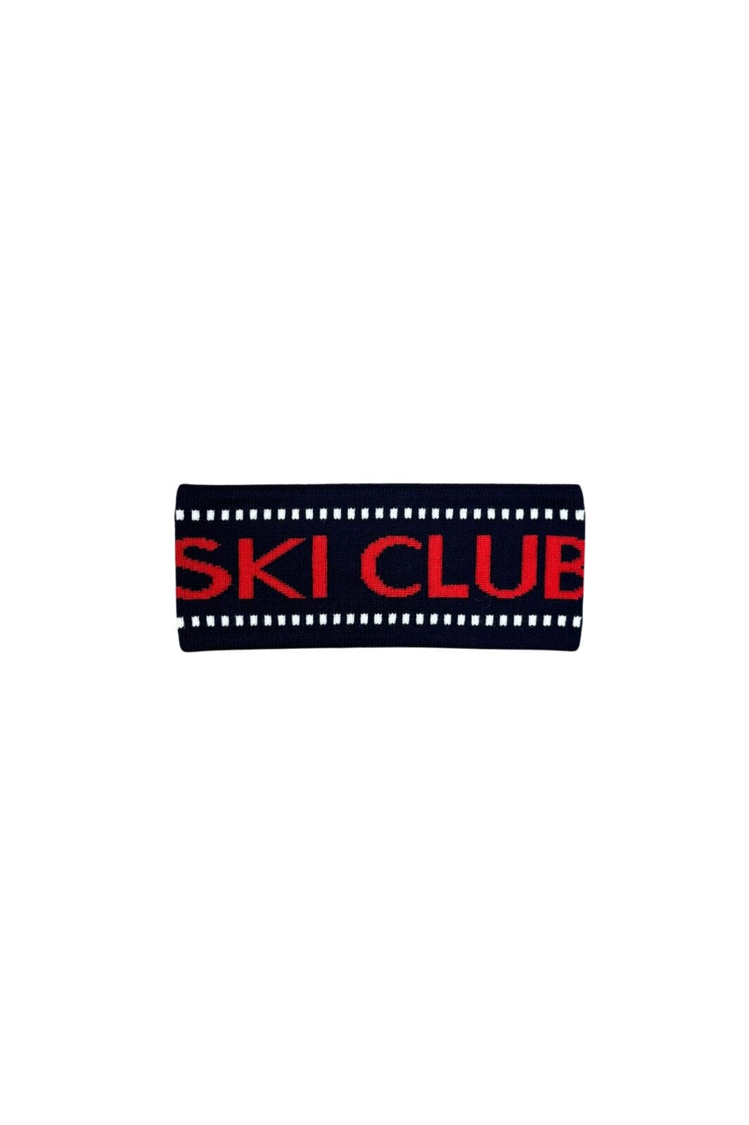 Pannband från Twist & Tango i mörkblå färg, tillverkat av extra fin merinoull. Designat för vinteraktiviteter med en jacquardstickad skidklubbslogotyp.