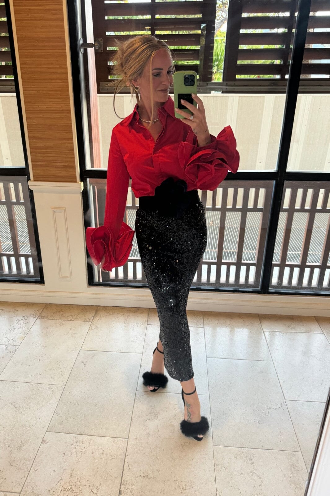 Svart kjol från Valentin Studio med paljetter. Den har hög midja och når till mitten av vaden. Paljetterna skapar ett glänsande uttryck på den enfärgade ytan.