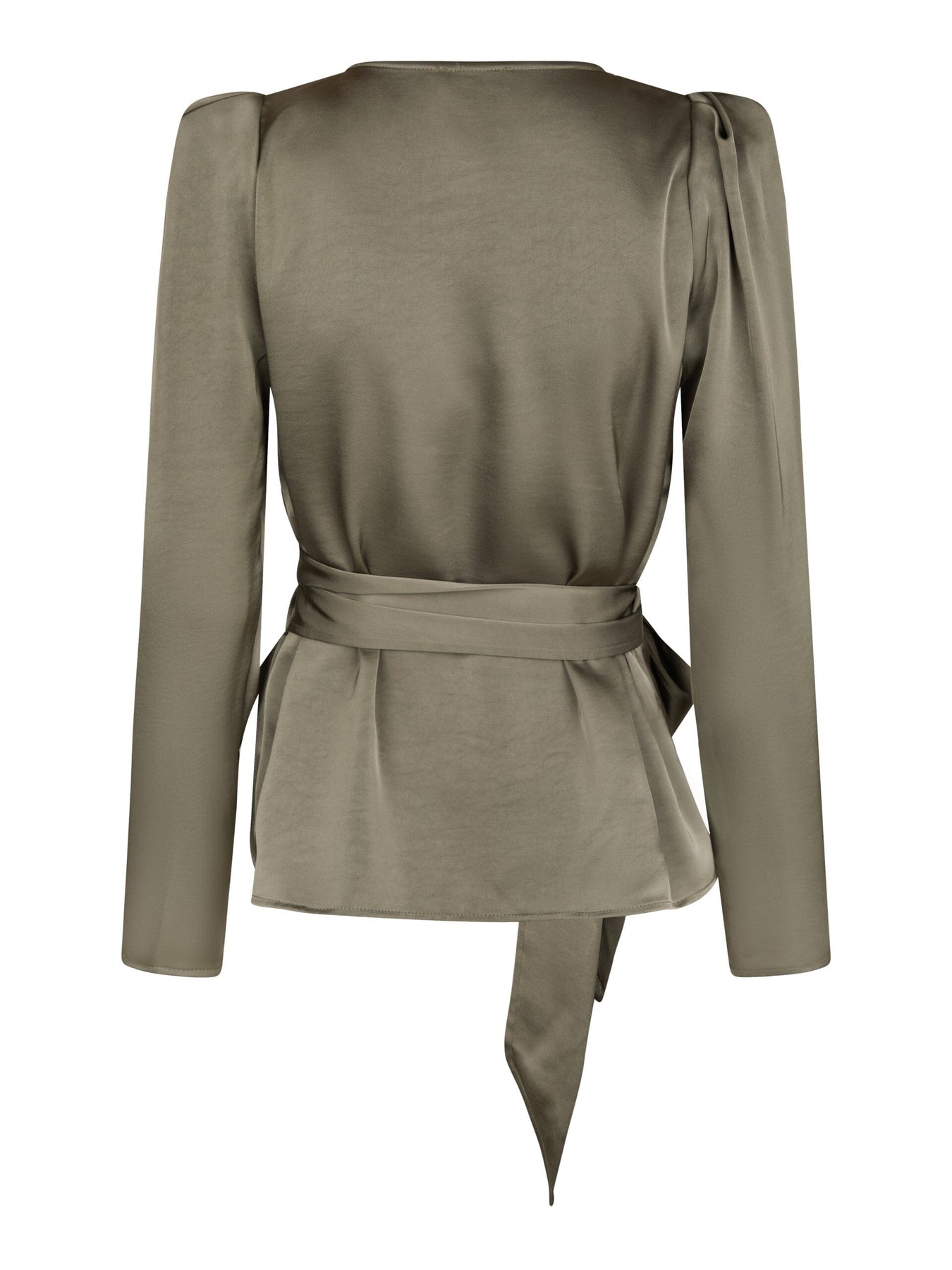 Blus från Valentin Studio, tillverkad i tung satin i en khakigrön nyans. Blusen har en omlottdesign med knytband i sidan och puffärmar.