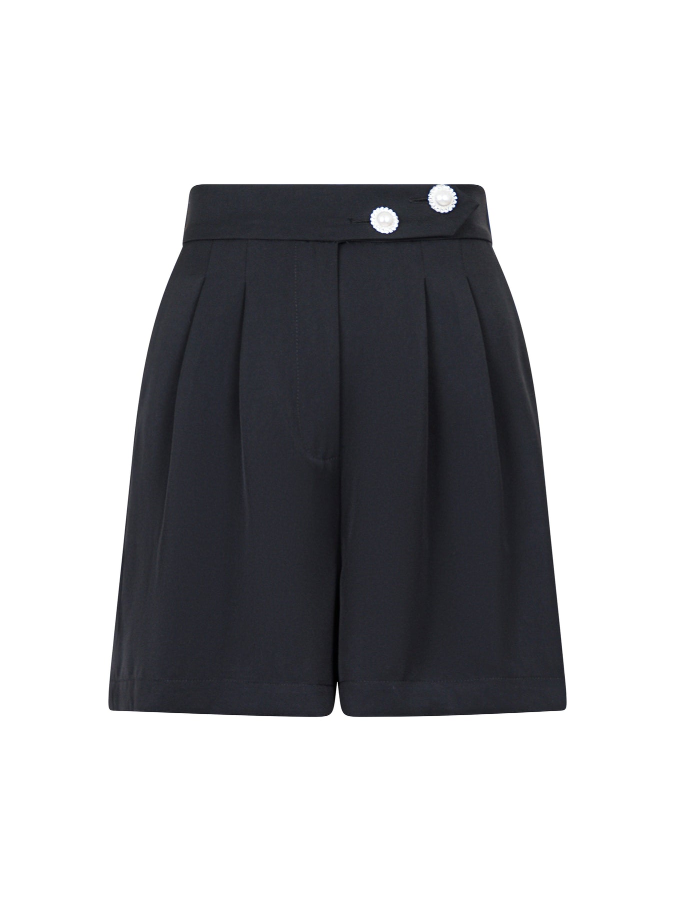 Svarta shorts från Valentin Studio med hög midja och lös passform. Shorts har dekorativa pärldetaljer och knappar som ger en extra touch till designen.