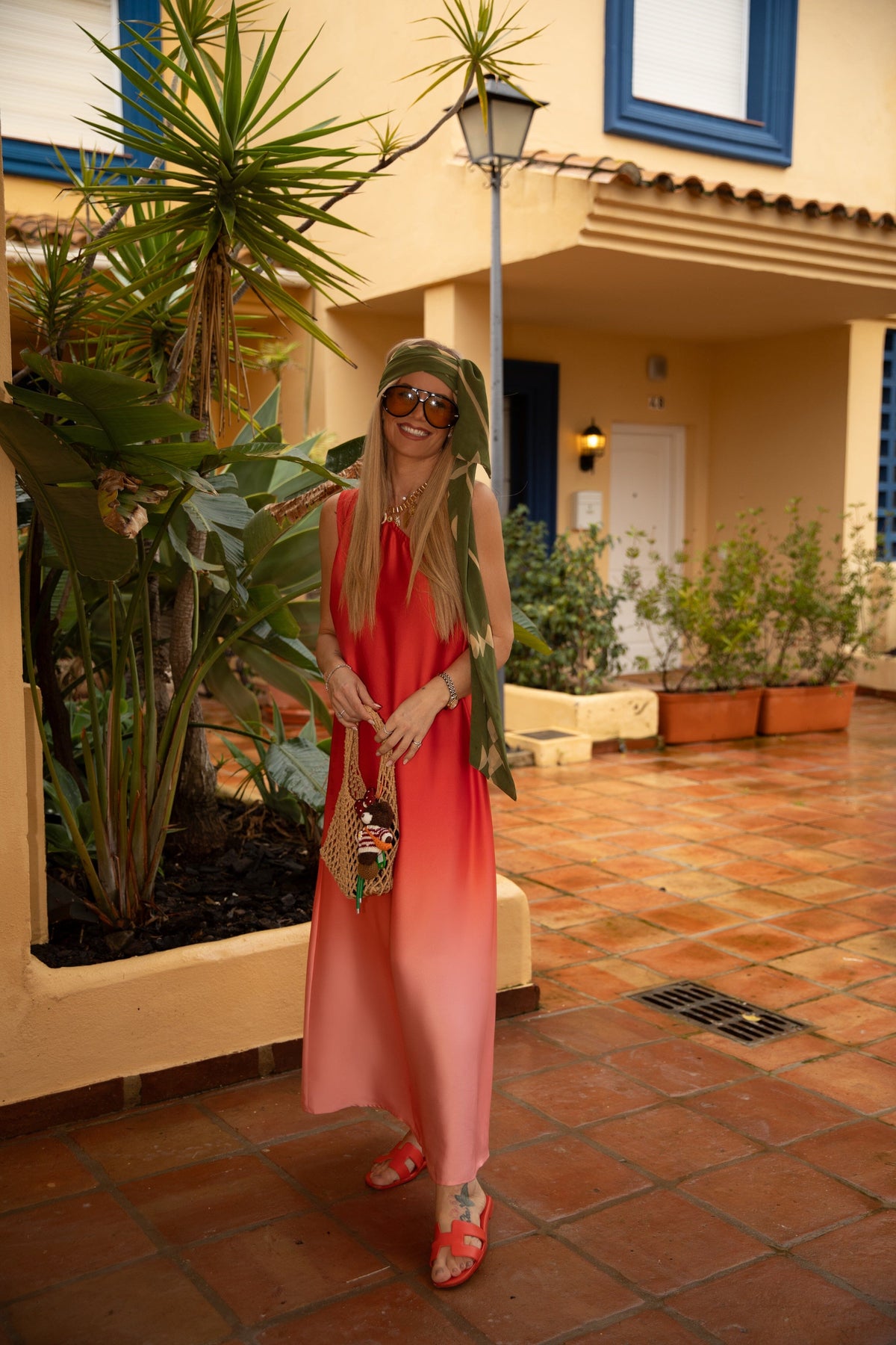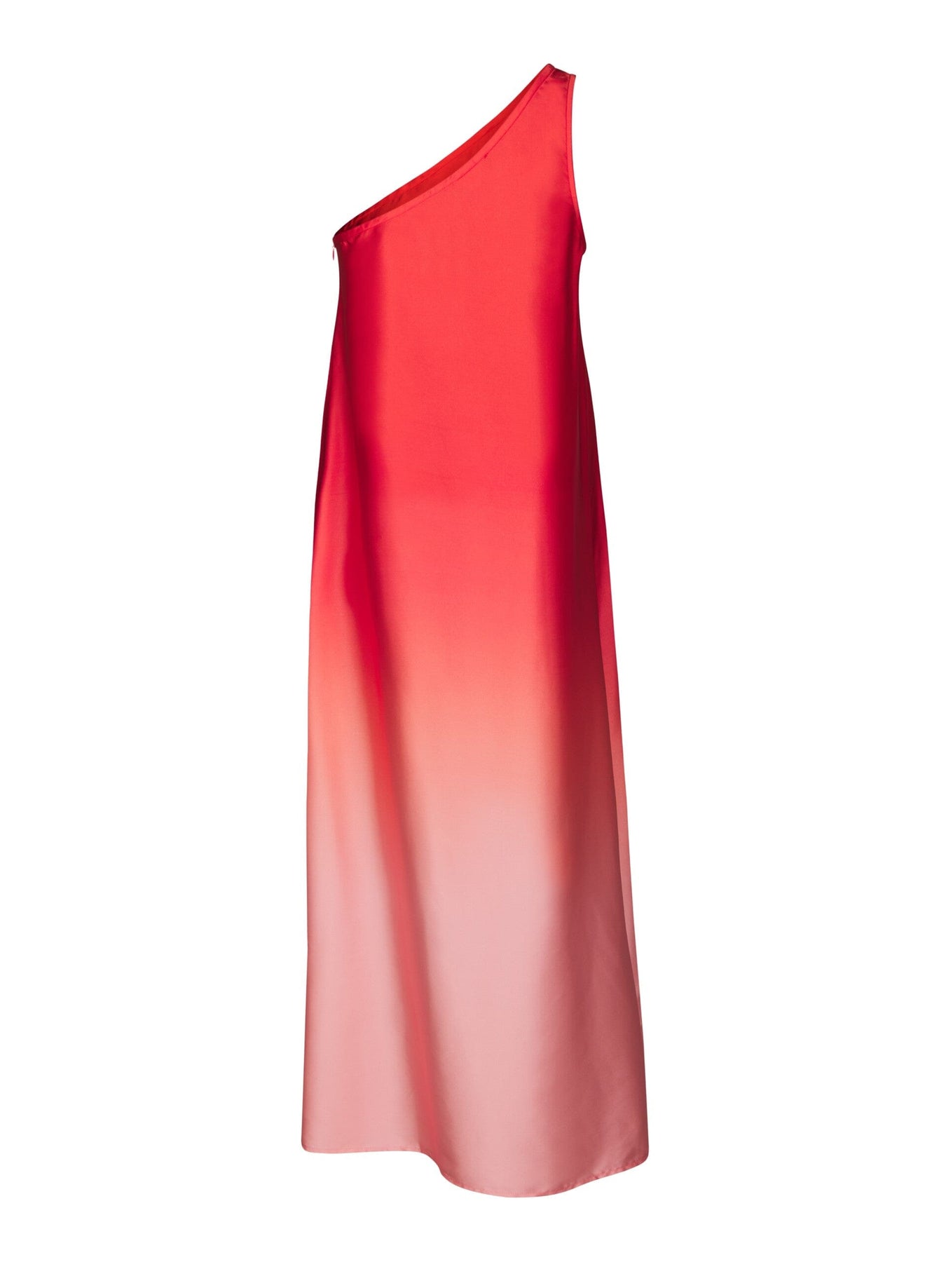 Röd klänning från Valentin Studio med ombre-färgövergång och off-shoulder-design. Klänningen är ankellång och har en lös passform.