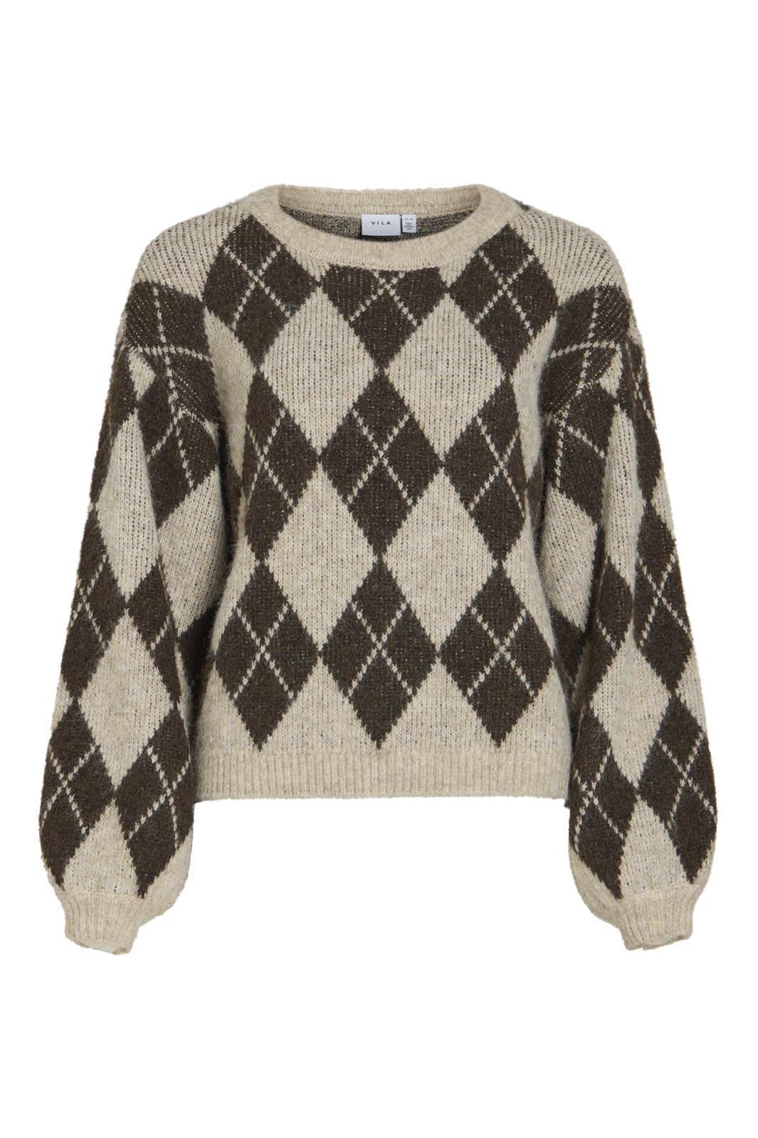Stickad tröja från Vila med argyle-mönster i mörkbrunt och beige. Tröjan har en rund halsringning och långa ärmar med lätt puffad form.