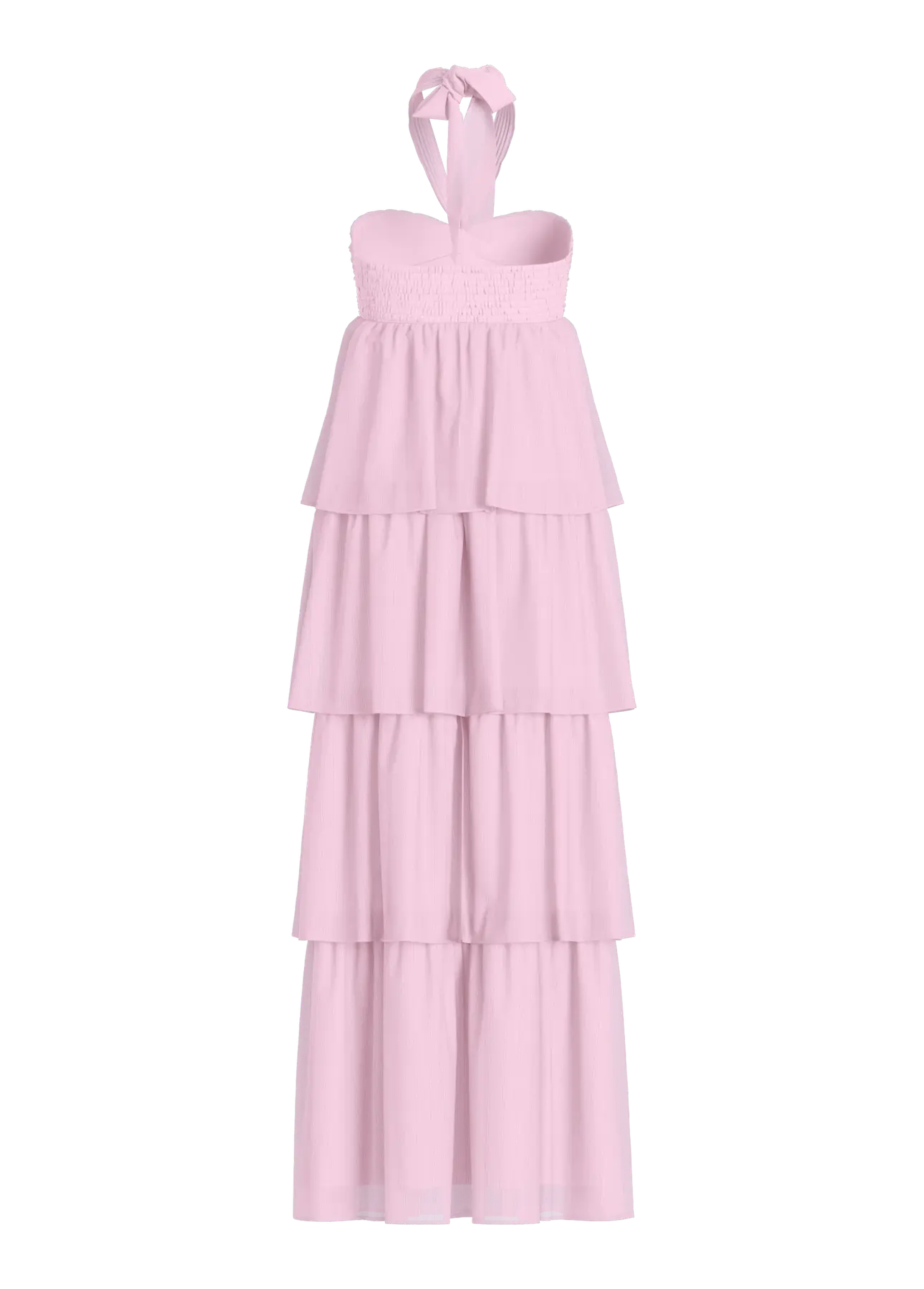Rosa golvlång klänning från Vila med halterneck och volanglager. Klänningen har en lös passform och knyts i nacken med ett band, medan ryggen har en elastisk detalj upptill.