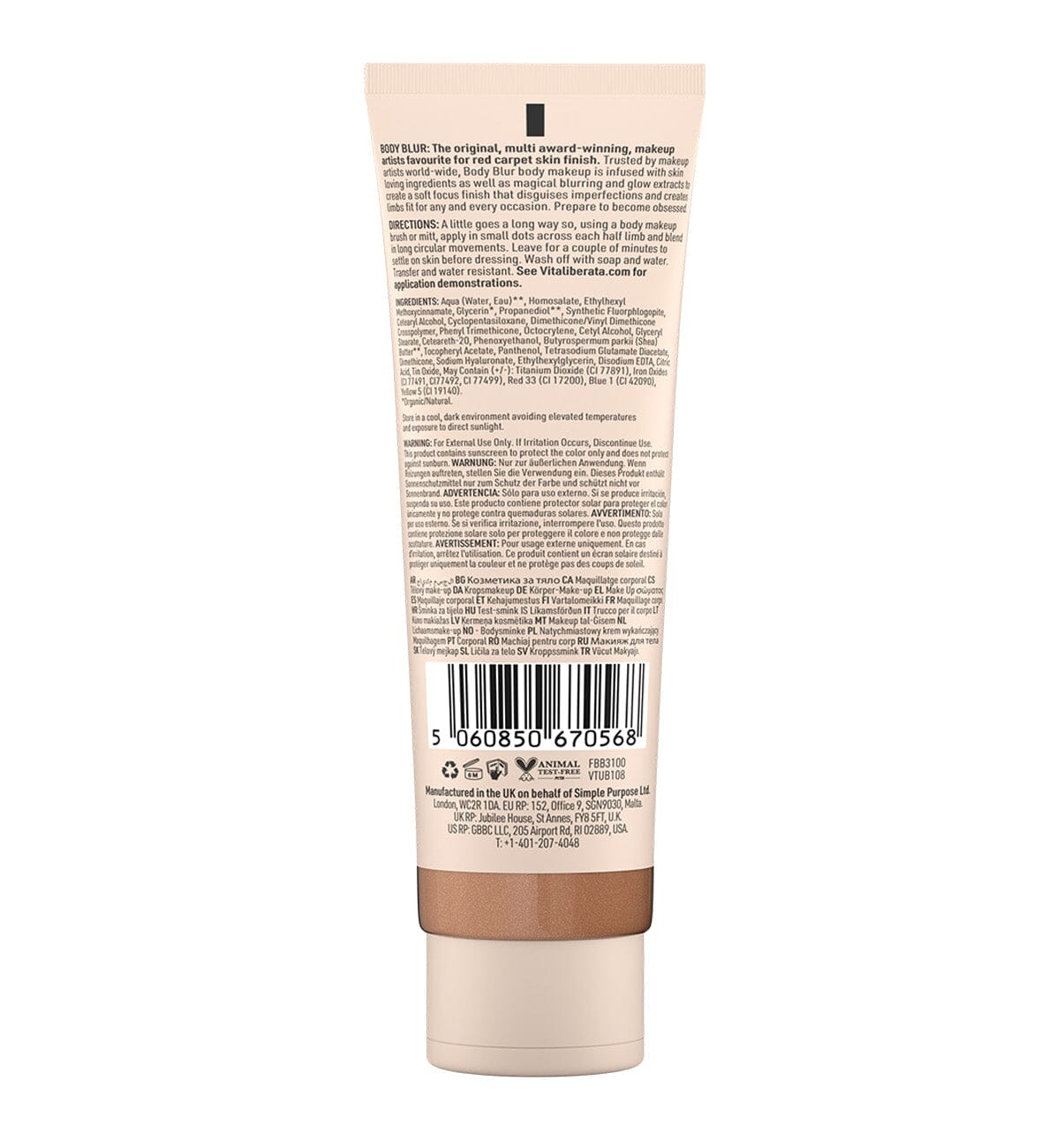 Kroppsmakeup från Vita Liberata med full täckning som döljer ojämnheter och ger huden en naturlig lyster. Produkten håller i 24 timmar och är inte en brun utan sol.