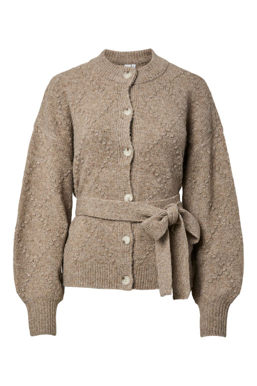 Stickad cardigan från Y.A.S i bruna och beige nyanser. Den har rund halsringning, knappstängning fram och ett stickat bälte i midjan.